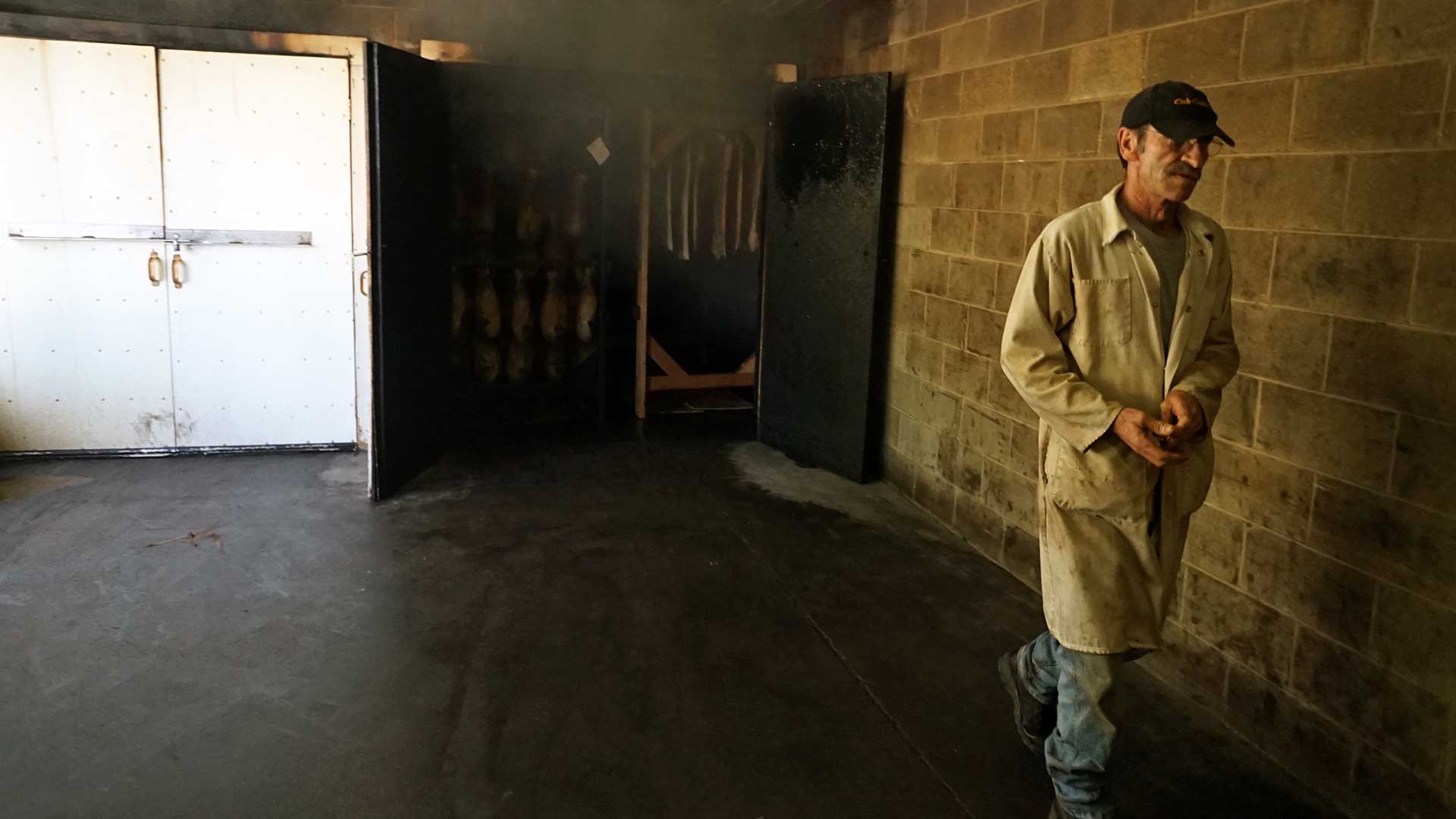 Soon enough, I turn onto Route 411 and arrive at Benton’s. A man named Paul greets me. He has an unruly, soup-strainer ‘stache, and wears a camouflage sweatshirt under his butcher’s apron, as well as a hunter-orange baseball hat. (Make up your mind, Paul: Do you want to be seen or don’t you?) He’s a natural-born rule-breaker, and immediately agrees to let me back into the curing rooms and the smokehouse.
