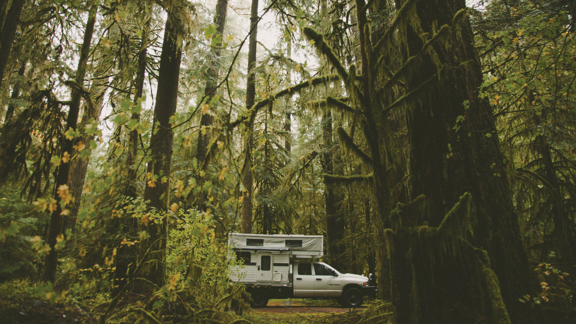 When I’ve chased out the game trails nearest the truck, I take to the forest road that brought us here. I walk an hour out, and an hour back, the air thick with the smell of water and soil, and little else. I’m soaked through when I return, despite my water-shedding layers. I walk up the steps, open the door, and stand on our green welcome matt, shedding layers. Kiddo’s sound machine churns on the upper bunk, and I can hear her tiny snores over the patter of fat drops on the camper’s aluminum roof.