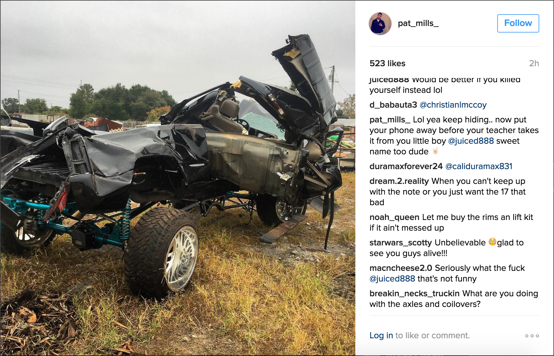 Thankfully, both he and his friend made it out alive, although not unscathed. However, posting the images to Instagram left Pat and his truck vulnerable to a barrage of comments he may not have anticipated.