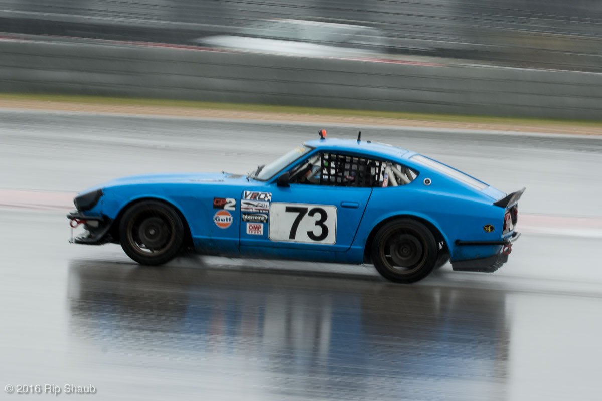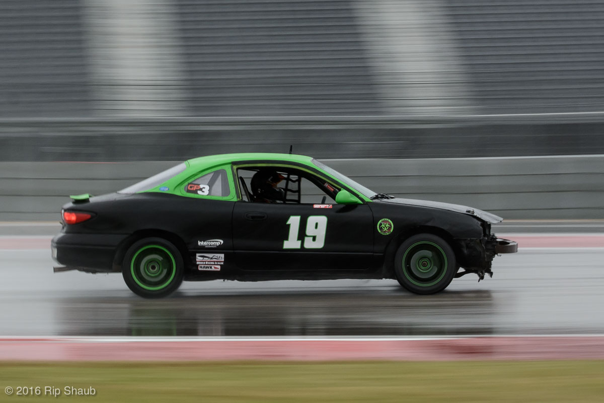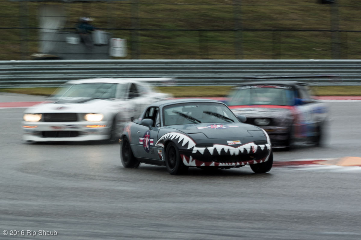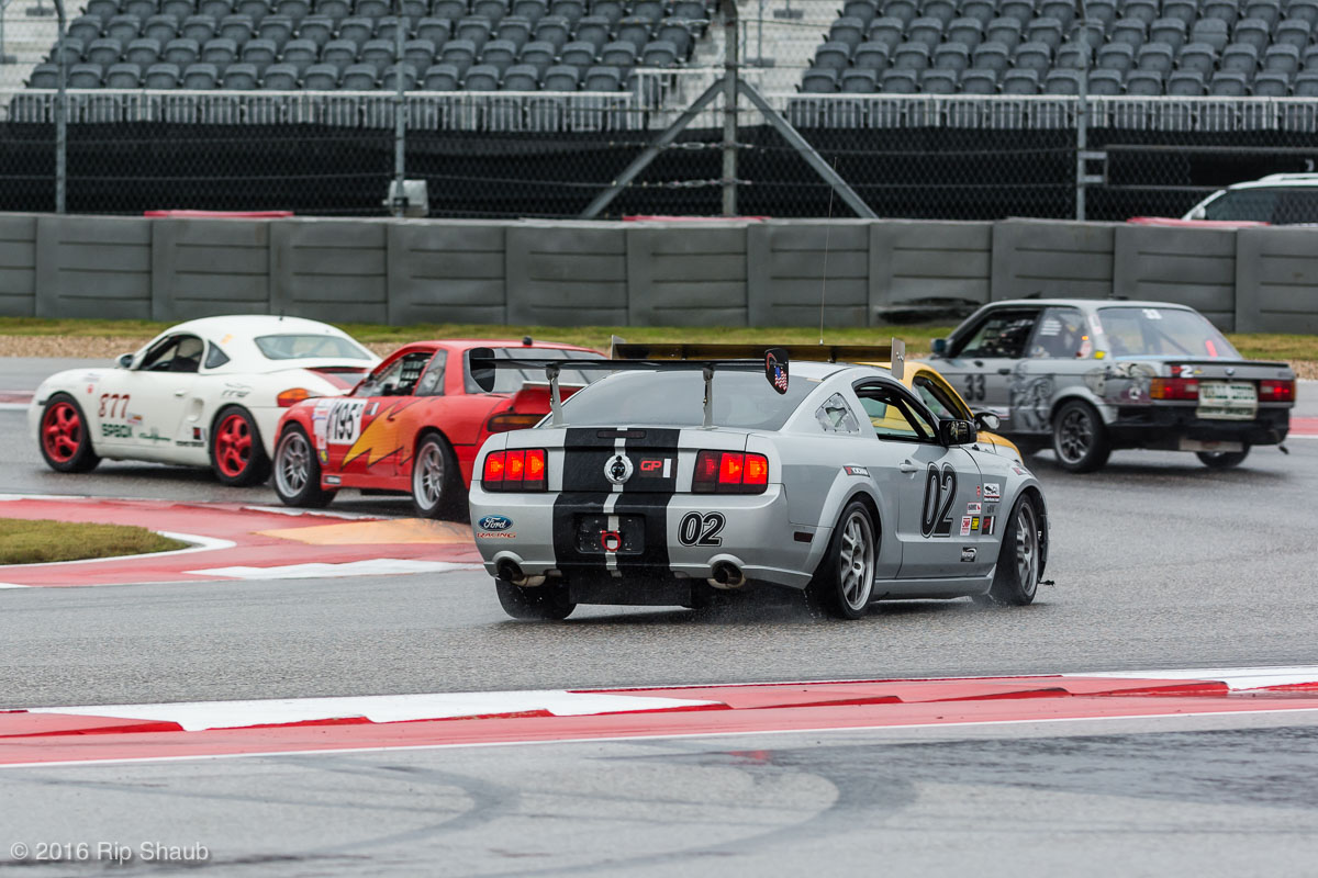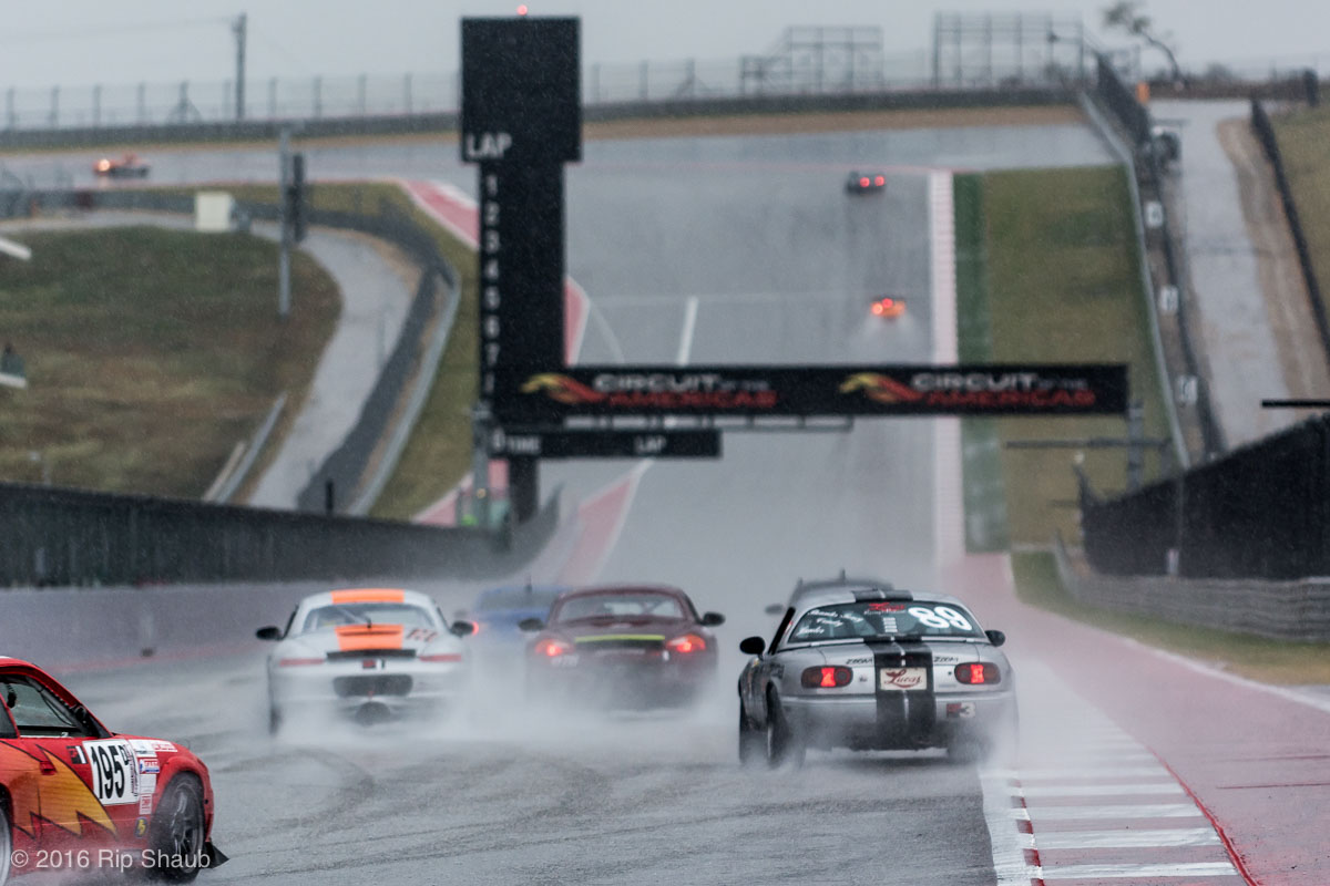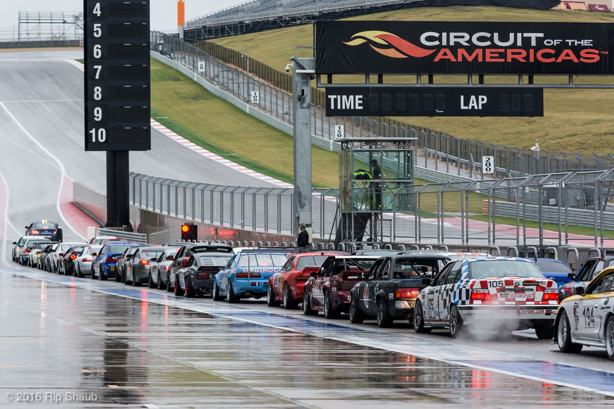 Saturday's grid features an eclectic mix of cars in 5 racing classes. Class is determined by the entry's power to weight ratio. GP1 for the highest rated to GP4 for the lowest. The additional GPX class featured 3 cars whose power exceeds the top class but were cleared to participate.While the grid waits for a break in the rain to get started, drivers find ways to keep the cars dry. The Steadfast Poorvette, and other open cockpit cars, tried hard to keep the cockpits comfortable before the start.Beanito Beandudo's 1970 Triumph TR6 from GP4 has the extra challenge of avoiding overheating while waiting to get underway. The car was ultimately fine and survived to finish both days.Vess Motorsports brought this BMW M235ir that competed in GPX. Conditions were soupy all weekend, but the BMW had no problem slicing through the heaviest rain. The 72 car was the overall leader, completing 145 laps on Saturday and 147 on Sunday.McNeil Motorsports Toyota Celupra hybrid brought amusement and bewilderment each time it passed. They went on to complete 120 laps on Saturday before recording a DNF.Cool G Racing brought this terrific looking 1972 Datsun 240Z to COTA. They completed both days' enduros in style.Roadkill Racing's 1997 Miata heads for Turn 10. The GP3 class is mostly Miatas, and WRL is working on a partnership to bring the SuperMiata series to the eastern part of the US.The mixed classes mean plenty of passing during the races. Here, five cars crowd into the tight confines of Turn 15 on Saturday.SCR Performance's 2013 Subaru BRZ finished 3rd in class on Saturday, but did not compete on Sunday.Outside the garages were countless fuel jugs all weekend. Rules prohibit storage of fuel in the garages and that means a constant shuffling of full and empty jugs from the paddock to pit lane.RRW Motorsports Miata recorded a DNF both days, but not before completing 237 laps over the weekend. Here the shark attacks Turn 11 with ferocity.The weekend's other BMW M235 plows through some of the heaviest rain on Saturday. This car went on to record the fastest lap time of the weekend in Sunday's racing and finished second in GPX to its teammate on both days.EcoBooze's '89 Fox-body Mustang finished 1st in GP4 Class on Saturday and 4th on Sunday. Here it throws lots of spray as it enters the main straight fresh out of Turn 20.Al Mallory Racing's 2008 Corvette finished 5th in GP1 on Saturday, but DNF on Sunday after 7 hours and 125 laps.The rain slowed for a for a few minutes, but the conditions were still soaking wet mid-day Saturday. A crowd launches out of Turn 20 and heads down the main straight and up the hill into Turn 1.Z-Ya's 1973 Datsun 240Z streaks through one of the wetter parts of the stadium section of the track.The flat black of the Poorvette's rear clip absorbs light like a black hole on an already gloomy day. It leans hard in Turn 15 on its way to win the GP2 class on Sunday.Endurance racing means frequent pit stops for fuel and driver changes. These aren't the frenzied and choreographed pits of F1 but still provide an energetic interlude from the on-track action.Lemonata Racing's 1990 Miata sported a Sprint Car-like panel over the cockpit, providing a measure of relief from the rain. They went on to finish 3rd in GP4 on both days.RennsportKC's 2008 Mustang was a DNF on Saturday, but bounced back to win GP1 Class in Sunday's race.White Lightning's 1994 Miata spits a little flame as it heads for Turn 3. It's the only Miata that competedin the quicker GP2 class and finished 5th in class Sunday after a DNF on Saturday.With all-day racing, garages are as much apartments as workshops. Teams share space with four cars per garage and things can get cramped quickly. Fortunately camaraderie among teams prevails throughout the weekend.Huskers1's Miata had a strong showing, placing 3rd on Saturday and 2nd on Sunday in the GP3 class.Skid Marks Racing's Nissan 350Z takes it's turn through the wetness betweens Turn 12 and 13. They finished with 133 laps on Saturday, but had a DNF on Sunday after 3 hours on the track.Mid-race and between-race repairs were, at times, major. Engine swaps and body part replacements happened along top-end rebuilds and suspension repairs. Bucket List Racing's Boxster would succumb and was a DNF on both days, but not after logging over 11 hours on the track and more than 650 miles.The Sector Purple and Minions In Charge Miatas race up the short hill to Turn 9 on Sunday. Sector Purple took 2nd in GP3 on Saturday.The Vess M235ir again. Normally's Austin's skyline would be visible in the distance, but the gloom messed with COTA's traditional views the city. The 72 car was 8 short of logging 1000 miles of racing for the weekend.The Laminar Racing Miata won the GP3 class both days, en route to becoming the 2016 season's US Endurance Champion. Drivers logged more than 15 and a half hours racing for 940 miles.Team LMR's BMW 328i shows us just how gloomy the skies were in Austin on Saturday. They didn't feel the effects much, though, finishing 2nd in GP1 on Saturday and 3rd on Sunday. The other LMR entry, another 325i which was 15 years older, fell victim to a blown engine halfway through Saturday. The team was prepared to swap the engine overnight, but a suitable replacement couldn't be secured in time.OHWOWRacing illustrates how knolling is an essential part of any good shop work as they tackle the top end of their Mustang's engine. They completed 45 laps on Saturday before hitting trouble, and only completed an hour on Sunday before recording their second DNF.Zombie Response's Ford Escort Zx2 looks as if it mowed down a pack of the undead on the back straight. The zombies got the best of it after almost 6 hours on Saturday, but the team and car recovered to finish Sunday's race.Team McQueen brought a pair of Nissan 240SX entries to the track and they finished 3rd and 5th in class on Saturday. Both cars failed to complete the race on Sunday, with this #95 one falling just a half hour short of