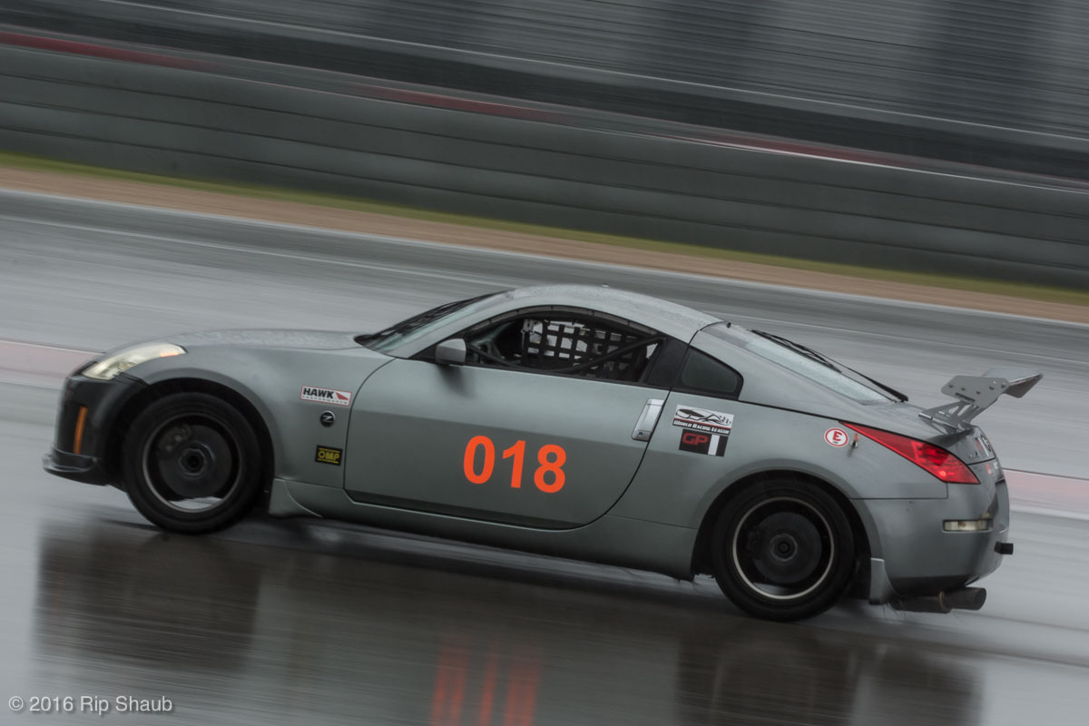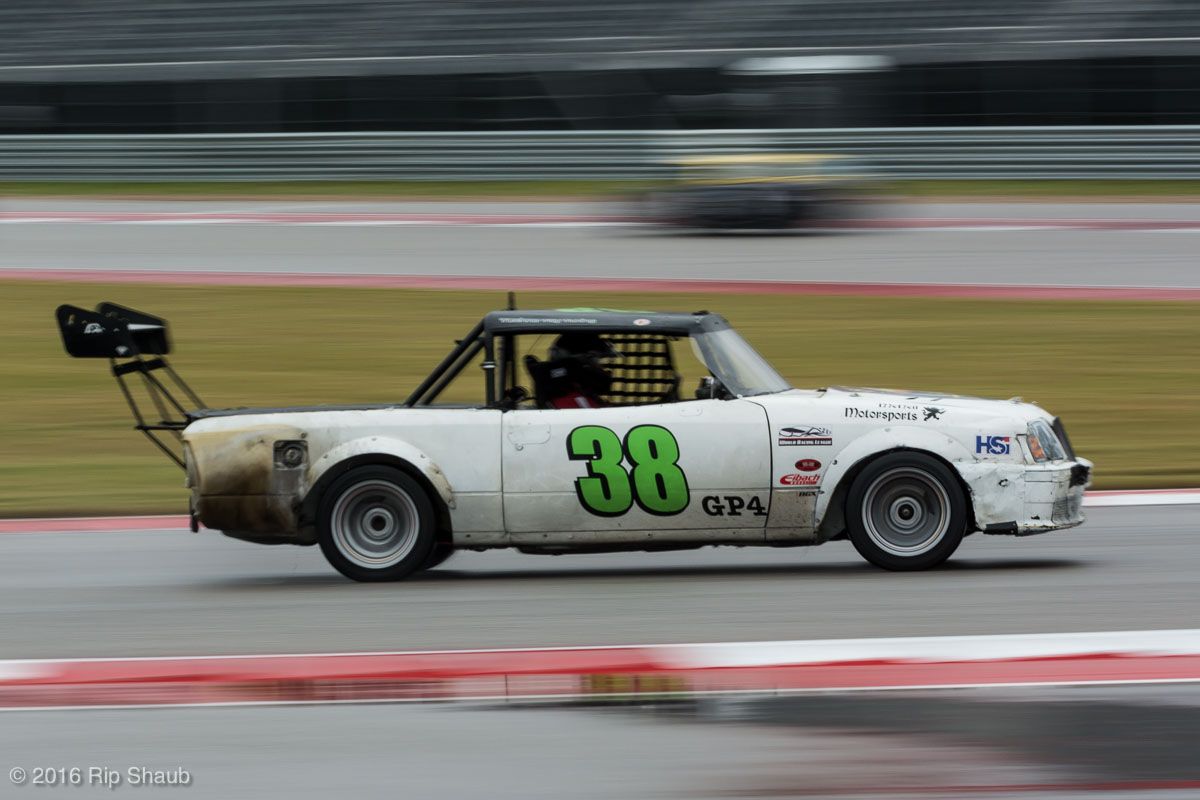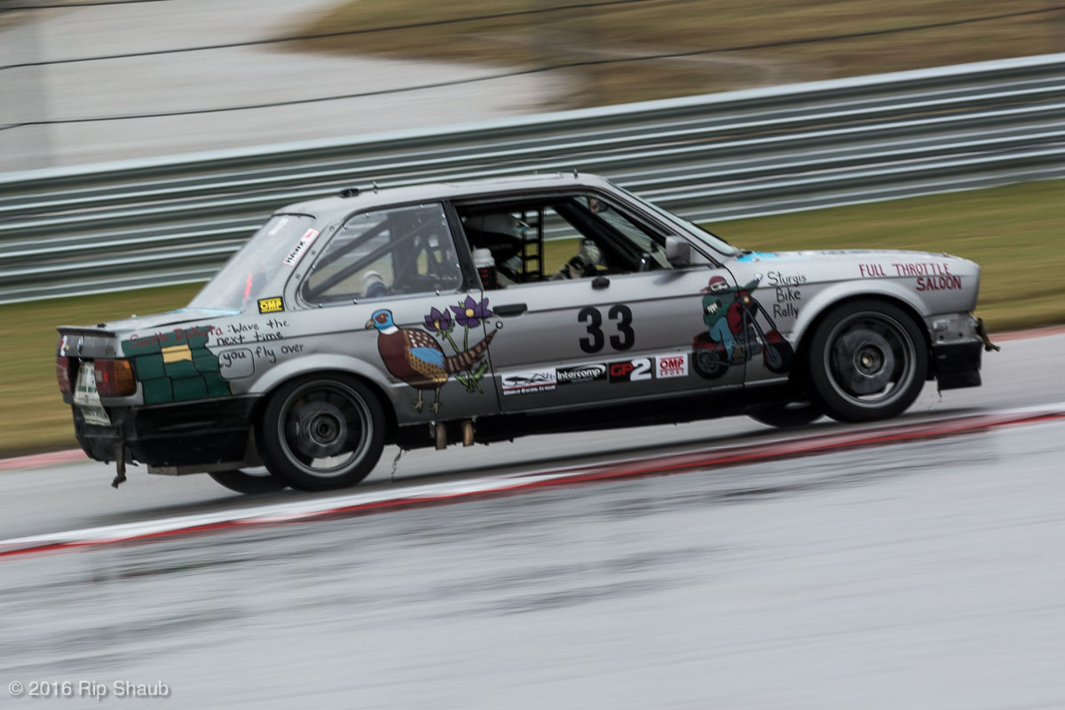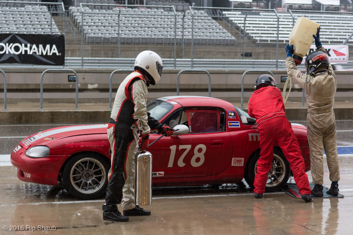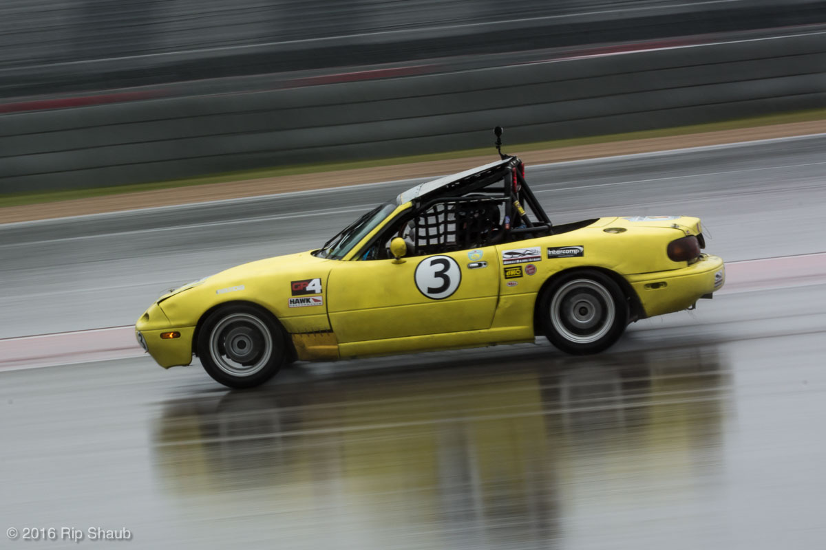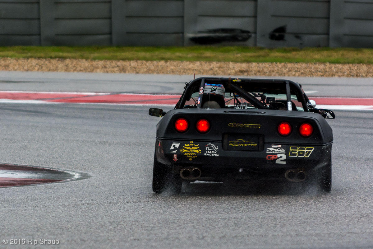 Saturday's grid features an eclectic mix of cars in 5 racing classes. Class is determined by the entry's power to weight ratio. GP1 for the highest rated to GP4 for the lowest. The additional GPX class featured 3 cars whose power exceeds the top class but were cleared to participate.While the grid waits for a break in the rain to get started, drivers find ways to keep the cars dry. The Steadfast Poorvette, and other open cockpit cars, tried hard to keep the cockpits comfortable before the start.Beanito Beandudo's 1970 Triumph TR6 from GP4 has the extra challenge of avoiding overheating while waiting to get underway. The car was ultimately fine and survived to finish both days.Vess Motorsports brought this BMW M235ir that competed in GPX. Conditions were soupy all weekend, but the BMW had no problem slicing through the heaviest rain. The 72 car was the overall leader, completing 145 laps on Saturday and 147 on Sunday.McNeil Motorsports Toyota Celupra hybrid brought amusement and bewilderment each time it passed. They went on to complete 120 laps on Saturday before recording a DNF.Cool G Racing brought this terrific looking 1972 Datsun 240Z to COTA. They completed both days' enduros in style.Roadkill Racing's 1997 Miata heads for Turn 10. The GP3 class is mostly Miatas, and WRL is working on a partnership to bring the SuperMiata series to the eastern part of the US.The mixed classes mean plenty of passing during the races. Here, five cars crowd into the tight confines of Turn 15 on Saturday.SCR Performance's 2013 Subaru BRZ finished 3rd in class on Saturday, but did not compete on Sunday.Outside the garages were countless fuel jugs all weekend. Rules prohibit storage of fuel in the garages and that means a constant shuffling of full and empty jugs from the paddock to pit lane.RRW Motorsports Miata recorded a DNF both days, but not before completing 237 laps over the weekend. Here the shark attacks Turn 11 with ferocity.The weekend's other BMW M235 plows through some of the heaviest rain on Saturday. This car went on to record the fastest lap time of the weekend in Sunday's racing and finished second in GPX to its teammate on both days.EcoBooze's '89 Fox-body Mustang finished 1st in GP4 Class on Saturday and 4th on Sunday. Here it throws lots of spray as it enters the main straight fresh out of Turn 20.Al Mallory Racing's 2008 Corvette finished 5th in GP1 on Saturday, but DNF on Sunday after 7 hours and 125 laps.The rain slowed for a for a few minutes, but the conditions were still soaking wet mid-day Saturday. A crowd launches out of Turn 20 and heads down the main straight and up the hill into Turn 1.Z-Ya's 1973 Datsun 240Z streaks through one of the wetter parts of the stadium section of the track.The flat black of the Poorvette's rear clip absorbs light like a black hole on an already gloomy day. It leans hard in Turn 15 on its way to win the GP2 class on Sunday.Endurance racing means frequent pit stops for fuel and driver changes. These aren't the frenzied and choreographed pits of F1 but still provide an energetic interlude from the on-track action.Lemonata Racing's 1990 Miata sported a Sprint Car-like panel over the cockpit, providing a measure of relief from the rain. They went on to finish 3rd in GP4 on both days.RennsportKC's 2008 Mustang was a DNF on Saturday, but bounced back to win GP1 Class in Sunday's race.White Lightning's 1994 Miata spits a little flame as it heads for Turn 3. It's the only Miata that competedin the quicker GP2 class and finished 5th in class Sunday after a DNF on Saturday.With all-day racing, garages are as much apartments as workshops. Teams share space with four cars per garage and things can get cramped quickly. Fortunately camaraderie among teams prevails throughout the weekend.Huskers1's Miata had a strong showing, placing 3rd on Saturday and 2nd on Sunday in the GP3 class.Skid Marks Racing's Nissan 350Z takes it's turn through the wetness betweens Turn 12 and 13. They finished with 133 laps on Saturday, but had a DNF on Sunday after 3 hours on the track.Mid-race and between-race repairs were, at times, major. Engine swaps and body part replacements happened along top-end rebuilds and suspension repairs. Bucket List Racing's Boxster would succumb and was a DNF on both days, but not after logging over 11 hours on the track and more than 650 miles.The Sector Purple and Minions In Charge Miatas race up the short hill to Turn 9 on Sunday. Sector Purple took 2nd in GP3 on Saturday.The Vess M235ir again. Normally's Austin's skyline would be visible in the distance, but the gloom messed with COTA's traditional views the city. The 72 car was 8 short of logging 1000 miles of racing for the weekend.The Laminar Racing Miata won the GP3 class both days, en route to becoming the 2016 season's US Endurance Champion. Drivers logged more than 15 and a half hours racing for 940 miles.Team LMR's BMW 328i shows us just how gloomy the skies were in Austin on Saturday. They didn't feel the effects much, though, finishing 2nd in GP1 on Saturday and 3rd on Sunday. The other LMR entry, another 325i which was 15 years older, fell victim to a blown engine halfway through Saturday. The team was prepared to swap the engine overnight, but a suitable replacement couldn't be secured in time.OHWOWRacing illustrates how knolling is an essential part of any good shop work as they tackle the top end of their Mustang's engine. They completed 45 laps on Saturday before hitting trouble, and only completed an hour on Sunday before recording their second DNF.Zombie Response's Ford Escort Zx2 looks as if it mowed down a pack of the undead on the back straight. The zombies got the best of it after almost 6 hours on Saturday, but the team and car recovered to finish Sunday's race.Team McQueen brought a pair of Nissan 240SX entries to the track and they finished 3rd and 5th in class on Saturday. Both cars failed to complete the race on Sunday, with this #95 one falling just a half hour short of