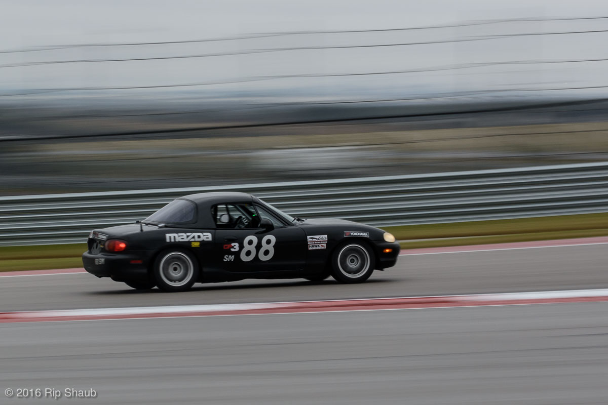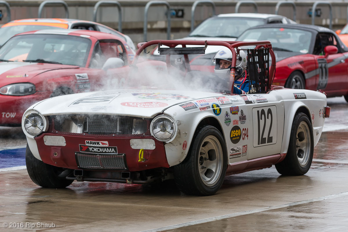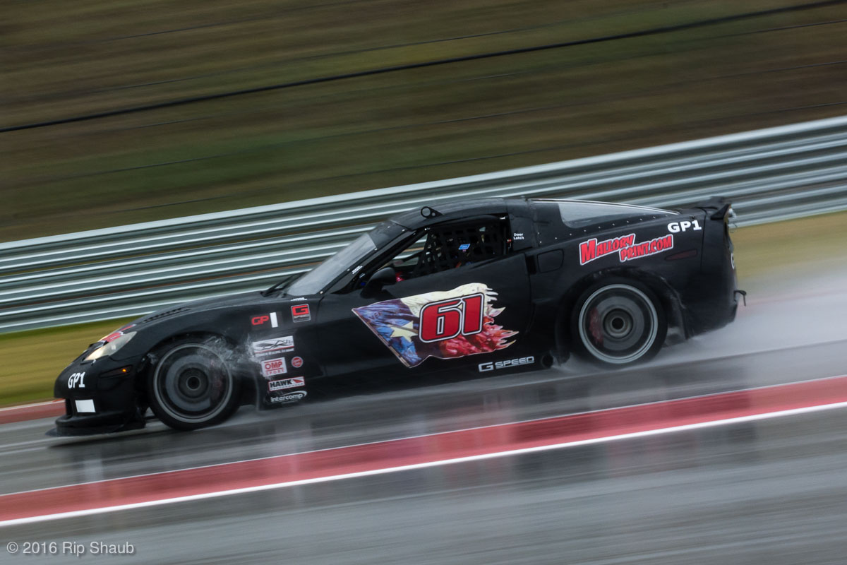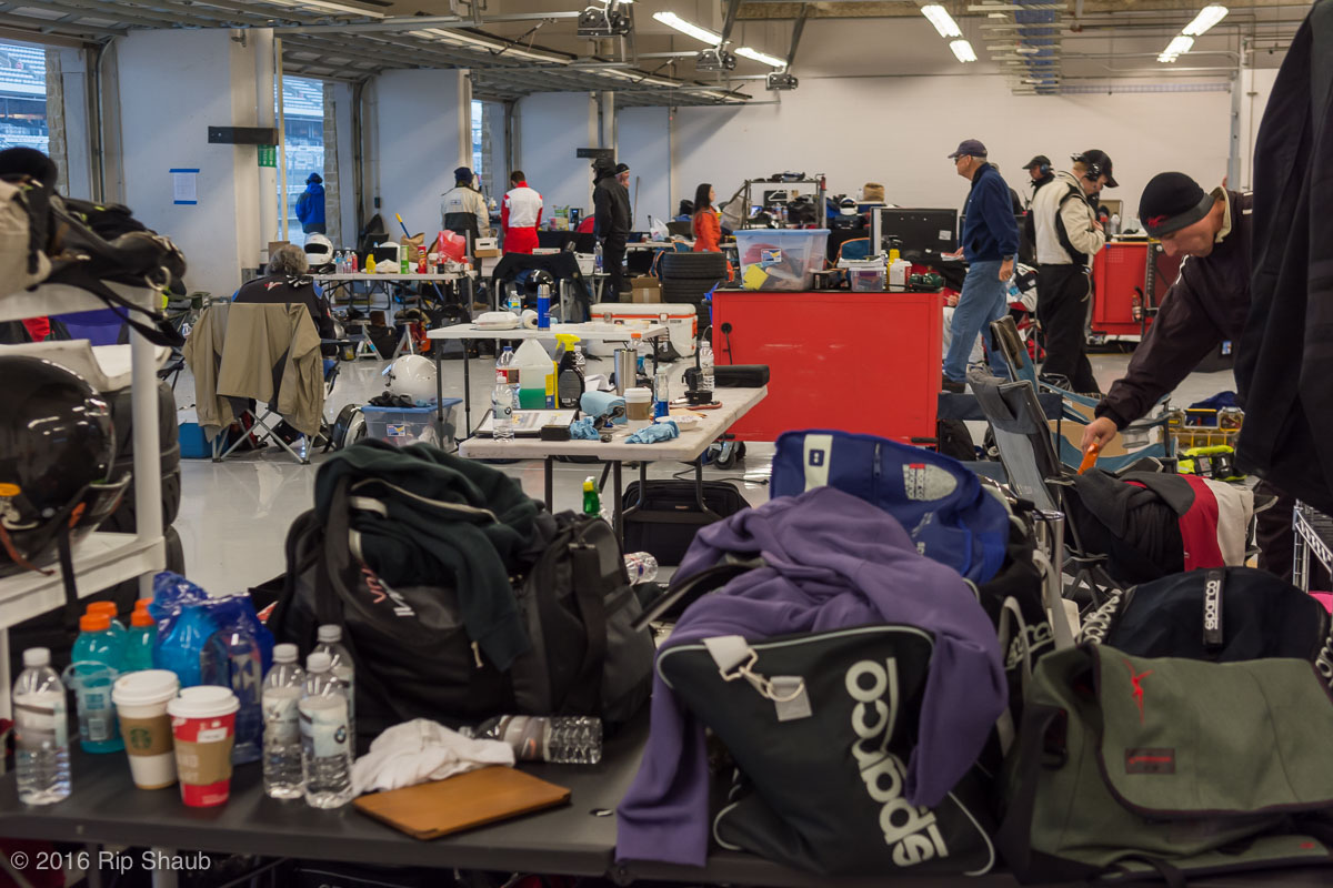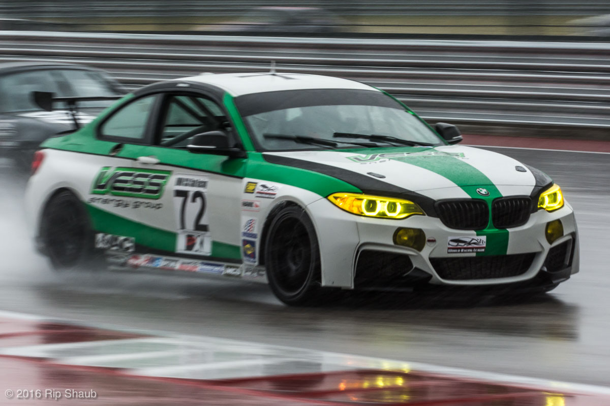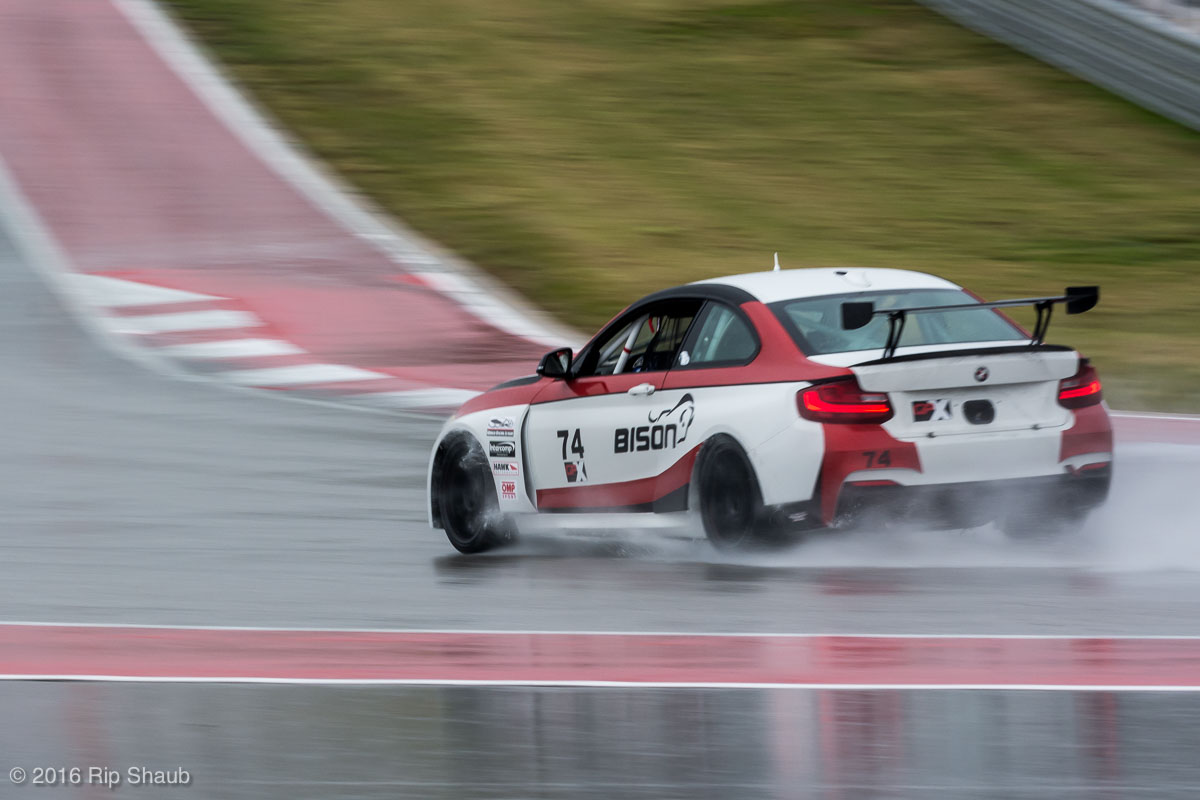Saturday's grid features an eclectic mix of cars in 5 racing classes. Class is determined by the entry's power to weight ratio. GP1 for the highest rated to GP4 for the lowest. The additional GPX class featured 3 cars whose power exceeds the top class but were cleared to participate.While the grid waits for a break in the rain to get started, drivers find ways to keep the cars dry. The Steadfast Poorvette, and other open cockpit cars, tried hard to keep the cockpits comfortable before the start.Beanito Beandudo's 1970 Triumph TR6 from GP4 has the extra challenge of avoiding overheating while waiting to get underway. The car was ultimately fine and survived to finish both days.Vess Motorsports brought this BMW M235ir that competed in GPX. Conditions were soupy all weekend, but the BMW had no problem slicing through the heaviest rain. The 72 car was the overall leader, completing 145 laps on Saturday and 147 on Sunday.McNeil Motorsports Toyota Celupra hybrid brought amusement and bewilderment each time it passed. They went on to complete 120 laps on Saturday before recording a DNF.Cool G Racing brought this terrific looking 1972 Datsun 240Z to COTA. They completed both days' enduros in style.Roadkill Racing's 1997 Miata heads for Turn 10. The GP3 class is mostly Miatas, and WRL is working on a partnership to bring the SuperMiata series to the eastern part of the US.The mixed classes mean plenty of passing during the races. Here, five cars crowd into the tight confines of Turn 15 on Saturday.SCR Performance's 2013 Subaru BRZ finished 3rd in class on Saturday, but did not compete on Sunday.Outside the garages were countless fuel jugs all weekend. Rules prohibit storage of fuel in the garages and that means a constant shuffling of full and empty jugs from the paddock to pit lane.RRW Motorsports Miata recorded a DNF both days, but not before completing 237 laps over the weekend. Here the shark attacks Turn 11 with ferocity.The weekend's other BMW M235 plows through some of the heaviest rain on Saturday. This car went on to record the fastest lap time of the weekend in Sunday's racing and finished second in GPX to its teammate on both days.EcoBooze's '89 Fox-body Mustang finished 1st in GP4 Class on Saturday and 4th on Sunday. Here it throws lots of spray as it enters the main straight fresh out of Turn 20.Al Mallory Racing's 2008 Corvette finished 5th in GP1 on Saturday, but DNF on Sunday after 7 hours and 125 laps.The rain slowed for a for a few minutes, but the conditions were still soaking wet mid-day Saturday. A crowd launches out of Turn 20 and heads down the main straight and up the hill into Turn 1.Z-Ya's 1973 Datsun 240Z streaks through one of the wetter parts of the stadium section of the track.The flat black of the Poorvette's rear clip absorbs light like a black hole on an already gloomy day. It leans hard in Turn 15 on its way to win the GP2 class on Sunday.Endurance racing means frequent pit stops for fuel and driver changes. These aren't the frenzied and choreographed pits of F1 but still provide an energetic interlude from the on-track action.Lemonata Racing's 1990 Miata sported a Sprint Car-like panel over the cockpit, providing a measure of relief from the rain. They went on to finish 3rd in GP4 on both days.RennsportKC's 2008 Mustang was a DNF on Saturday, but bounced back to win GP1 Class in Sunday's race.White Lightning's 1994 Miata spits a little flame as it heads for Turn 3. It's the only Miata that competedin the quicker GP2 class and finished 5th in class Sunday after a DNF on Saturday.With all-day racing, garages are as much apartments as workshops. Teams share space with four cars per garage and things can get cramped quickly. Fortunately camaraderie among teams prevails throughout the weekend.Huskers1's Miata had a strong showing, placing 3rd on Saturday and 2nd on Sunday in the GP3 class.Skid Marks Racing's Nissan 350Z takes it's turn through the wetness betweens Turn 12 and 13. They finished with 133 laps on Saturday, but had a DNF on Sunday after 3 hours on the track.Mid-race and between-race repairs were, at times, major. Engine swaps and body part replacements happened along top-end rebuilds and suspension repairs. Bucket List Racing's Boxster would succumb and was a DNF on both days, but not after logging over 11 hours on the track and more than 650 miles.The Sector Purple and Minions In Charge Miatas race up the short hill to Turn 9 on Sunday. Sector Purple took 2nd in GP3 on Saturday.The Vess M235ir again. Normally's Austin's skyline would be visible in the distance, but the gloom messed with COTA's traditional views the city. The 72 car was 8 short of logging 1000 miles of racing for the weekend.The Laminar Racing Miata won the GP3 class both days, en route to becoming the 2016 season's US Endurance Champion. Drivers logged more than 15 and a half hours racing for 940 miles.Team LMR's BMW 328i shows us just how gloomy the skies were in Austin on Saturday. They didn't feel the effects much, though, finishing 2nd in GP1 on Saturday and 3rd on Sunday. The other LMR entry, another 325i which was 15 years older, fell victim to a blown engine halfway through Saturday. The team was prepared to swap the engine overnight, but a suitable replacement couldn't be secured in time.OHWOWRacing illustrates how knolling is an essential part of any good shop work as they tackle the top end of their Mustang's engine. They completed 45 laps on Saturday before hitting trouble, and only completed an hour on Sunday before recording their second DNF.Zombie Response's Ford Escort Zx2 looks as if it mowed down a pack of the undead on the back straight. The zombies got the best of it after almost 6 hours on Saturday, but the team and car recovered to finish Sunday's race.Team McQueen brought a pair of Nissan 240SX entries to the track and they finished 3rd and 5th in class on Saturday. Both cars failed to complete the race on Sunday, with this #95 one falling just a half hour short of