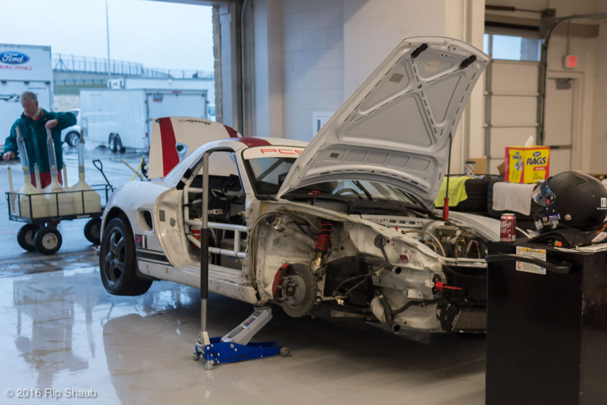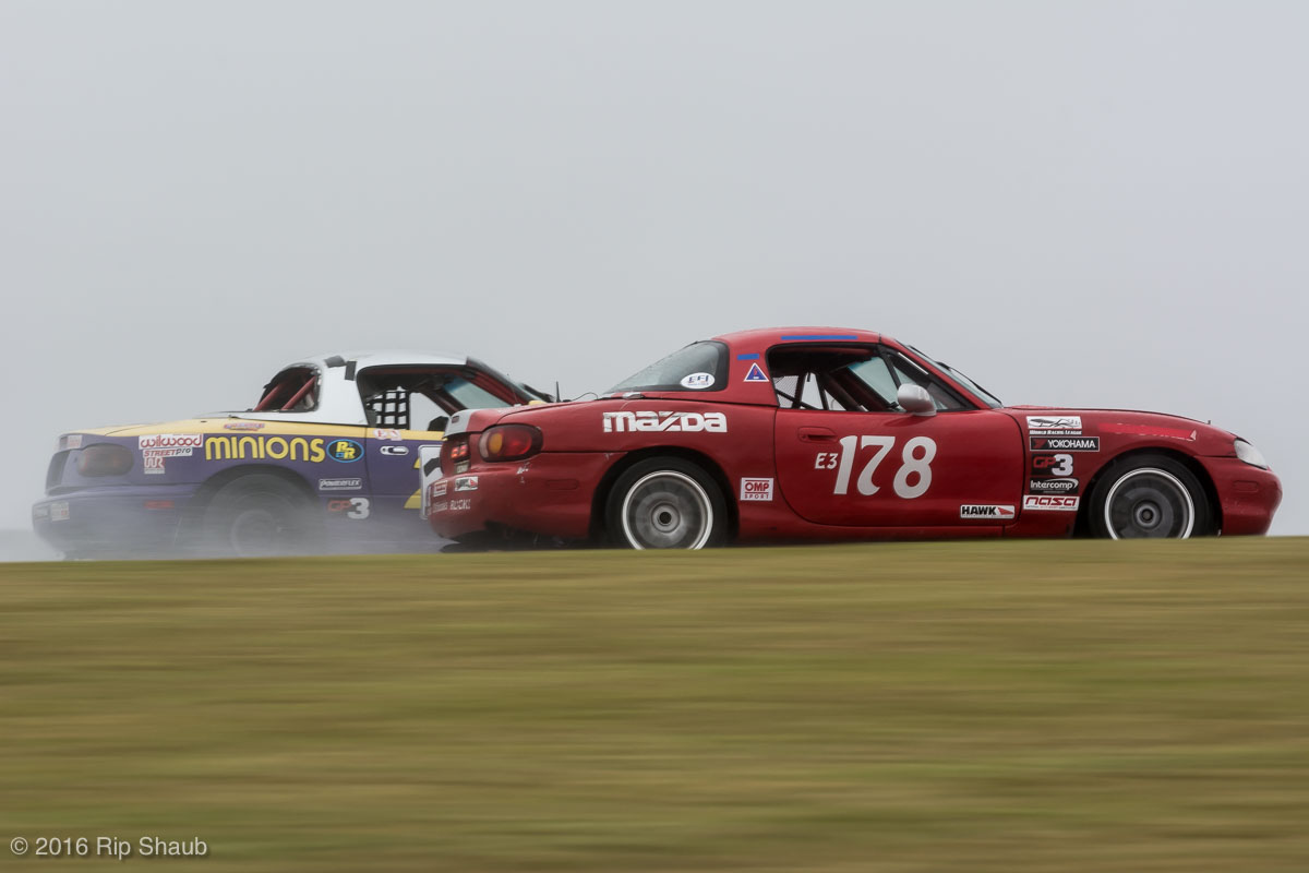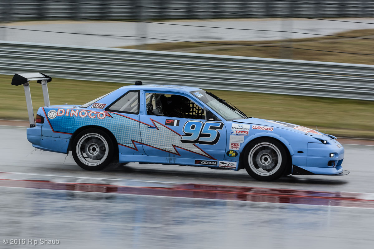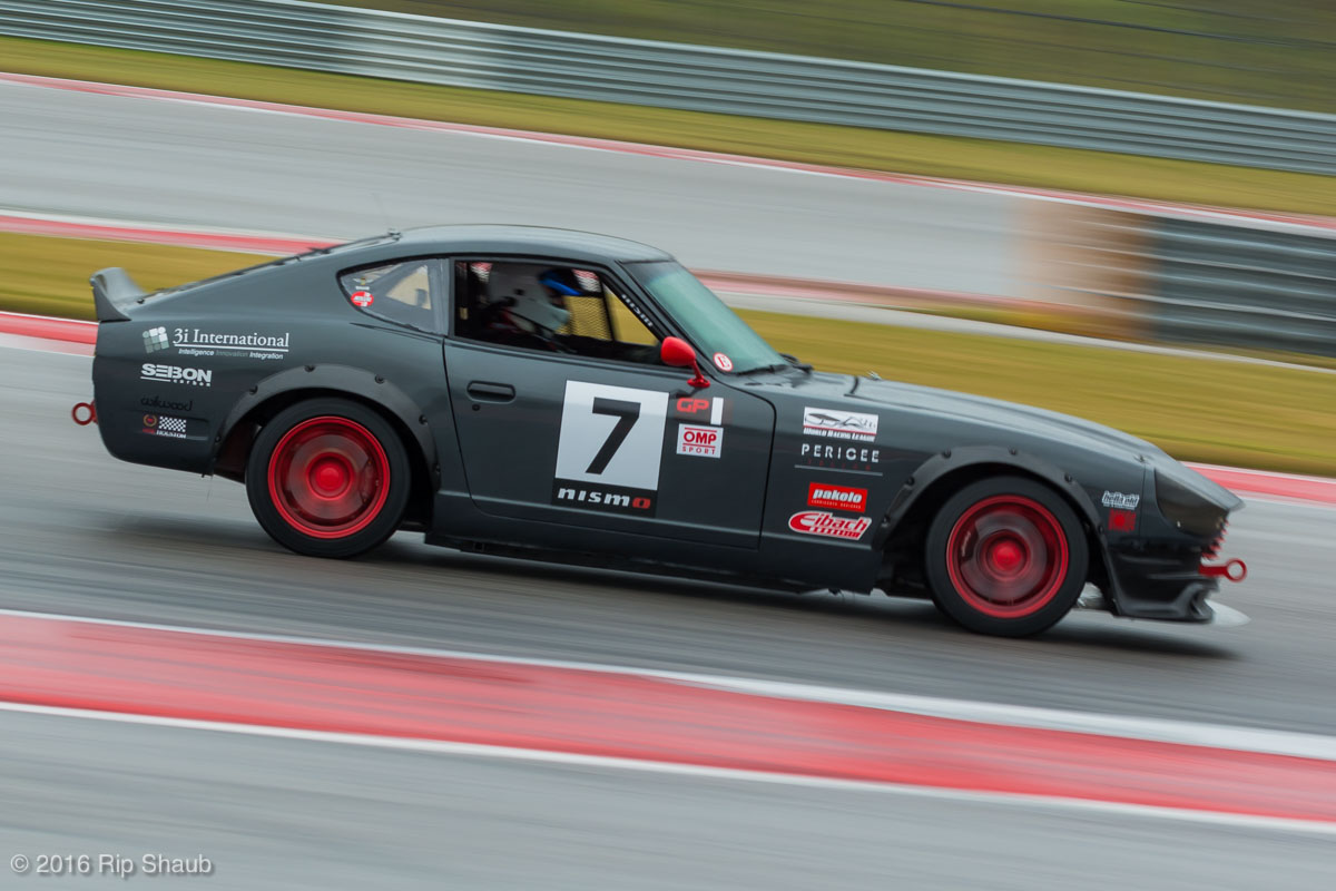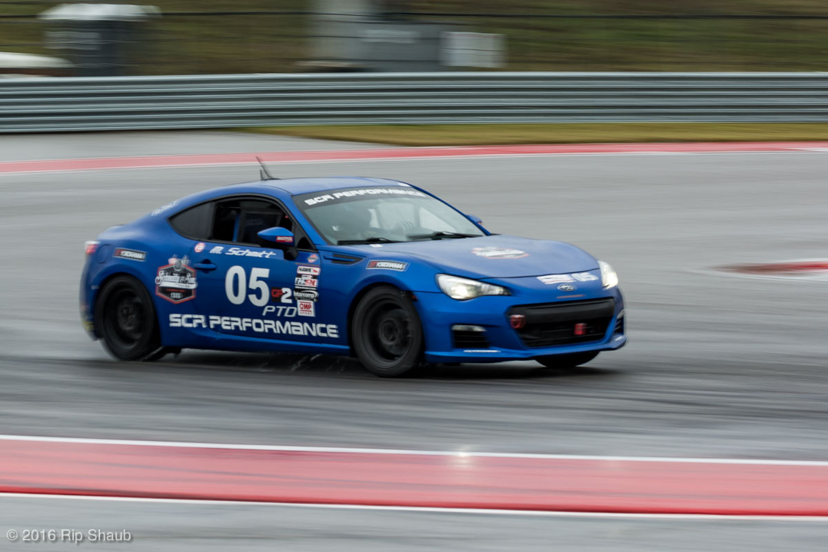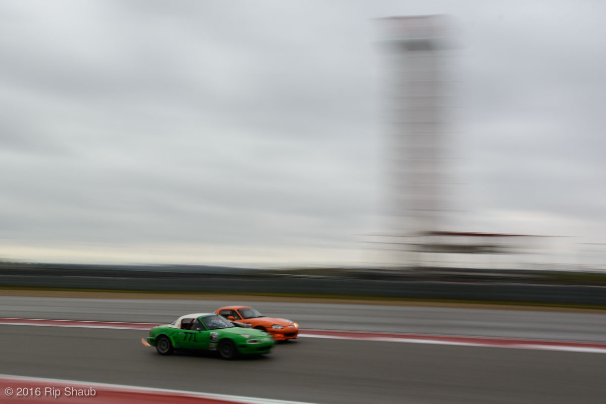 Saturday's grid features an eclectic mix of cars in 5 racing classes. Class is determined by the entry's power to weight ratio. GP1 for the highest rated to GP4 for the lowest. The additional GPX class featured 3 cars whose power exceeds the top class but were cleared to participate.While the grid waits for a break in the rain to get started, drivers find ways to keep the cars dry. The Steadfast Poorvette, and other open cockpit cars, tried hard to keep the cockpits comfortable before the start.Beanito Beandudo's 1970 Triumph TR6 from GP4 has the extra challenge of avoiding overheating while waiting to get underway. The car was ultimately fine and survived to finish both days.Vess Motorsports brought this BMW M235ir that competed in GPX. Conditions were soupy all weekend, but the BMW had no problem slicing through the heaviest rain. The 72 car was the overall leader, completing 145 laps on Saturday and 147 on Sunday.McNeil Motorsports Toyota Celupra hybrid brought amusement and bewilderment each time it passed. They went on to complete 120 laps on Saturday before recording a DNF.Cool G Racing brought this terrific looking 1972 Datsun 240Z to COTA. They completed both days' enduros in style.Roadkill Racing's 1997 Miata heads for Turn 10. The GP3 class is mostly Miatas, and WRL is working on a partnership to bring the SuperMiata series to the eastern part of the US.The mixed classes mean plenty of passing during the races. Here, five cars crowd into the tight confines of Turn 15 on Saturday.SCR Performance's 2013 Subaru BRZ finished 3rd in class on Saturday, but did not compete on Sunday.Outside the garages were countless fuel jugs all weekend. Rules prohibit storage of fuel in the garages and that means a constant shuffling of full and empty jugs from the paddock to pit lane.RRW Motorsports Miata recorded a DNF both days, but not before completing 237 laps over the weekend. Here the shark attacks Turn 11 with ferocity.The weekend's other BMW M235 plows through some of the heaviest rain on Saturday. This car went on to record the fastest lap time of the weekend in Sunday's racing and finished second in GPX to its teammate on both days.EcoBooze's '89 Fox-body Mustang finished 1st in GP4 Class on Saturday and 4th on Sunday. Here it throws lots of spray as it enters the main straight fresh out of Turn 20.Al Mallory Racing's 2008 Corvette finished 5th in GP1 on Saturday, but DNF on Sunday after 7 hours and 125 laps.The rain slowed for a for a few minutes, but the conditions were still soaking wet mid-day Saturday. A crowd launches out of Turn 20 and heads down the main straight and up the hill into Turn 1.Z-Ya's 1973 Datsun 240Z streaks through one of the wetter parts of the stadium section of the track.The flat black of the Poorvette's rear clip absorbs light like a black hole on an already gloomy day. It leans hard in Turn 15 on its way to win the GP2 class on Sunday.Endurance racing means frequent pit stops for fuel and driver changes. These aren't the frenzied and choreographed pits of F1 but still provide an energetic interlude from the on-track action.Lemonata Racing's 1990 Miata sported a Sprint Car-like panel over the cockpit, providing a measure of relief from the rain. They went on to finish 3rd in GP4 on both days.RennsportKC's 2008 Mustang was a DNF on Saturday, but bounced back to win GP1 Class in Sunday's race.White Lightning's 1994 Miata spits a little flame as it heads for Turn 3. It's the only Miata that competedin the quicker GP2 class and finished 5th in class Sunday after a DNF on Saturday.With all-day racing, garages are as much apartments as workshops. Teams share space with four cars per garage and things can get cramped quickly. Fortunately camaraderie among teams prevails throughout the weekend.Huskers1's Miata had a strong showing, placing 3rd on Saturday and 2nd on Sunday in the GP3 class.Skid Marks Racing's Nissan 350Z takes it's turn through the wetness betweens Turn 12 and 13. They finished with 133 laps on Saturday, but had a DNF on Sunday after 3 hours on the track.Mid-race and between-race repairs were, at times, major. Engine swaps and body part replacements happened along top-end rebuilds and suspension repairs. Bucket List Racing's Boxster would succumb and was a DNF on both days, but not after logging over 11 hours on the track and more than 650 miles.The Sector Purple and Minions In Charge Miatas race up the short hill to Turn 9 on Sunday. Sector Purple took 2nd in GP3 on Saturday.The Vess M235ir again. Normally's Austin's skyline would be visible in the distance, but the gloom messed with COTA's traditional views the city. The 72 car was 8 short of logging 1000 miles of racing for the weekend.The Laminar Racing Miata won the GP3 class both days, en route to becoming the 2016 season's US Endurance Champion. Drivers logged more than 15 and a half hours racing for 940 miles.Team LMR's BMW 328i shows us just how gloomy the skies were in Austin on Saturday. They didn't feel the effects much, though, finishing 2nd in GP1 on Saturday and 3rd on Sunday. The other LMR entry, another 325i which was 15 years older, fell victim to a blown engine halfway through Saturday. The team was prepared to swap the engine overnight, but a suitable replacement couldn't be secured in time.OHWOWRacing illustrates how knolling is an essential part of any good shop work as they tackle the top end of their Mustang's engine. They completed 45 laps on Saturday before hitting trouble, and only completed an hour on Sunday before recording their second DNF.Zombie Response's Ford Escort Zx2 looks as if it mowed down a pack of the undead on the back straight. The zombies got the best of it after almost 6 hours on Saturday, but the team and car recovered to finish Sunday's race.Team McQueen brought a pair of Nissan 240SX entries to the track and they finished 3rd and 5th in class on Saturday. Both cars failed to complete the race on Sunday, with this #95 one falling just a half hour short of