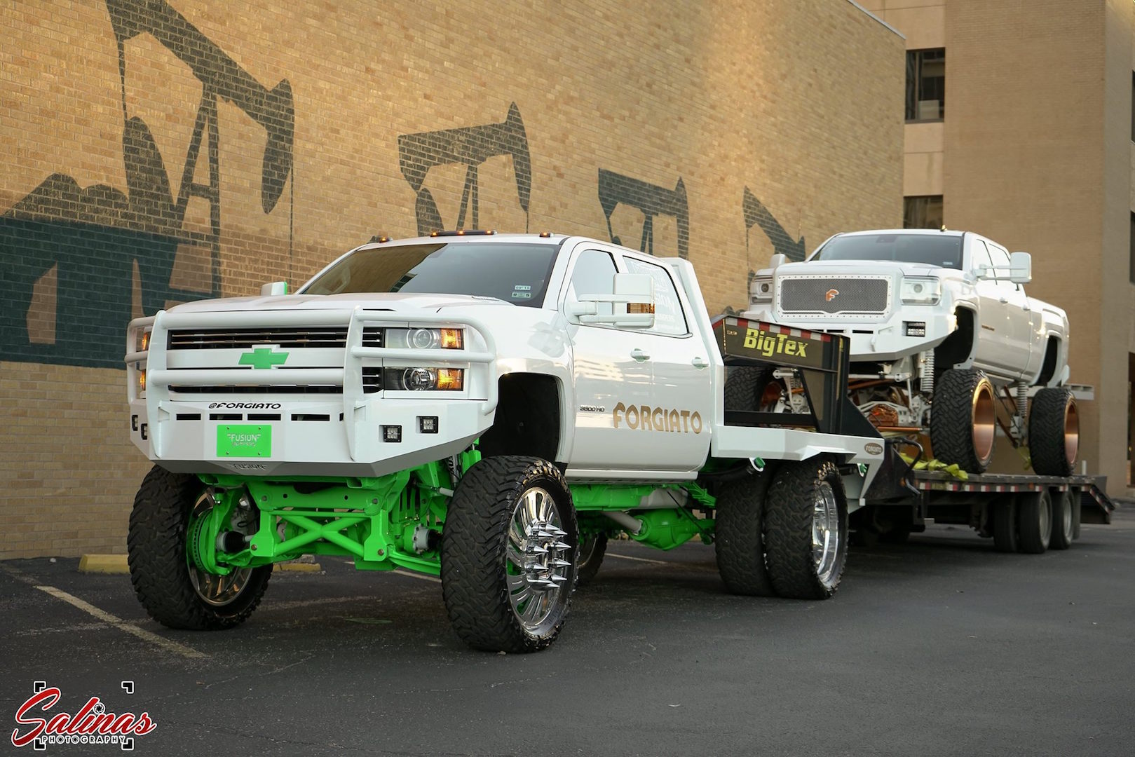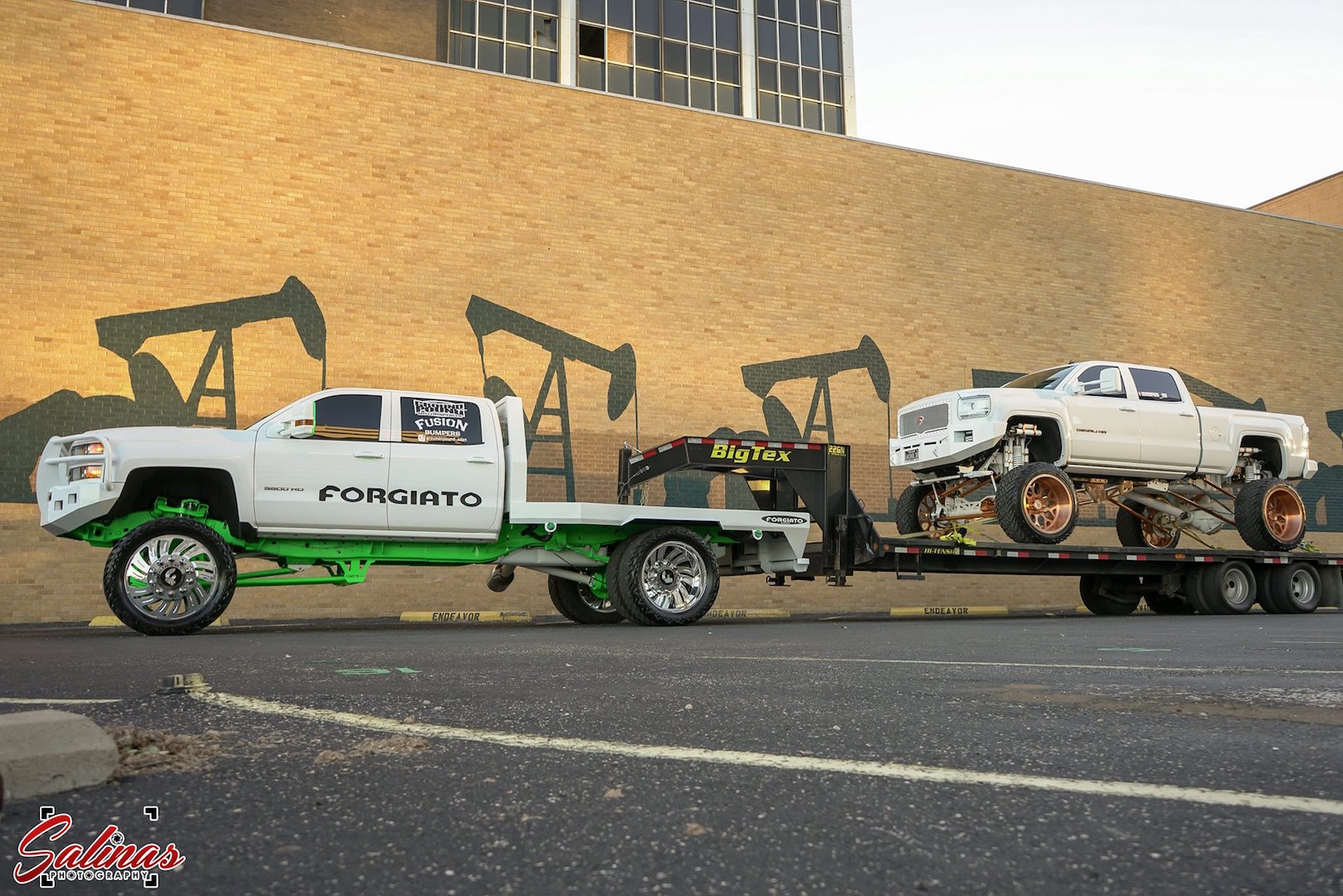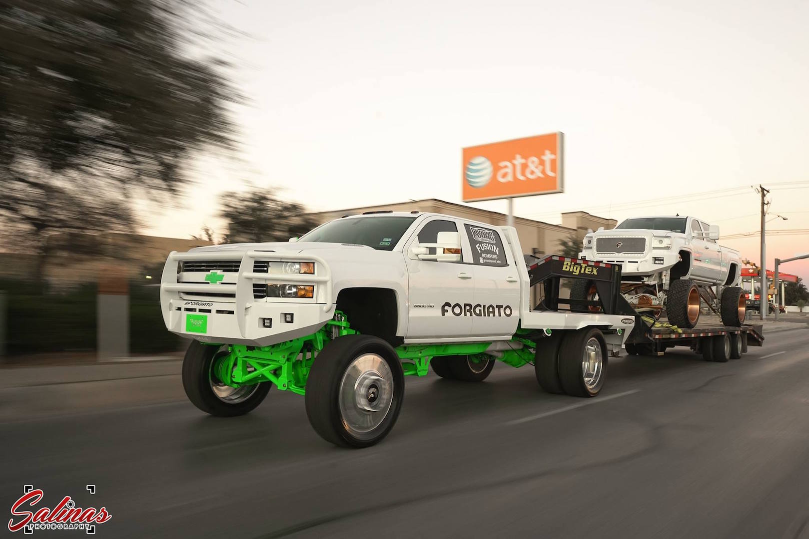 It’s not every day you see one highly-elevated custom diesel truck on the road. It’s even more rare to see one towing another. Owner of both trucks, @groundnpound_eden recently had a photo shoot with Salinas Photography to showcase both rigs and prove the 3500 especially could handle its duties.