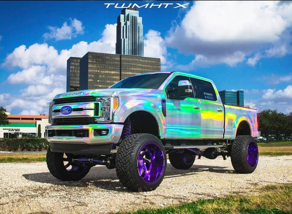 In an attempt to “break IG“, Tire and Wheel Master of Houston, Texas took their customization to another level. TWMHTX wrapped the rig in what they refer to as “Holochrome” vinyl resulting in a dizzying prismatic effect. The truck also sits on a set of anodized purple 26×16-inch Specialty Forged wheels wrapped in 40-inch Fuel tires. The shop used the Holographic Chrome Silver vinyl from VViViD Vinyls of Montreal (Canada) to achieve this flamboyant finish.