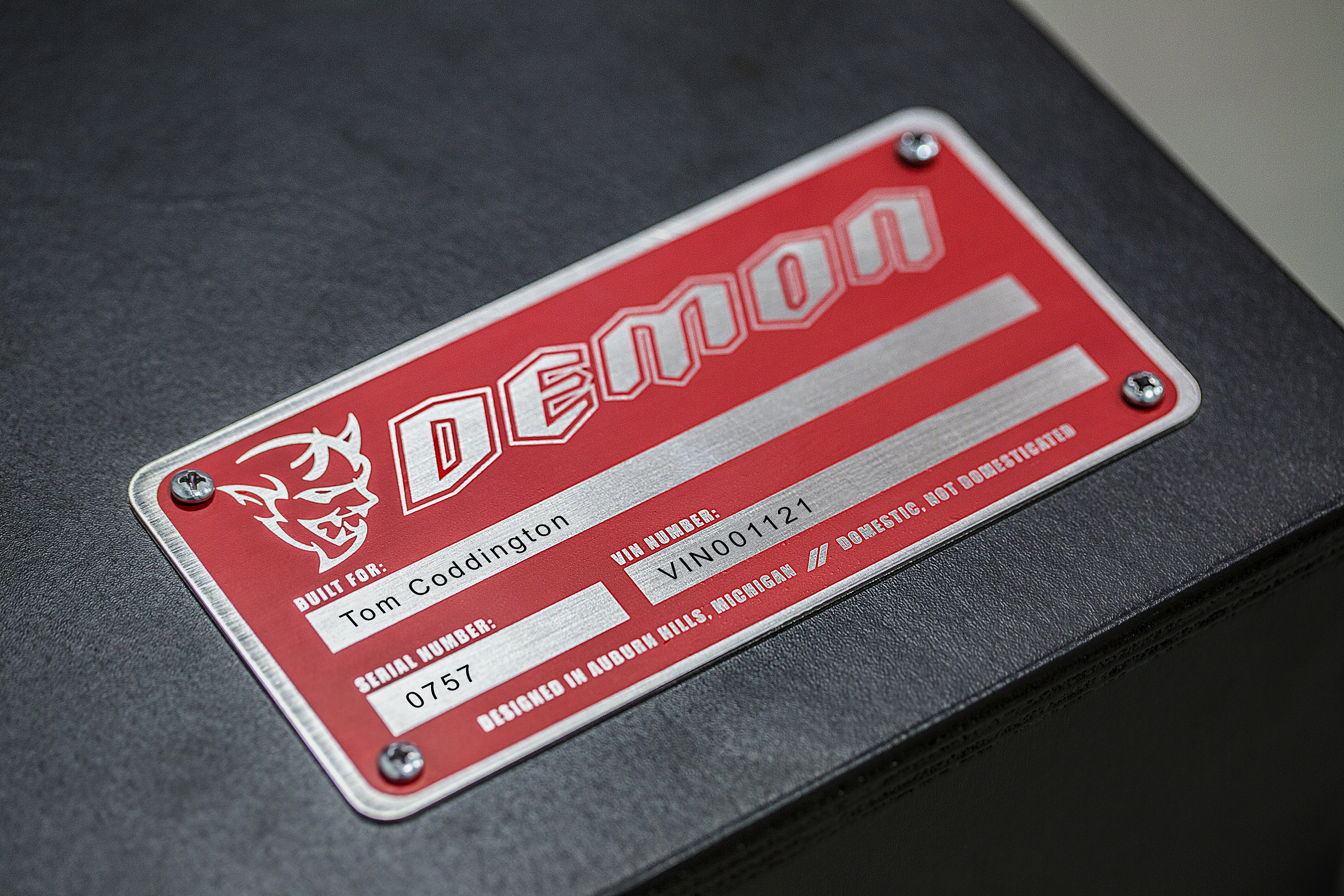 Dodge also announced that each Demon will come with a customized nameplate, as typified below. “Nothing is a coincidence and everything means something,” the carmaker said in its release, so make of that—and the video, and the plate below—what you will.