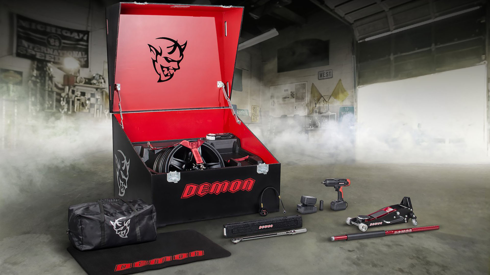 Inside the Demon Crate will be a collection of tools selected to maximize the Demon’s drag strip performance. The custom Demon-liveried hydraulic floor jack, impact wrench, torque wrench, and tire pressure gauge all hint at drag-only tire changes and adjustments, while the fender cover and tool bag keep things protected in style. Earlier announcements revealed optional spare wheels, performance parts, and a track pack system for the Demon.