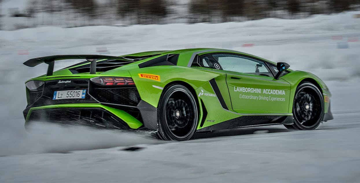 Winter Driving Accademia provides participants with a twelve hour session, allowing them to test in various situations like night driving. During the training, owners pair up with official Lamborghini reps that first give customers a ride-along through figure eights and slaloms, showing them how to prance around obstacles with precision. That’s easier said than done, though, as the hefty Aventador still weighs around 4,000 pounds, making it especially difficult to dictate its direction without much skill. Once you’ve ridden passenger, you then “get the chance to try a variety of thrilling exercises such as emergency braking, drifting and full lap driving on the snow”, according to Lamborghini.