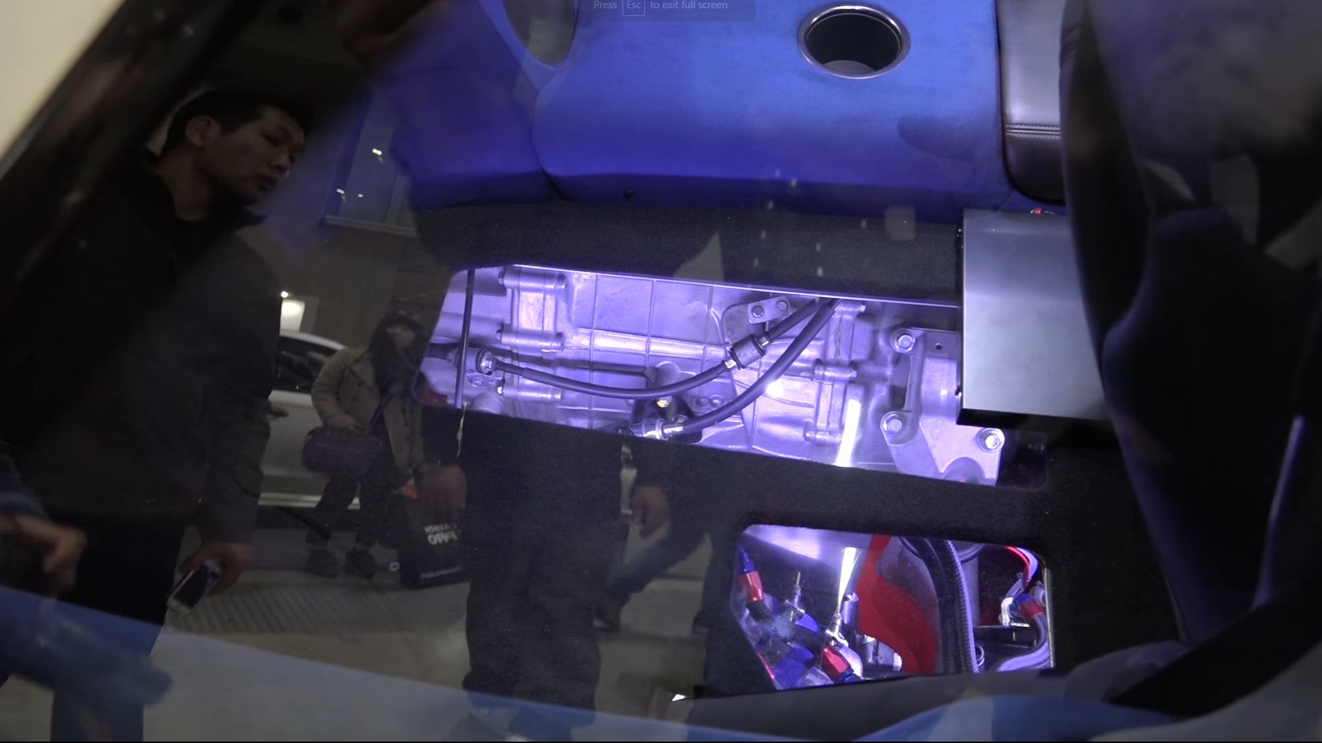 Eventually, Alexi stopped to take a close look at the latest Top Secret Nissan R32 GT-R. And while it’s all R32 from the outside (save the “Dumbo” side mirrors), the inside is all R35 GT-R powerplant and drivetrain. We also see exactly where the R32 ends and R35 begins – virtually everything behind the front radiator support is all R35 GT-R. What’s more, we also get a look at the transmission through an acrylic window behind the driver’s seat. As you’ll see, the size of the R35 transmission required the R32 to lose its rear seating in order to accommodate the enormous hardware.