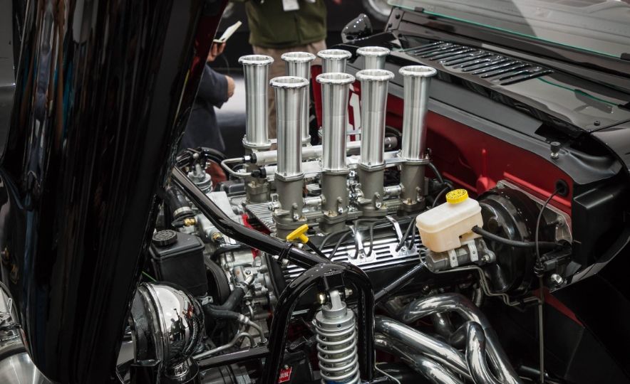 It seems to be equally capable, too. Coil-over-damper suspension is featured at each corner with a solid axle up front, promising exceptional suspension travel for those tight and rocky spots. The front tires are BFGoodrich Mud-Terrain T/A KM2 mud tires that measure 32-inches in diameter while the rear measure 37-inches. The staggered setup assuredly looks mean, though we don’t know how much function it provides over form. The engine you see underneath the hood is a 392-Hemi crate engine, which supplies plenty of oomph. Power is sent through a six speed manual Getrag gearbox.