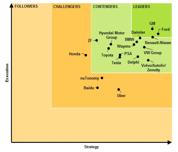 Who is really #1 in self-driving cars? You wouldn’t know it from this week’s unintentionally entertaining Navigant Research Leaderboard Report on Automated Driving, which placed Ford first, GM second and Renault-Nissan third. Waymo? Seventh. Tesla? Twelfth. The media—most of whom appear not to have paid $3,800 to read the raw report—lapped it up. Wired’s summary ran with the mother-of-all-clickbait heds, “Detroit Is Stomping Silicon Valley In The Self-Driving Car Race.”
