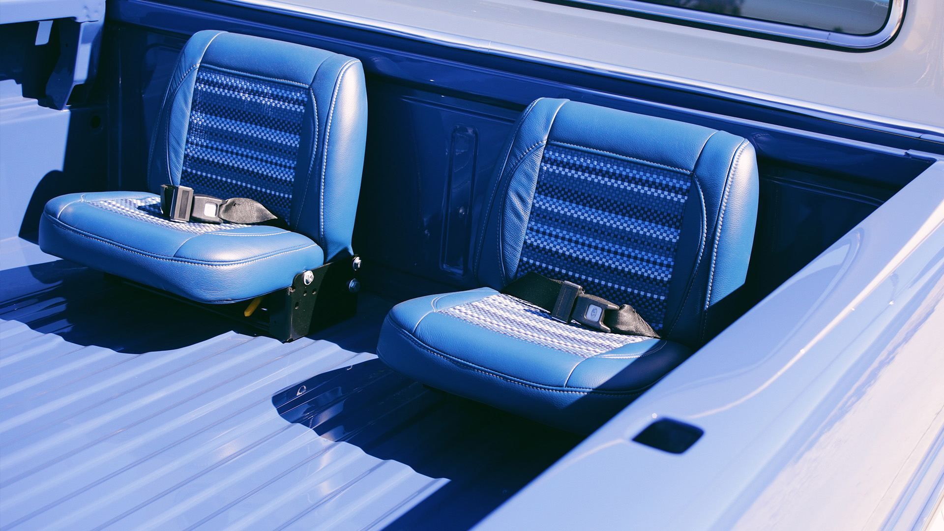 This F-250’s exterior is simple and clean, and the closer you inspect it, the more details pop out. What used to be a simple screw-off fuel cap is now just there for show—a modern fuel door and filler neck are hidden on the inner driver side of the bed. Look a little further back and you’ll notice two jump seats in the bed that match the cab’s bench, which would be a ton of fun to ride around in, off-road or wherever it’s legal.