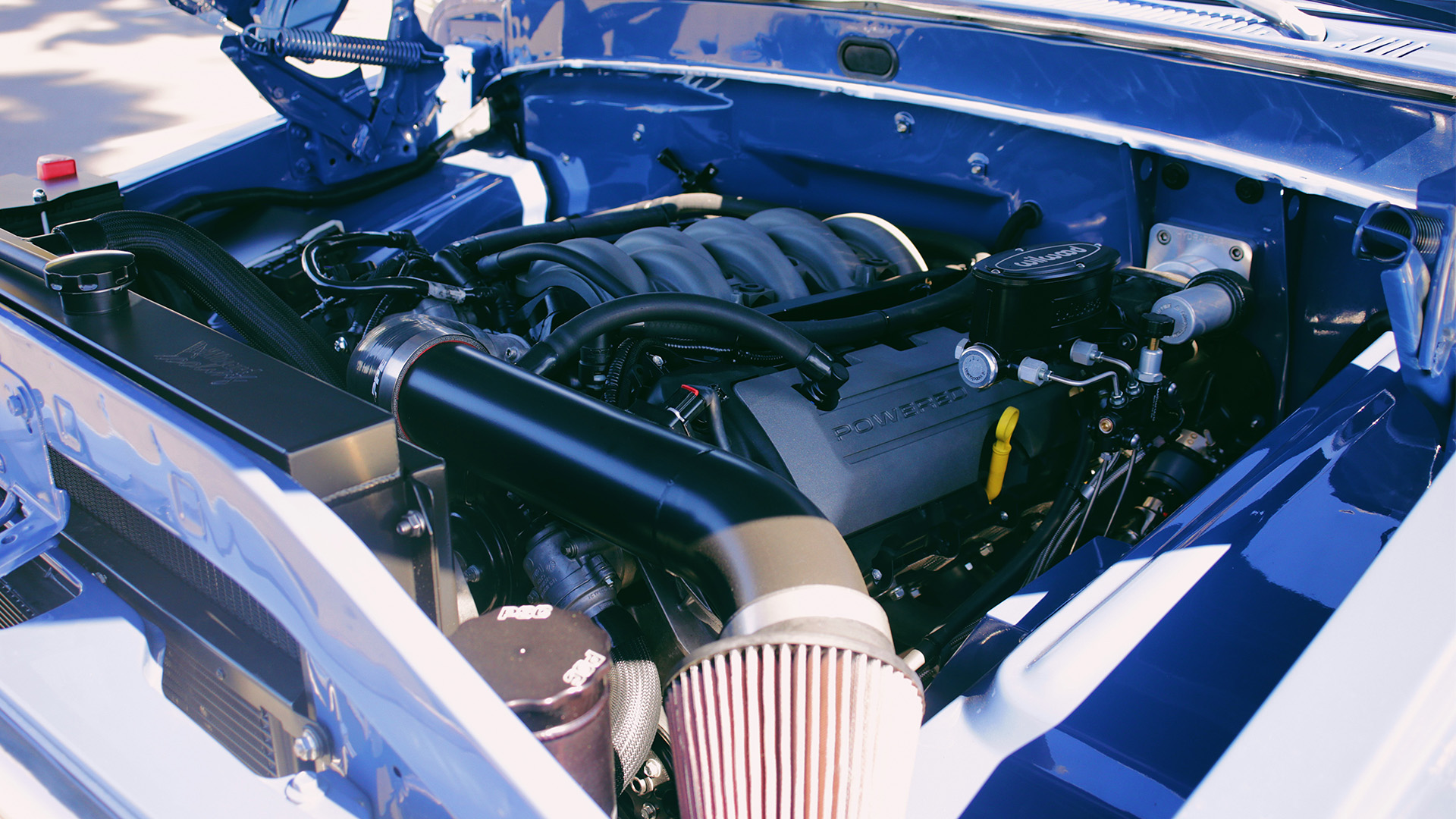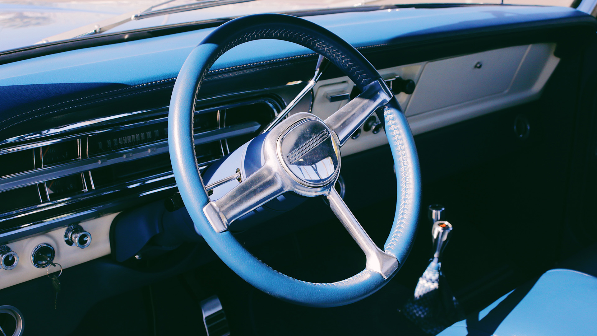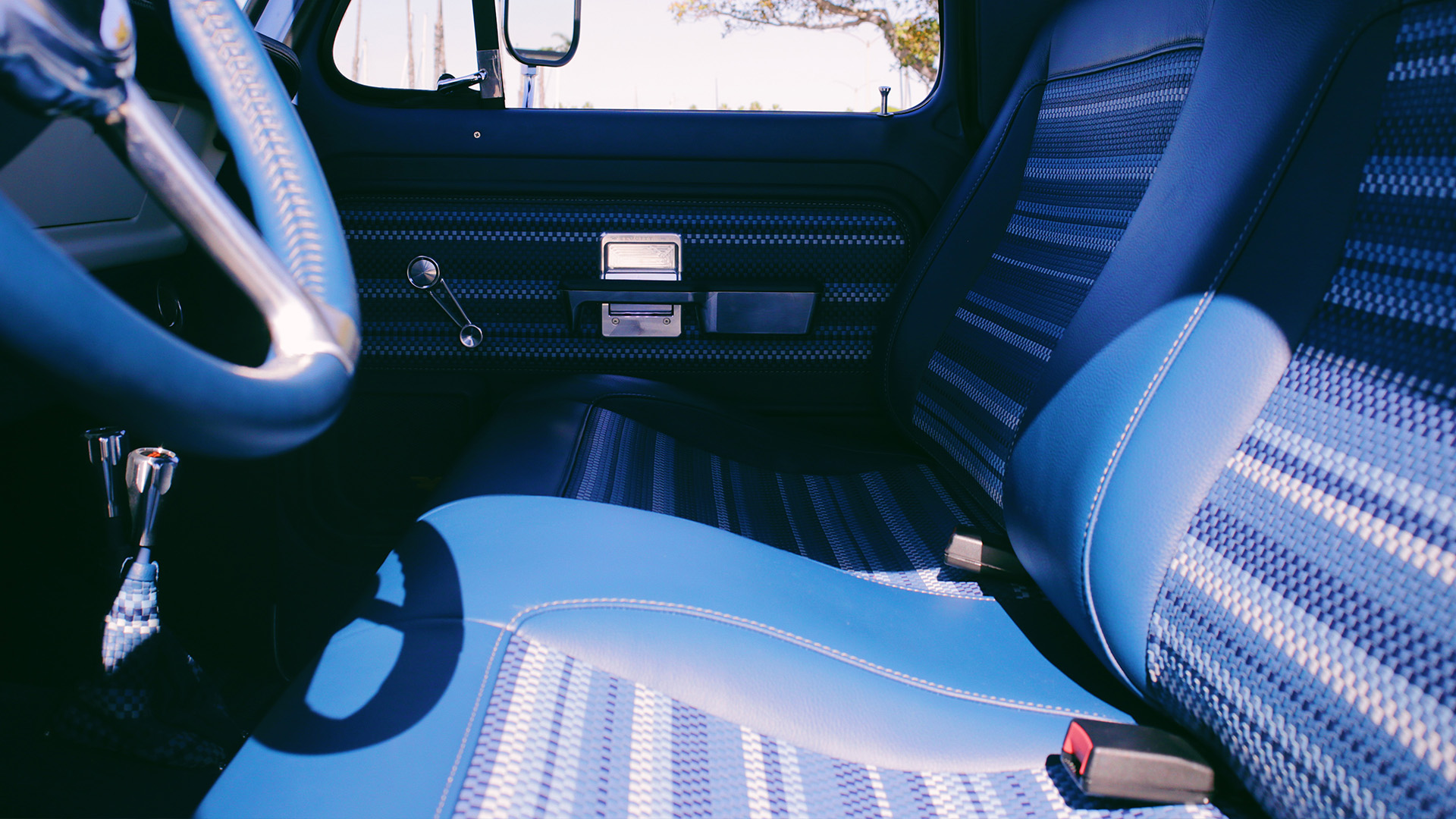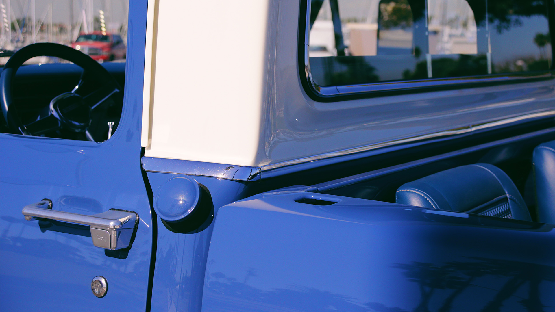 The whole package felt great while tooling around Long Beach. VR retained the factory lap belt design, and the same goes for its massive, thin-rimmed, leather-wrapped Sparc Industries steering wheel. The Bluetooth-enabled head unit looks period-correct, as does the analog-looking gauge cluster. It’s even got Vintage Air climate control, which gives you all the cool air of a new truck while staying true to the cool, classic look.