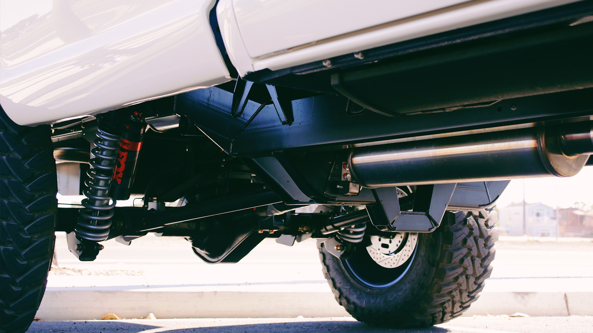 The Heritage Edition’s Atlas II transfer case and Dana axles are bolted up to a Roadster Shop RS4 chassis, which has custom-valved Fox reservoir shocks and Eibach springs hanging off it to keep the beast suspended high off the ground. They give the F-250 a comfortable and compliant, yet controlled ride. You never forget you’re behind the wheel of a straight-axled brute, but it’s never too jarring—you barely feel speed bumps, and a steep-inclined driveway can be taken at any reasonable (or unreasonable) speed.