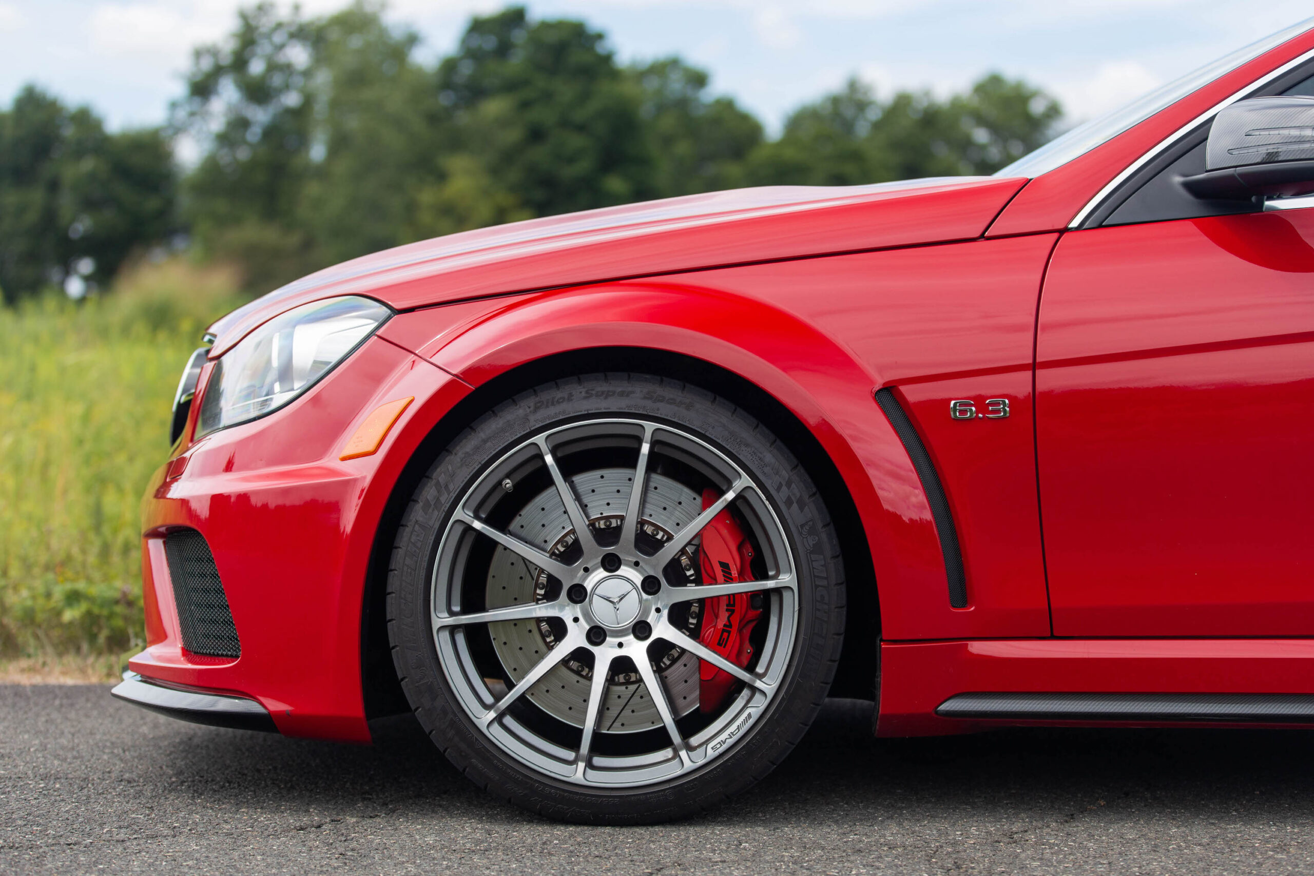 There is no lag in power. Like, none. From idle to redline, the engine pulls like it wants to drag you off the face of the planet. Today’s AMG performance figures land breezily in the 600-hp range, but this car—down 100 hp and rear-driven—delivers an altogether different experience. Owing to the fact that the front axle isn’t there to lend a hand, acceleration in the C63 Black Series is more of a brutal kick rather than a smooth, all-wheel-drive pull.