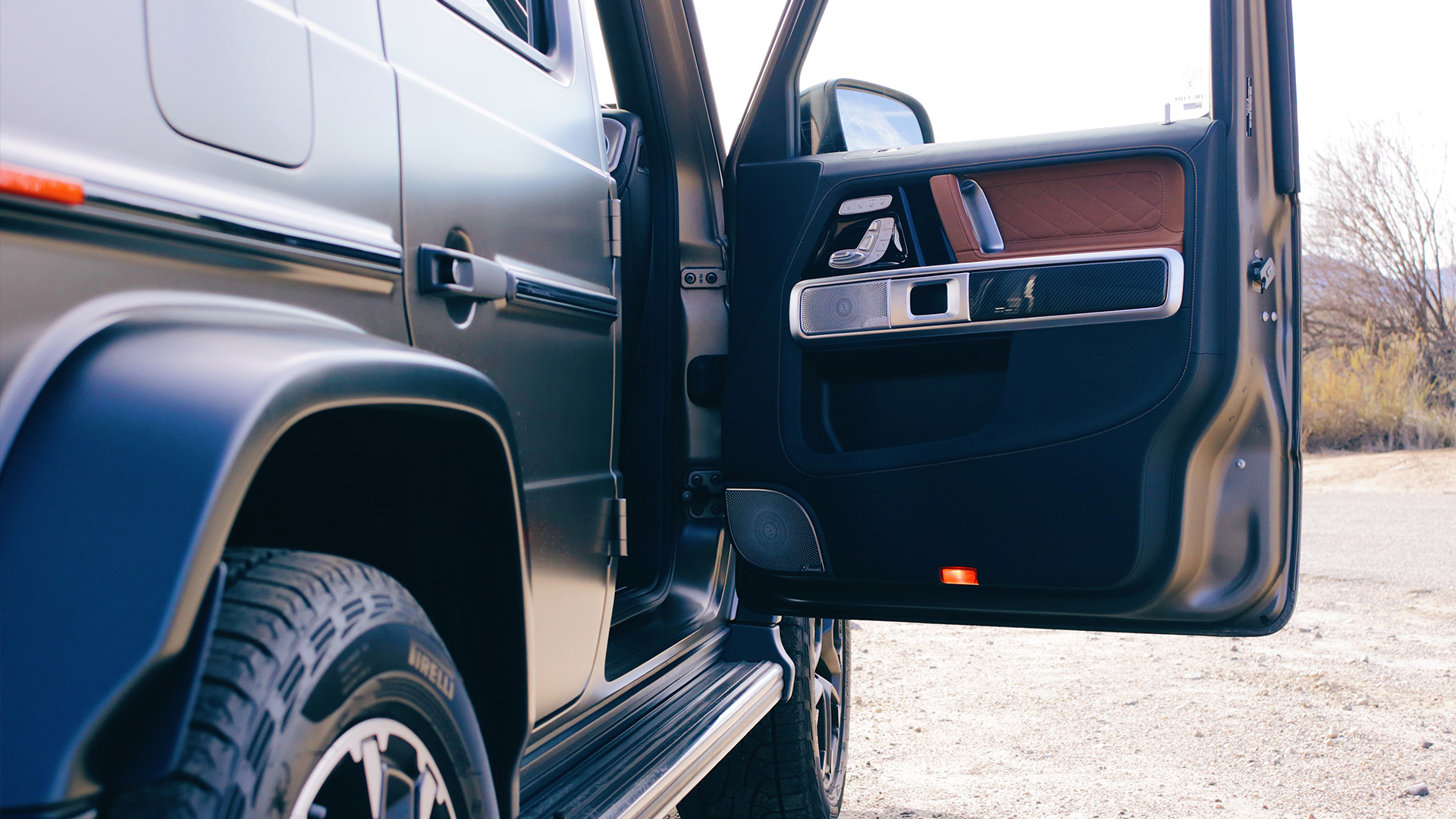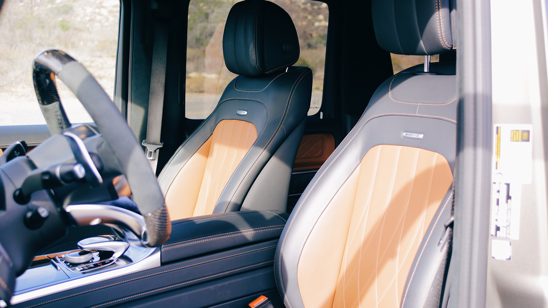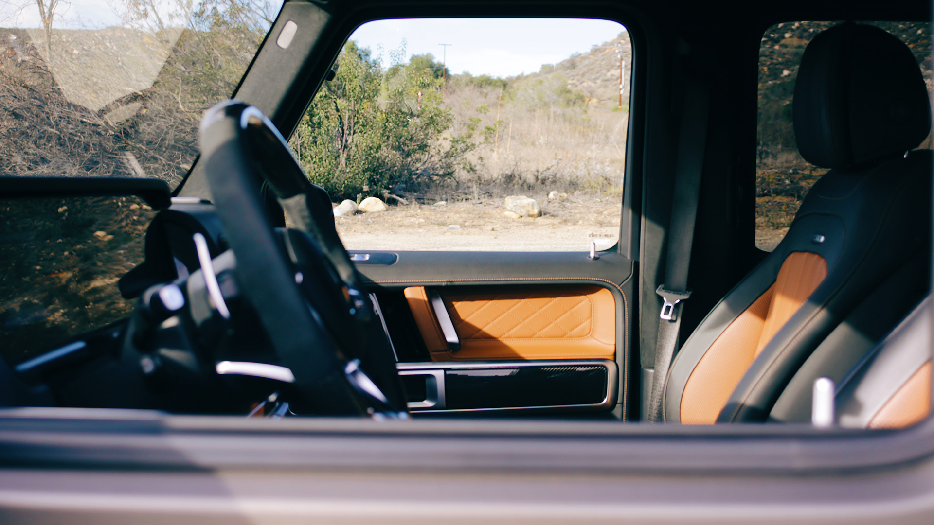 No matter which model prospective buyers choose, they both feature iconic, slightly-ugly-yet-also-quite-handsome styling with purposeful sturdiness built in. For instance, the door handles require pressing a big button and take more-than-average effort to close due to the immense amount of weather sealing. Opening and closing them is among the most satisfying experiences, ever. The G63 has massive fenders, exposed hinges, a rear gate that swings open rather than lifting up, and thick trim bits thrown on for added protection. The tester came equipped with the $3,050 AMG Trail Package, which includes all-terrain tires on 20-inch wheels, mud flaps, and blacked-out under guard protection. Oh, and the massive bull bar comes as standard—I was well-prepared for the immensely hazardous mall parking lots of Southern California.