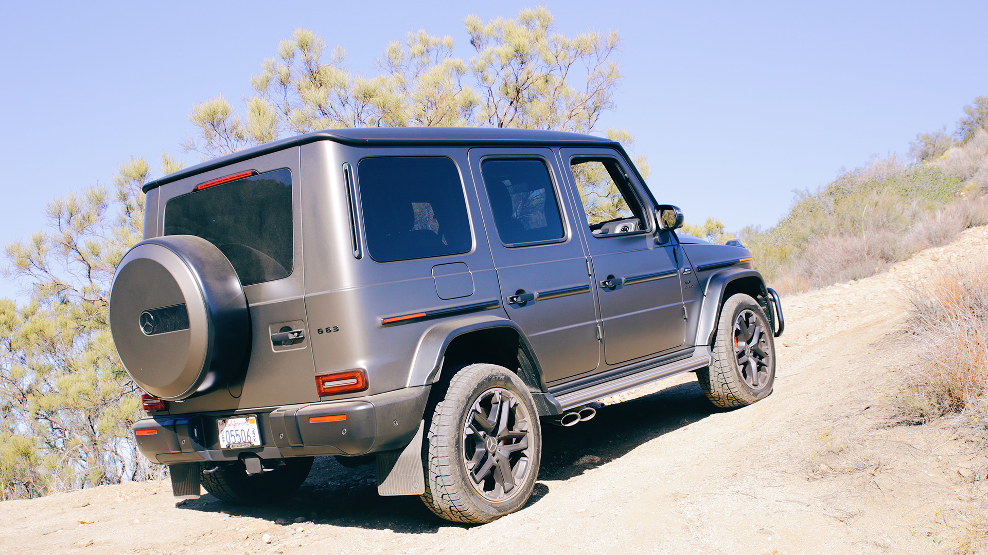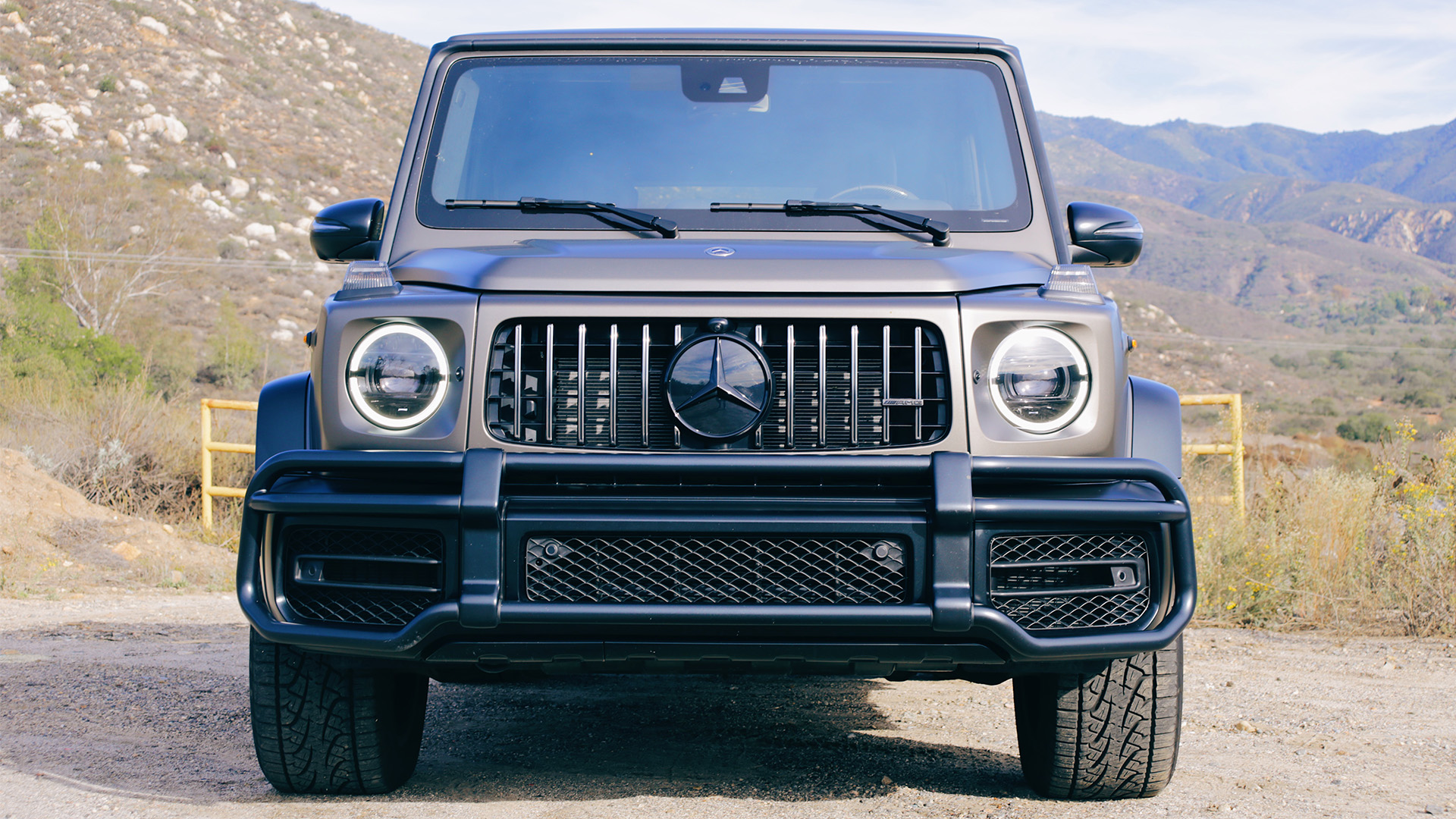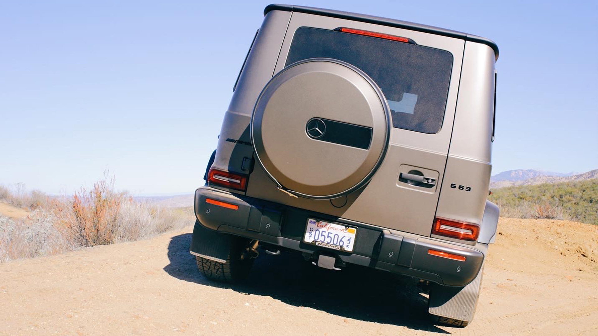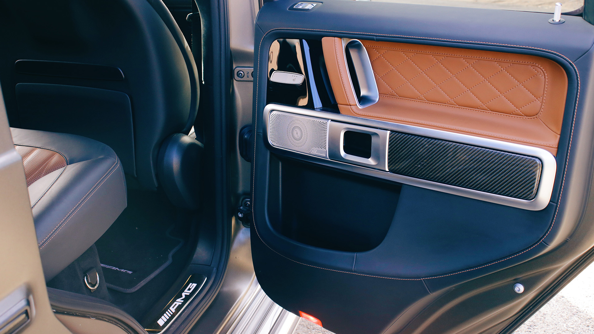 No matter which model prospective buyers choose, they both feature iconic, slightly-ugly-yet-also-quite-handsome styling with purposeful sturdiness built in. For instance, the door handles require pressing a big button and take more-than-average effort to close due to the immense amount of weather sealing. Opening and closing them is among the most satisfying experiences, ever. The G63 has massive fenders, exposed hinges, a rear gate that swings open rather than lifting up, and thick trim bits thrown on for added protection. The tester came equipped with the $3,050 AMG Trail Package, which includes all-terrain tires on 20-inch wheels, mud flaps, and blacked-out under guard protection. Oh, and the massive bull bar comes as standard—I was well-prepared for the immensely hazardous mall parking lots of Southern California.