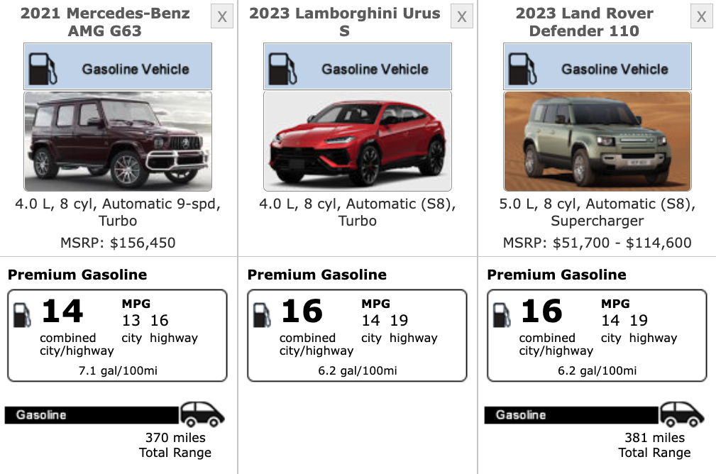 For those who are throwing down over one-fifty-large on one, and want all the thrills and comfort, I’m not sure it’s much of a concern. It essentially matches the Lamborghini Urus’ 14 mpg city, 19 highway, and 16 combined and the V8 Defender’s 14 mpg city, 19 highway, and 16 combined. Want a sustainable Benz? There’s a whole line of EQ cars for you to choose from.