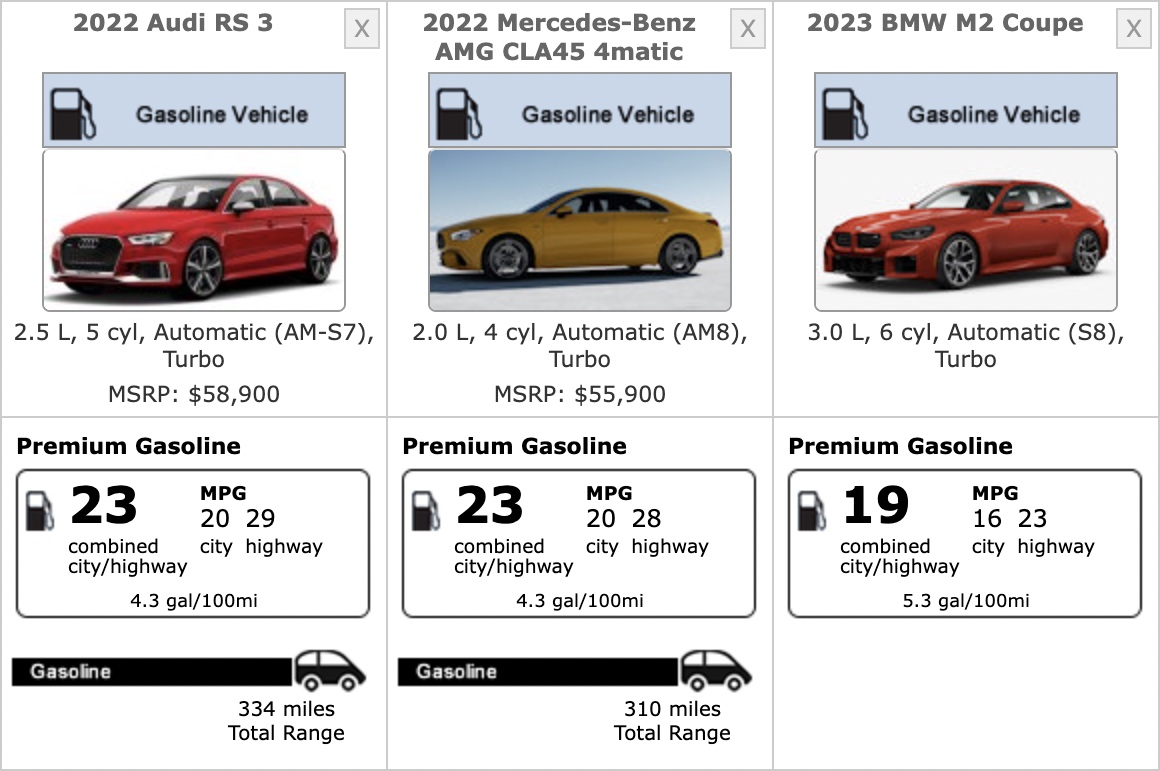 Like its closest rivals, the 2022 Audi RS3 gets subpar fuel economy. It still gets the best mileage among them though, at 23 mpg combined and up to 29 highway. The AMG alternative manages a marginally lower 28 highway, while the BMW M2 is a distant third.