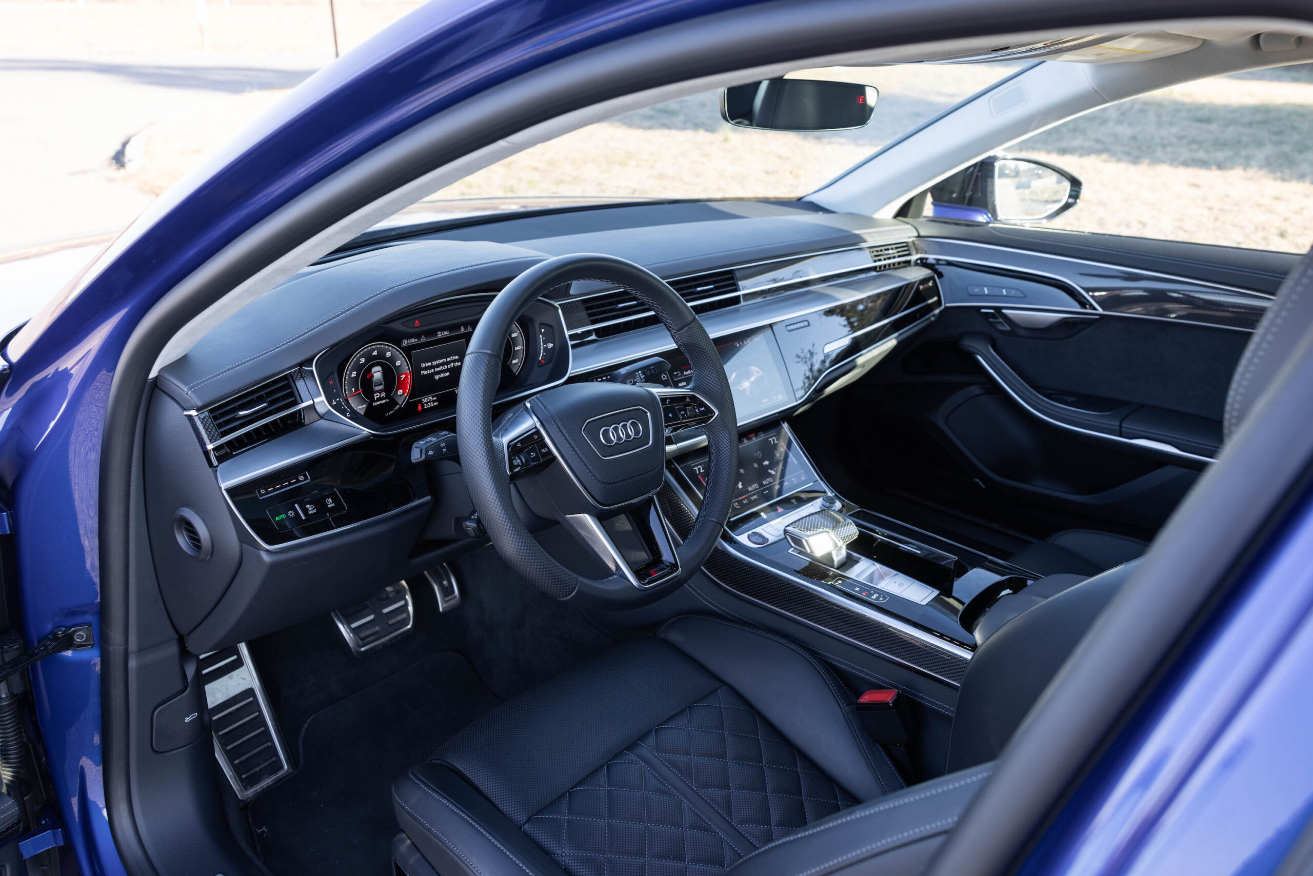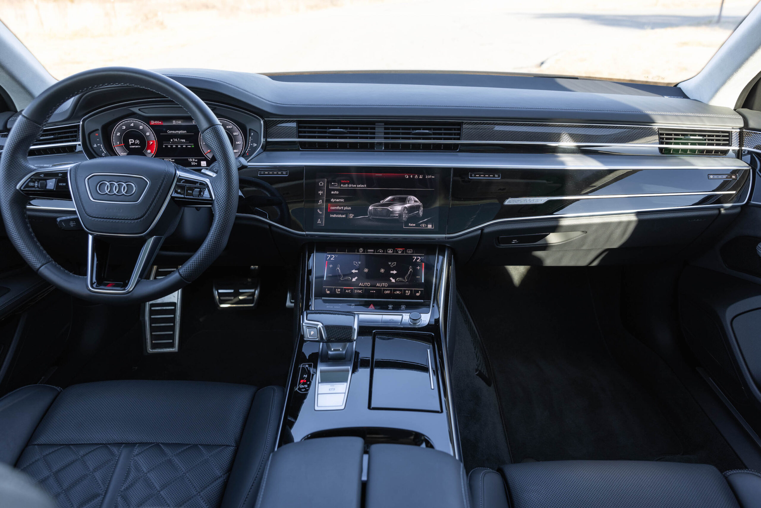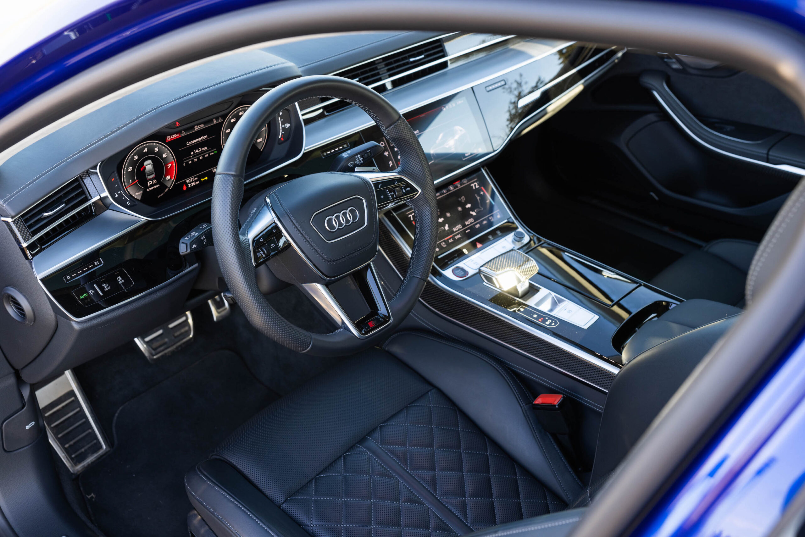 You’d be forgiven for being unable to tell the difference between the refreshed S8 and the one it replaces though, as it’s nearly unchanged. Only the headlights are slightly different and the interior layout is basically the same. There, you’ll find two stacked MMI touchscreen displays, a sea of quilted leather, and way more piano black trim than I’d prefer.
