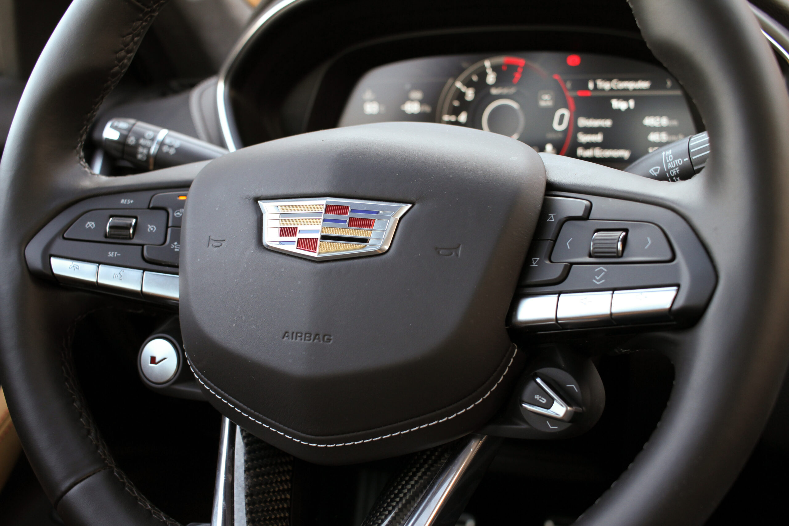 In black and with the bronze wheels, it’s a massively sinister-looking sedan. Its grinning face is one of mischief while its vaguely Cruella De Vil-esque rear end really sells it as a car made for sociopaths. Even without the carbon splitters, wings, and quad-exit exhausts, CT5 is well-proportioned and way more handsome than its smaller CT4 sibling.