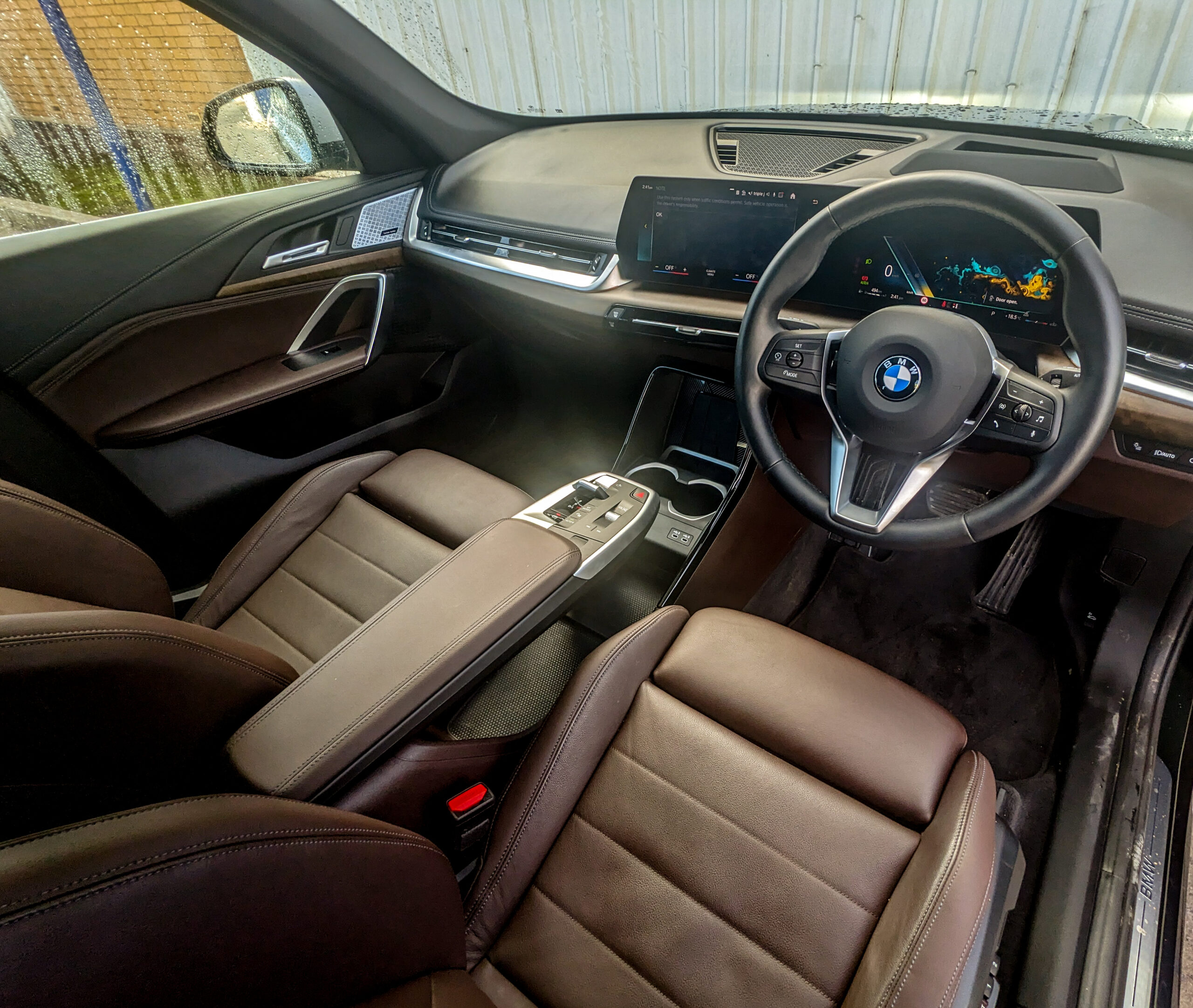 Inside, BMW has done the work to ensure the X1 feels like a step up from regular economy SUVs. It’s not so much in the interior layout itself; virtually every new car has some kind of high-res digital cluster and infotainment screen available. Instead, it’s all about materials, controls, and touchpoints. The X1 can be optioned in a variety of nice leathers, including an intoxicating chocolate brown. It’s a color palette from the 1970s, except somehow here it’s actually good. Combine it with the eucalyptus wood trim on the dash, and the ambient lighting system? It’s exotic. It’s like stepping into one of those ultra-modern organic health spas, awash in lush woods and fancy lighting. Only it’s a car. Oh, and the volume knob has the kind of knurling that machining YouTubers use to show off to each other. Enjoy it, it’s glorious.