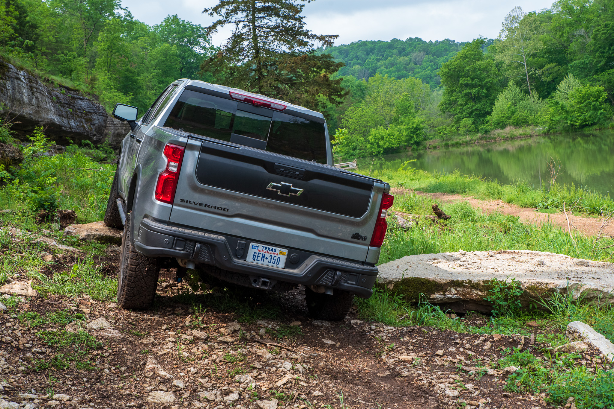 The Silverado ZR2 Bison and I headed to Rush Springs Ranch, an expansive 4×4 park that’s only eight minutes from my house in the Missouri Ozarks. The trails there range from mild to way-too-wild-for-a-truck-that’s-not-yours, so I stuck to the green and yellow routes marked here on the map. They still provided plenty of opportunities to test out the truck’s traction, articulation, and ground clearance.
