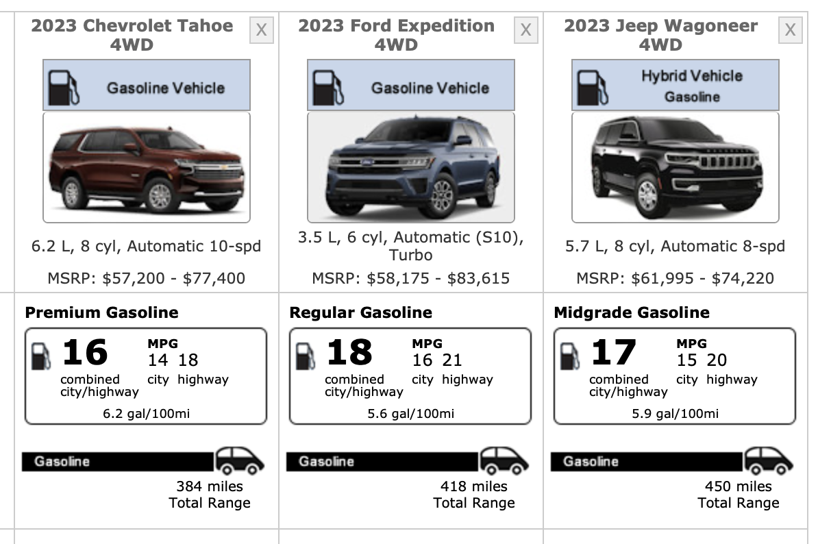 Then, if instead of a bowtie you prefer a ruffled dickey, the Cadillac Escalade Luxury commands a little more coin: $85,690. Finally, the Jeep Wagoneer starts a bit higher at $63,595. Its 5.7-liter V8 only puts out 392 horsepower and 404 lb-ft, but spending a little more can get you Stellantis’ turbocharged 3.0-liter Hurricane inline-six and as much as 510 horsepower.