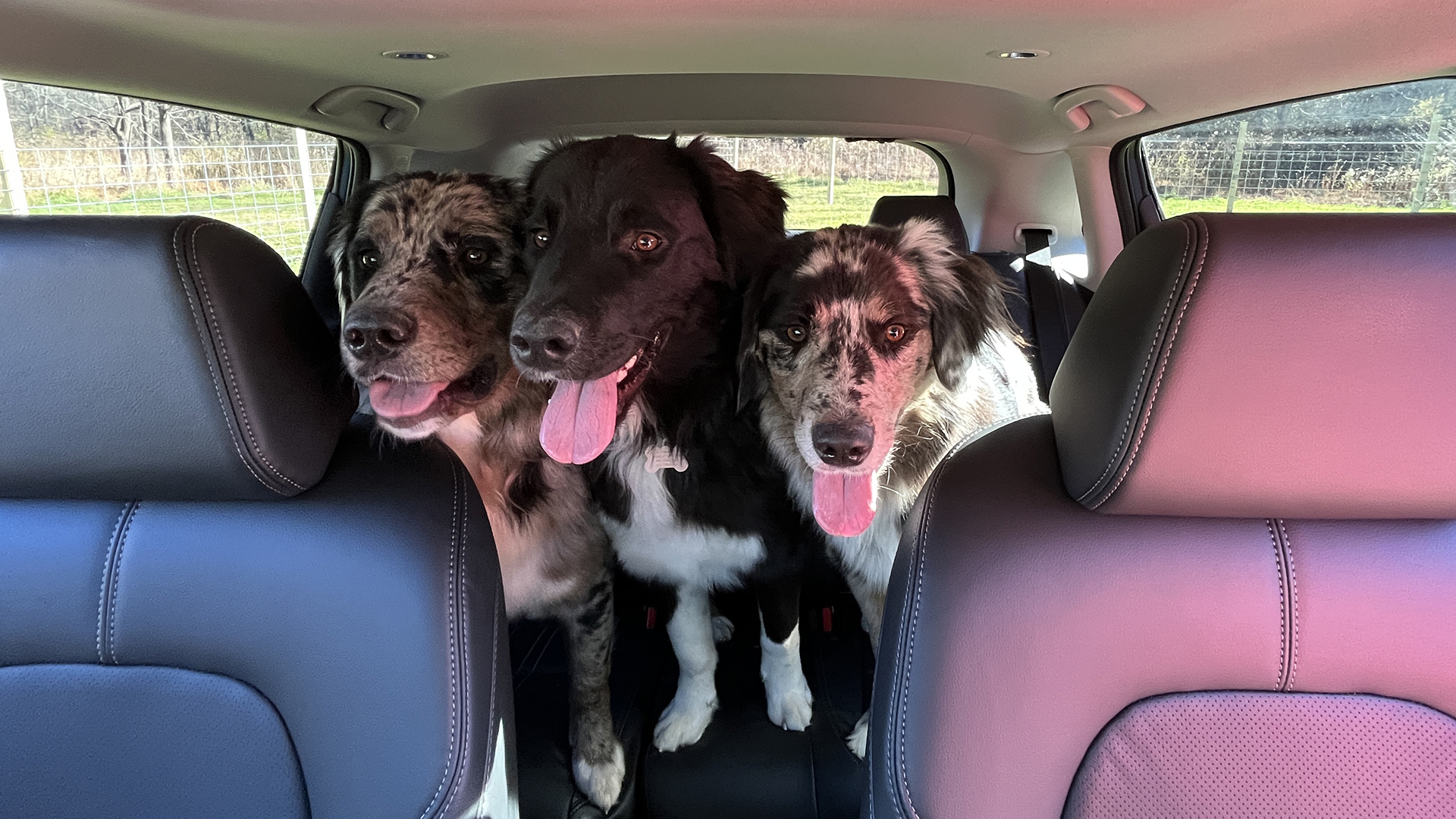 I was actually surprised at how easily Bramble, Indi, and Silas fit sitting abreast in the back seat of this car but that’s about the max amount of dogs you could drive comfortably in here if you had anything else to carry along with them. Two more this size could go in the cargo bay behind the seats, and I guess if you’re really ambitious and definitely not at all allergic to dog dander, two more could fit in the footwells.
