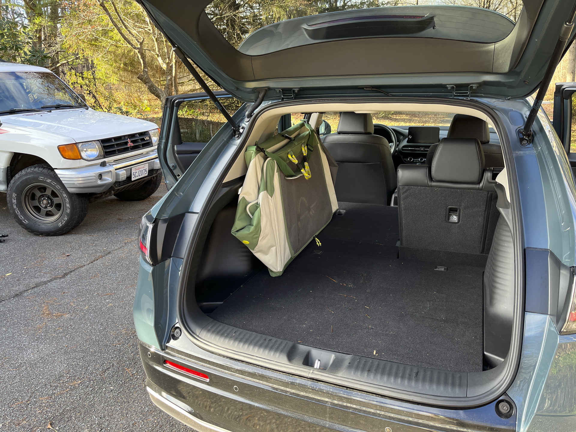 The hard kennel fit perfectly with two of the three back seats folded down, but wouldn’t work if you needed the whole rear bench for people. The folded kennel fit in a few different ways. I think you’d be pretty crammed with a hard kennel and two peoples’ stuff for even a short camping trip. Add a kid into the mix and the hard kennel’s never going to work—you’ll have to look at a collapsable one and probably a roof-mounted cargo box.