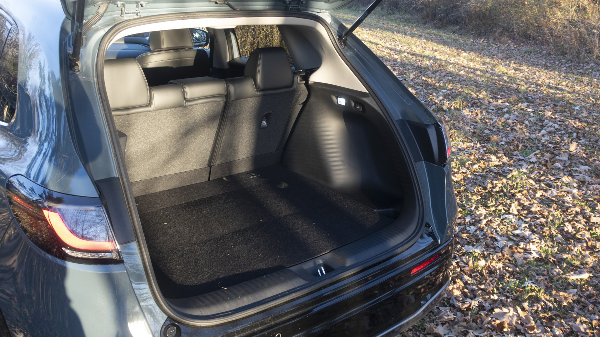 Bramble usually likes to sit upright in the back seat of whatever I’m driving (we usually use a dog hammock or seat cover but have not gotten her a seatbelt harness yet). In this car, I was amused to see her curled up in the rear passenger footwell after just a few miles. She fell asleep down there in short order.