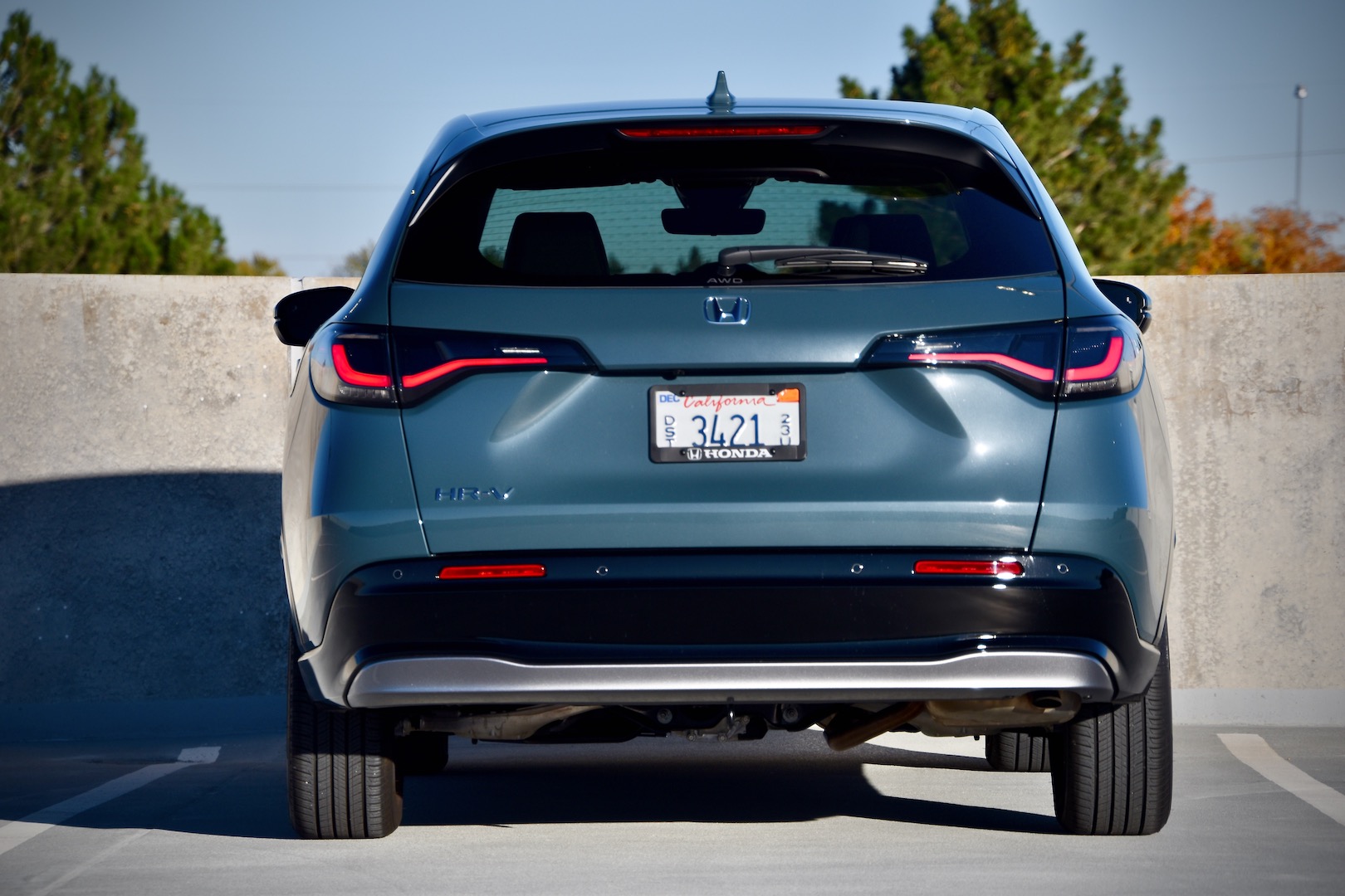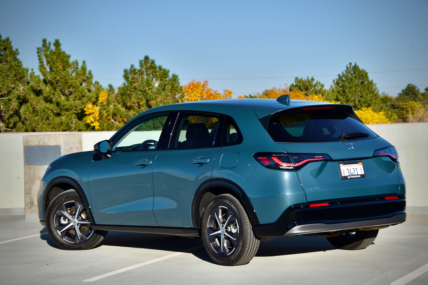 The first thing I noticed about the HR-V is how much it looks like a Ford Focus, only colder. I think it’s goofy and more self-serious than is warranted, but I’ll admit I kinda like it in person. The same goes for its wheels, with floating, starlike spokes, and its optional Nordic Forest paint. It looks greyscale until it’s held against a background that actually is, and it reveals itself to be a muted green. That said, the black plastic cladding is subtly tacky, and its bulbous side profile and rear end give it a bit of homely Odyssey. There are better-looking cars, there are worse-looking cars; the HR-V is pretty middling, at least from the outside.