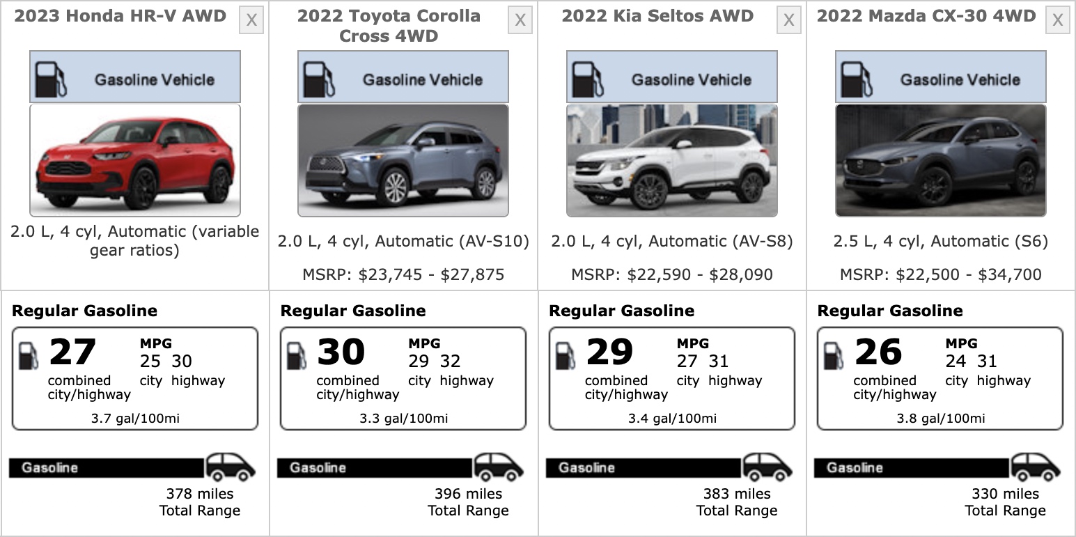 In terms of fuel economy, the HR-V is rated for 25 mpg in the city, 30 on the highway, and 27 combined. Compared to its biggest competitors in all-wheel-drive versions of the Toyota Corolla Cross, Kia Seltos, and Mazda CX-30, the Honda HR-V falls slightly below average.