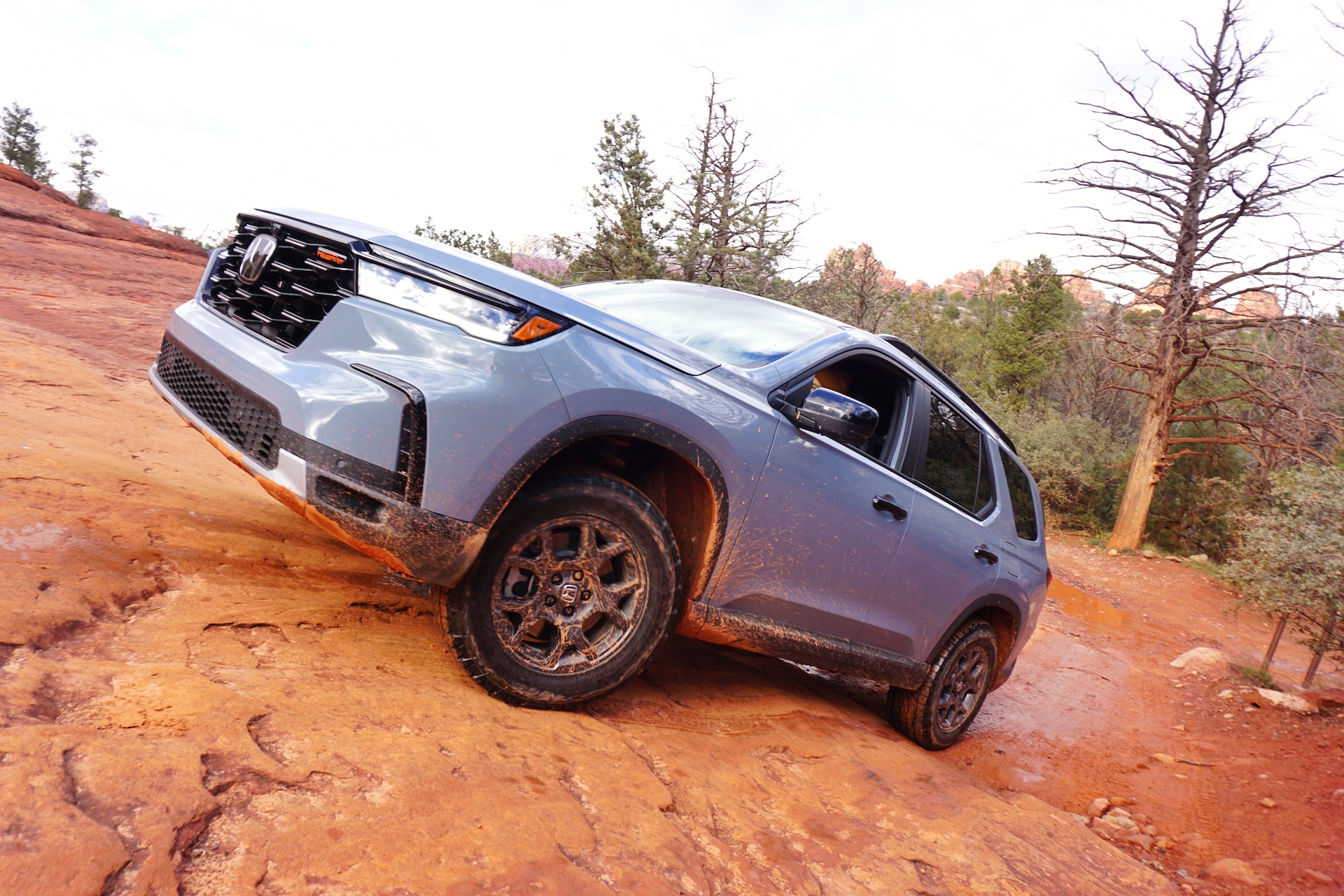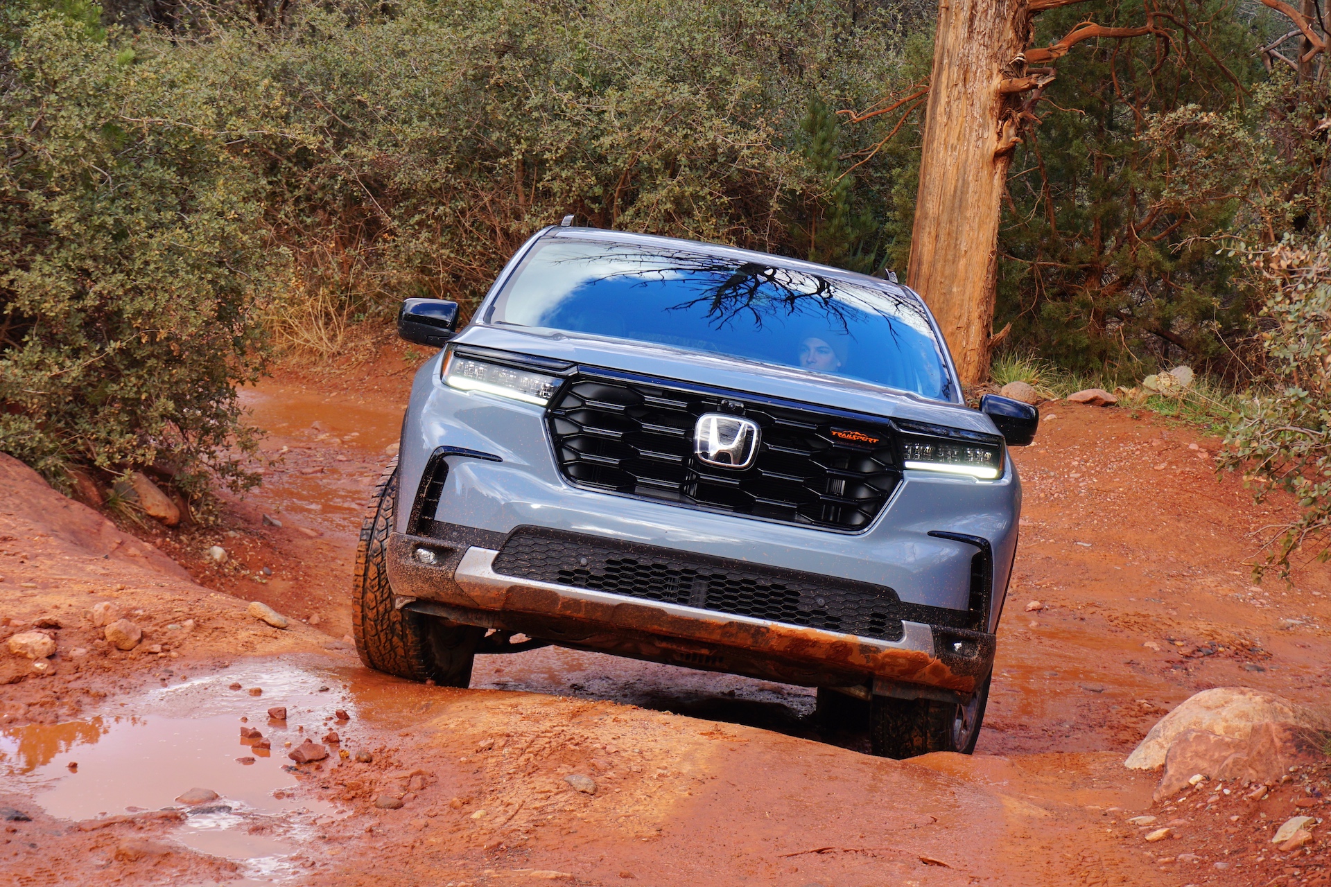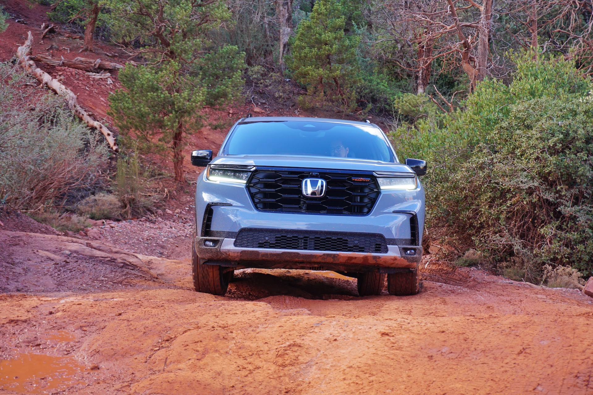 I made my way through narrow trails as I felt the SUV sink in the soft mud. With the Trail drive mode engaged, the all-wheel-drive system was able to distribute traction where it was needed most. It can send up to 70% of the torque to the rear, and 100% of that to either the right or left wheel. This came in especially handy on our first major obstacle, where the Pilot Trailsport had to maneuver a steep climb while turning slightly right.