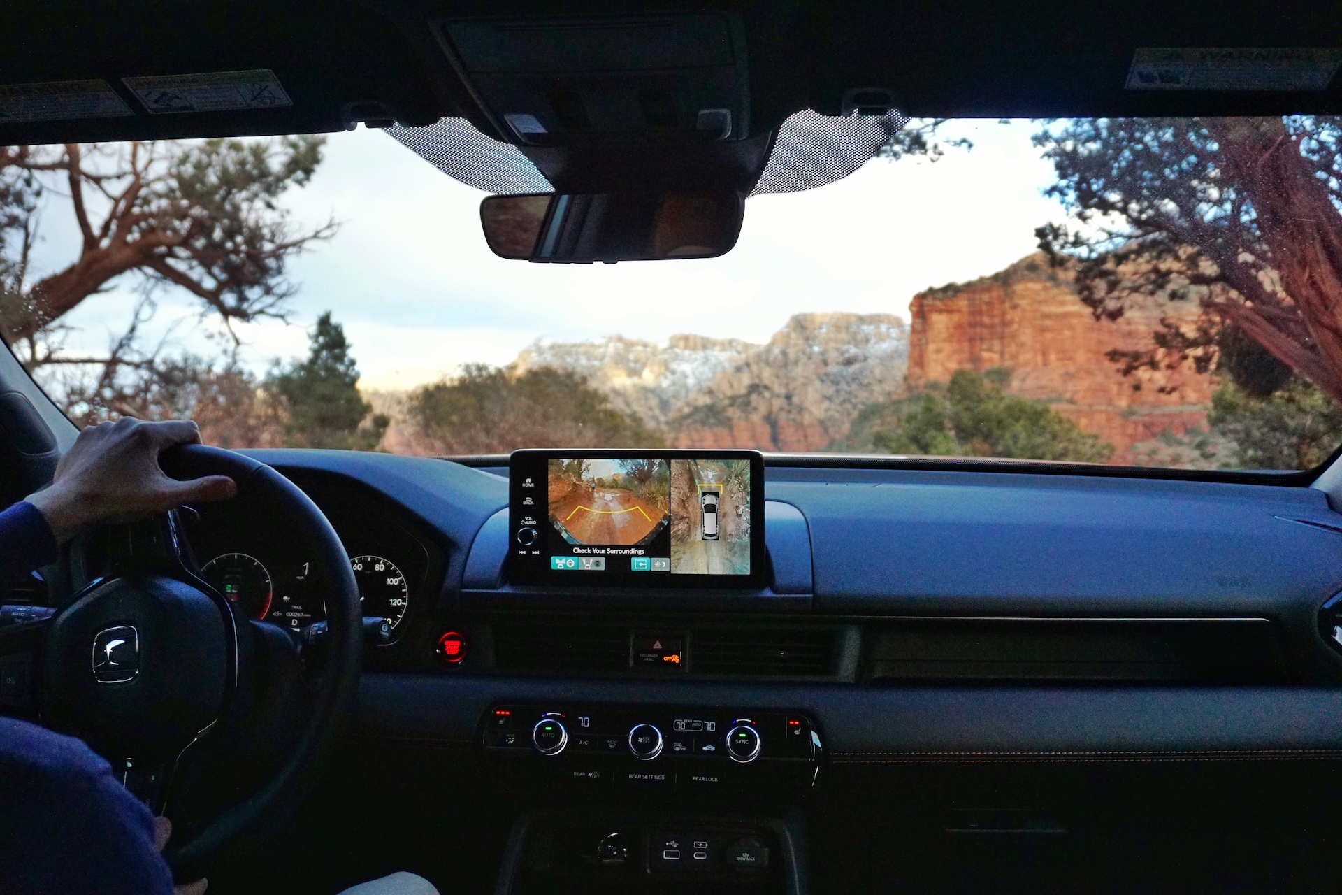 The tires chirped as they fought for traction, all while the computer sent most of the power to the rear axle—where there was the most grip. The Trailwatch system allowed me to keep an eye on the large rock in front of me to my left, something which I couldn’t see with my own eyes as the hood was pointing straight into the sky. After a bit of finagling with the wheel to find a dry spot on the slick red boulder, the tires hooked up enough to push the Pilot over the hill and onto flat ground.