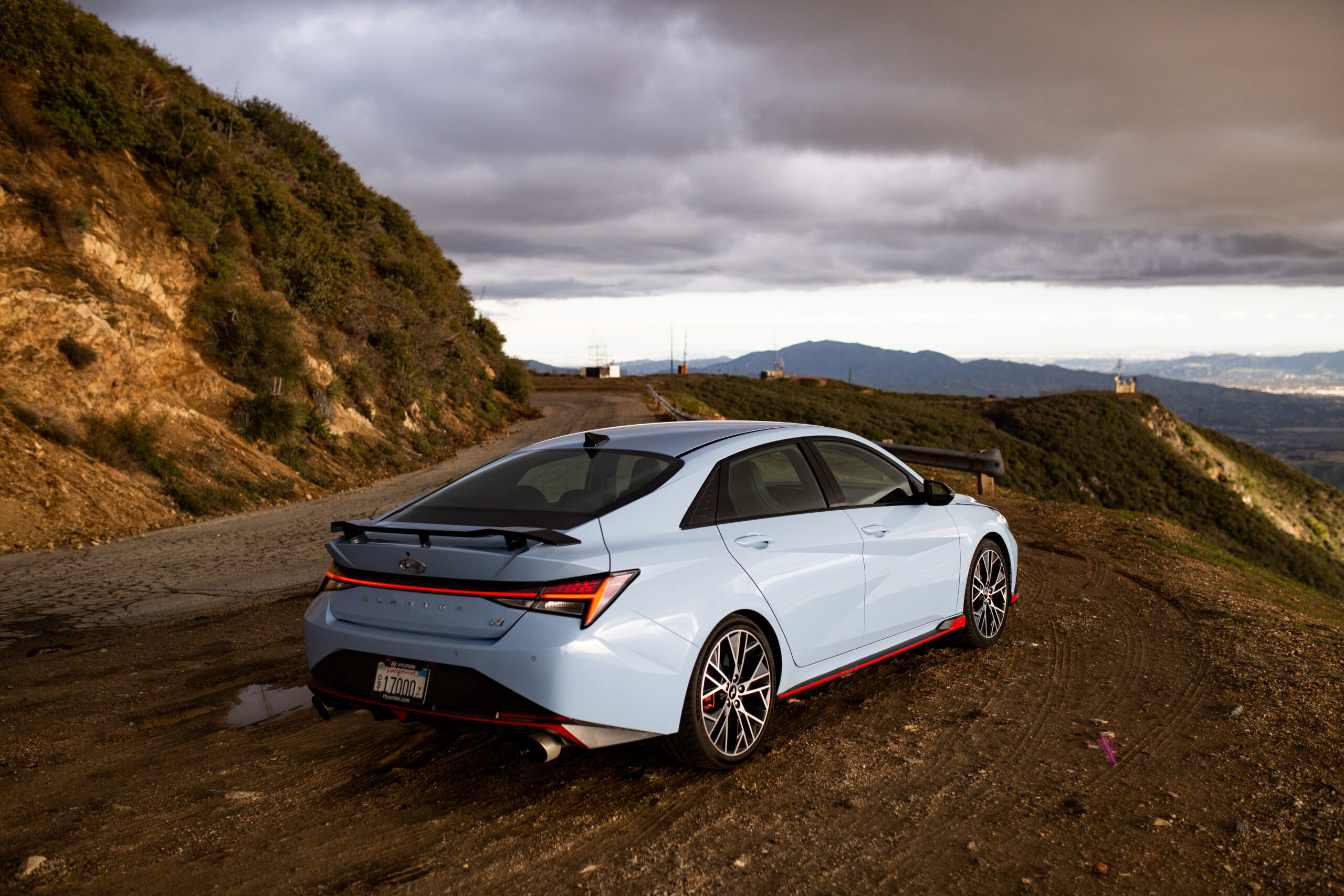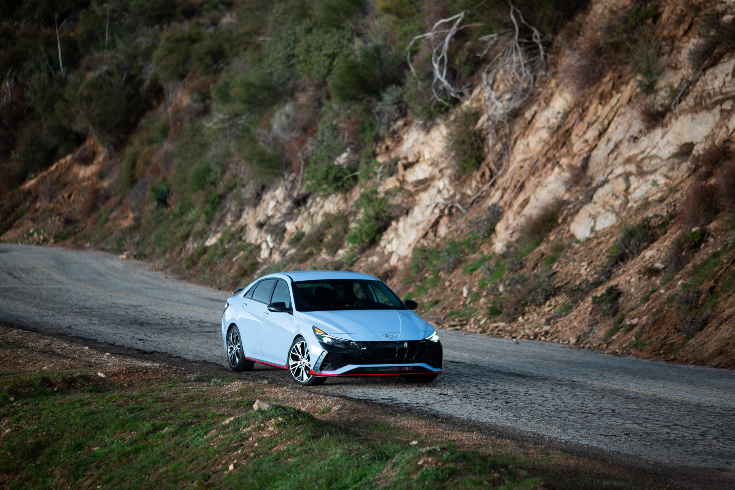 Normal mode worked beautifully on aggressively bumpy and undulating canyons, allowing the Elantra to dispatch yumps and camber changes with little drama but with a bit more communication to the coccyx. Then, the full-blown stiff damper N mode became a wonderful stream of communication, with plenty of compression damping supporting the car and allowing the road to speak through the seat while still allowing the car to breathe and work on bumpy surfaces. But the real trick was in the slight forward bias of rebound damping, allowing the rear to rise under braking, dance around benignly, and place the car squarely on the nose, letting me pivot the car on the brakes at all speeds. Not just the limit.