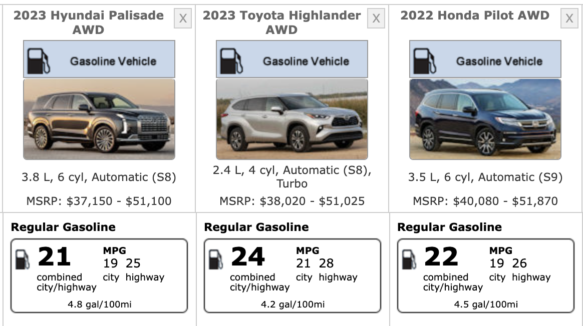 The Palisade’s fuel economy is firmly in the “okay, not great” camp. I averaged 18.1 mpg over 250 miles of mostly city driving, which slightly trails the EPA’s city rating and the car’s main competitors.