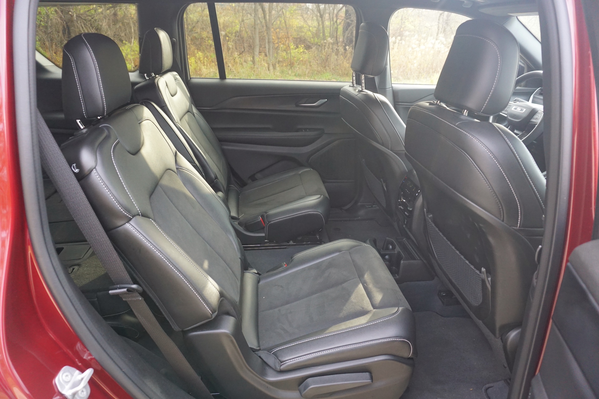 A sleek dashboard design plays well with the Jeep’s overall persona—especially my tester’s Velvet Red Pearl exterior with black wheels and black body trim—but the abundance of flimsy black plastic is quite overwhelming. Fingerprints everywhere. I can imagine that in the higher-end trims like Overland, Summit, and Summit Reserve these are replaced with leather or other nicer materials, but then again, those trims will set you back anywhere between $70,000 and $80,000.