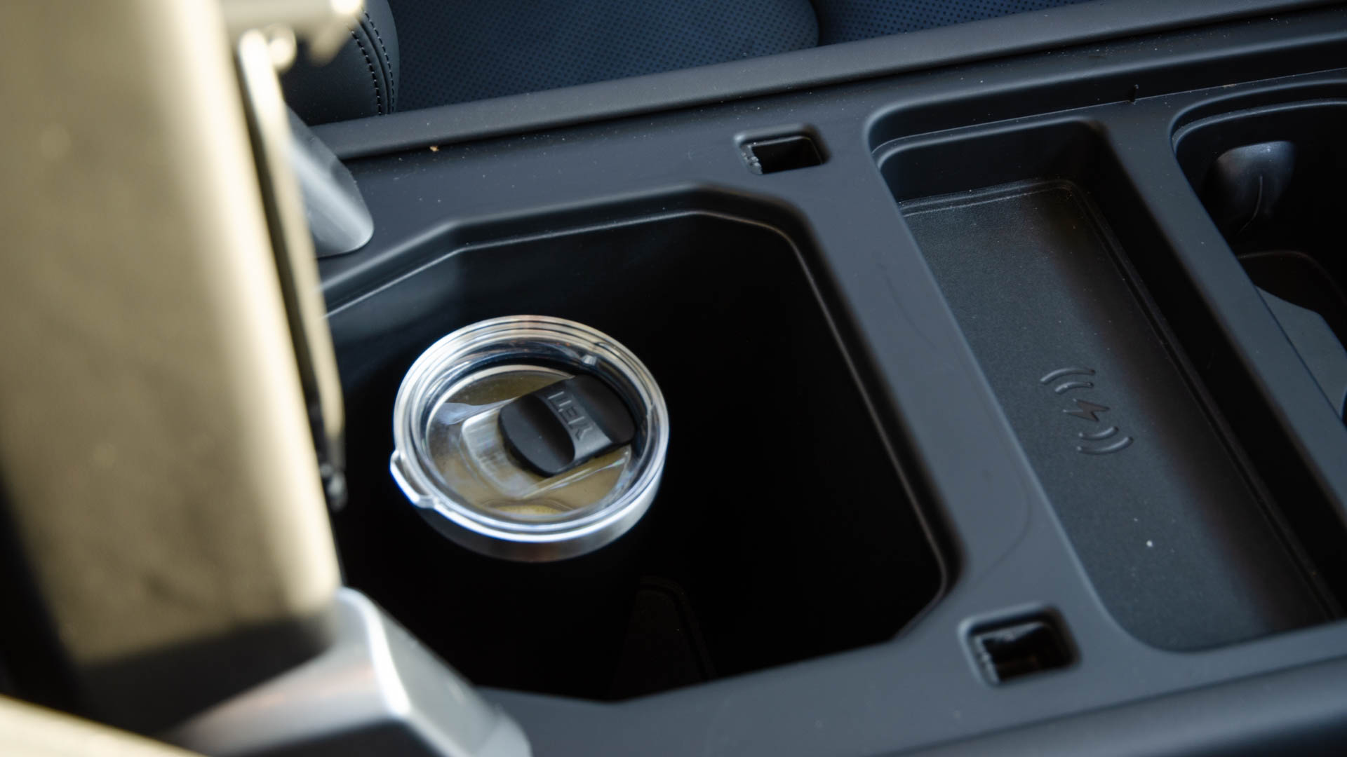 Land Rover pulls off an interesting trick inside the Defender. The cabin feels both tough and utilitarian but expensive at the same time. Most buttons and switches are big and chunky, so you can easily use them with gloves on or over rough terrain. The dash-mounted gear selector is electronic, but it feels solid and moves with a satisfying, purposeful action. Every cup holder and storage surface is coated in a high-quality-feeling rubber so nothing slides around while driving. It’s open, airy, and spacious, too, with tall upright windows that offer excellent outward visibility. Some of it can admittedly be seen as a bit kitschy—especially the endless rows of exposed torx bolts—but Land Rover pulls it off somehow.