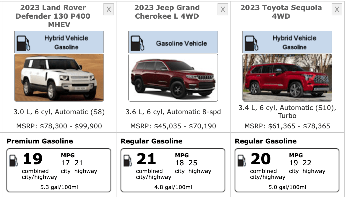 Naturally, being a 2.5-ton SUV with a twin-charged six-cylinder engine, eight seats, all-wheel drive, and a two-speed transfer case, the Defender 130 doesn’t exactly sip fuel. With an EPA-rated combined fuel economy of 19 mpg, it isn’t a gas guzzler either, though. It has a big fuel tank, at 23.8 gallons, which meant I was able to drive around 200 miles and barely use half a tank. However, it isn’t quite as fuel efficient as its aforementioned rivals.
