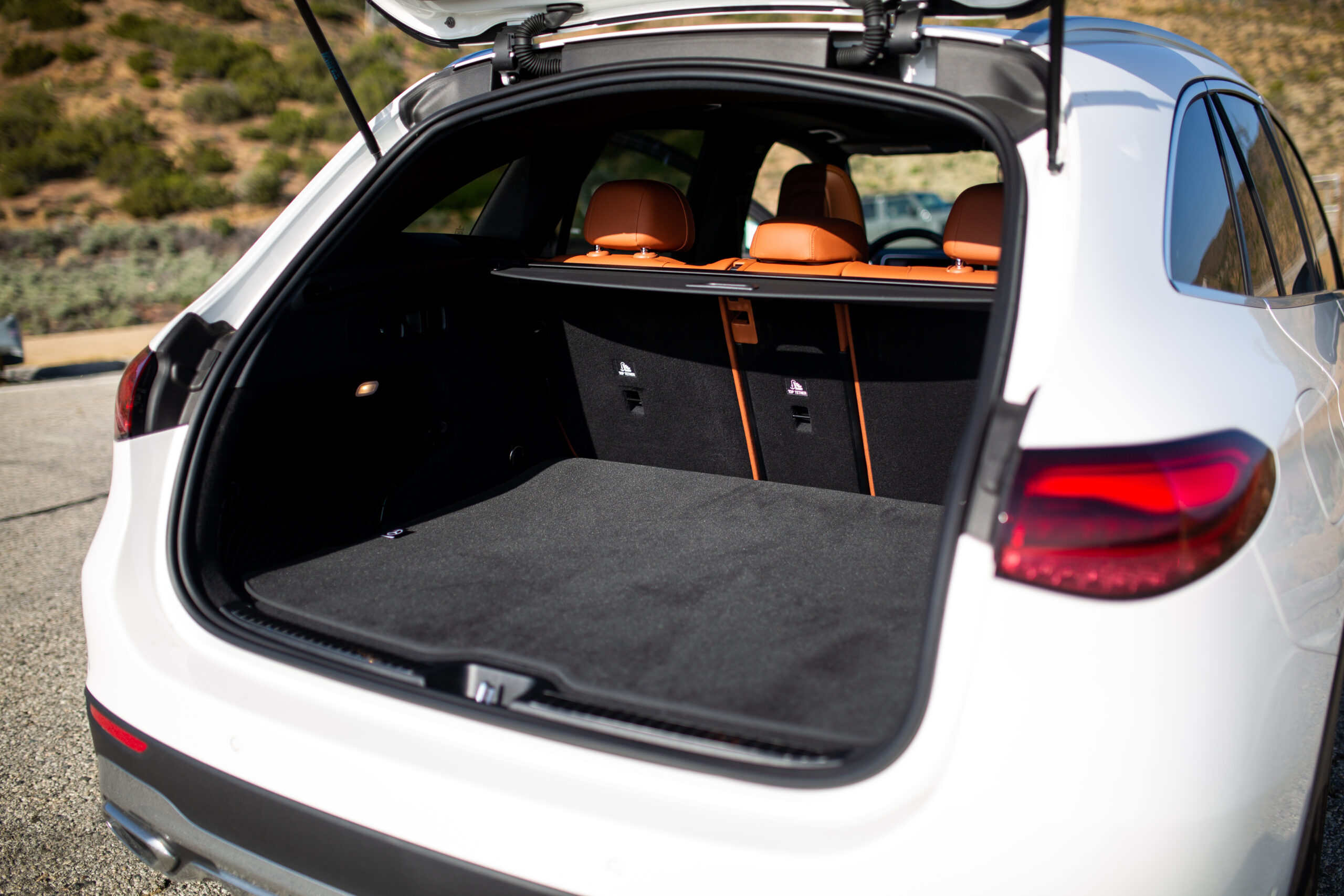 Underneath the aggressively normal sheet metal are a small array of mechanical changes from the previous GLC300. Notably, the GLC retains a spare tire, which is a shockingly rare commodity in luxury cars now. But Mercedes has put genuine effort into the unseen parts of the SUV, with a reconfigured 48-volt mild hybrid system now sandwiched within the transmission instead of running off the engine accessory drive, adaptive dampers, and a seriously impressive 0.29 coefficient of drag. Powering it all is a four-cylinder turbocharged engine with 255 horsepower and 295 lb-ft of torque.
