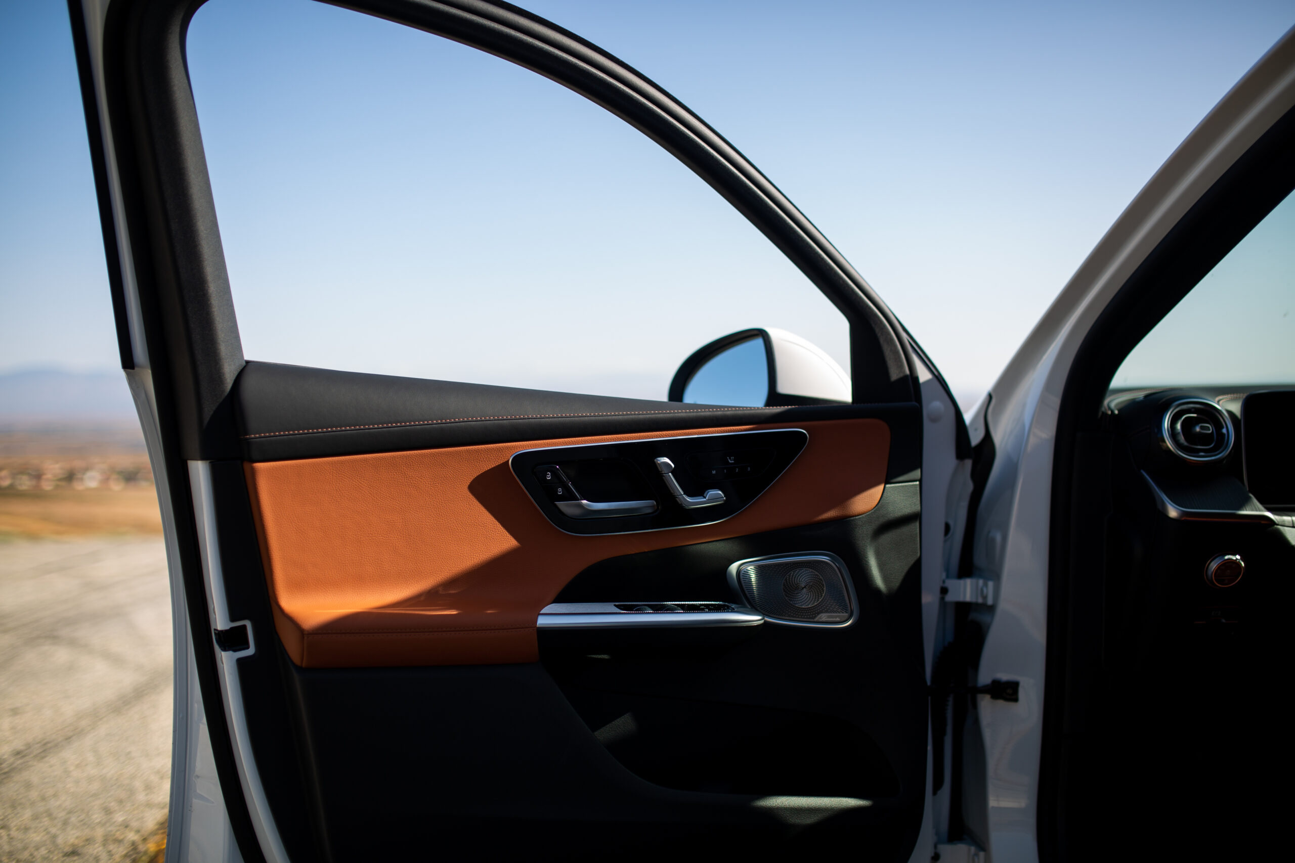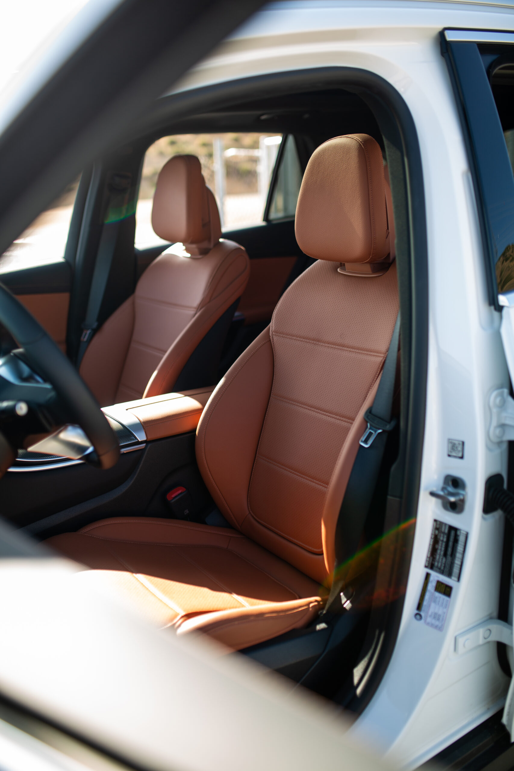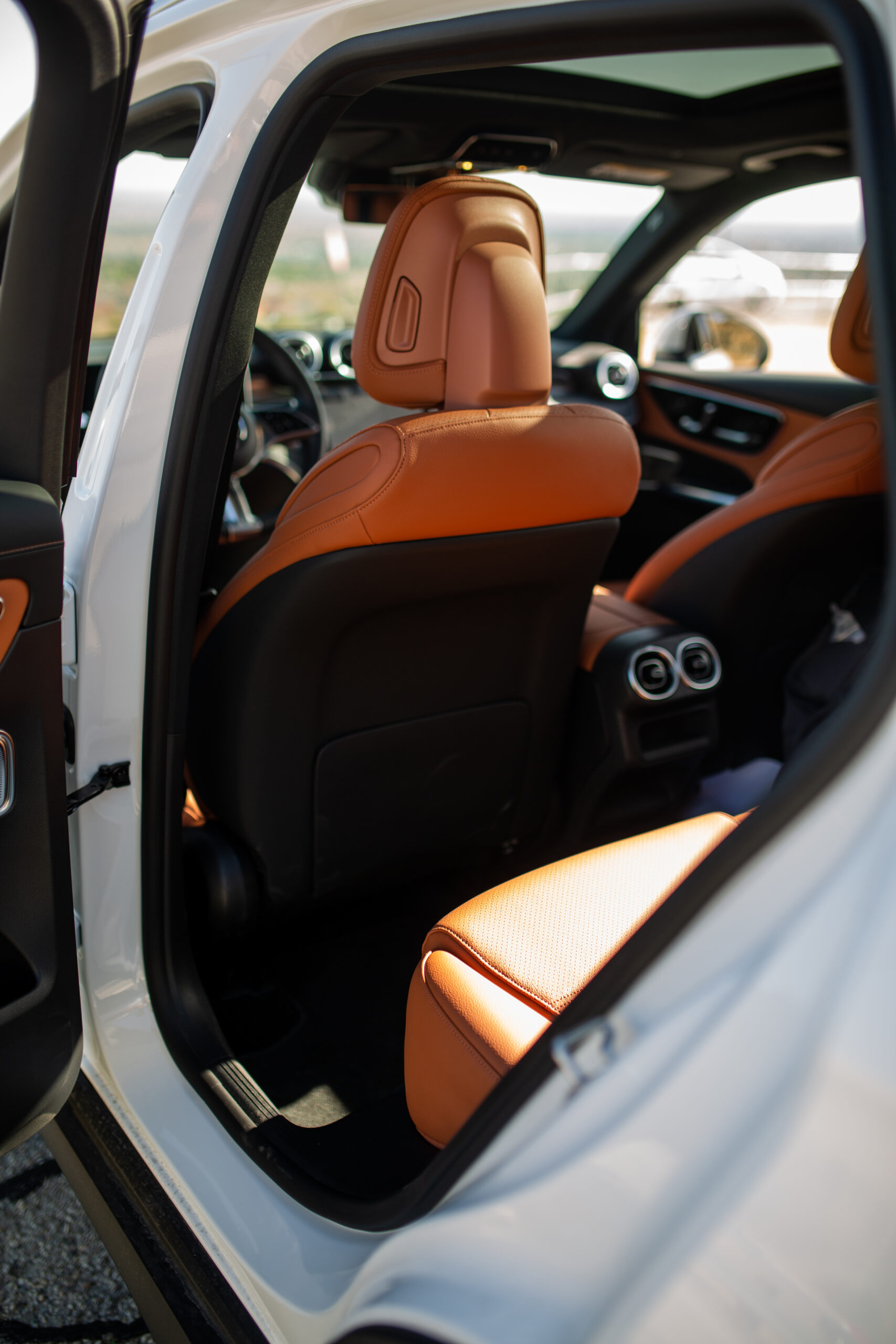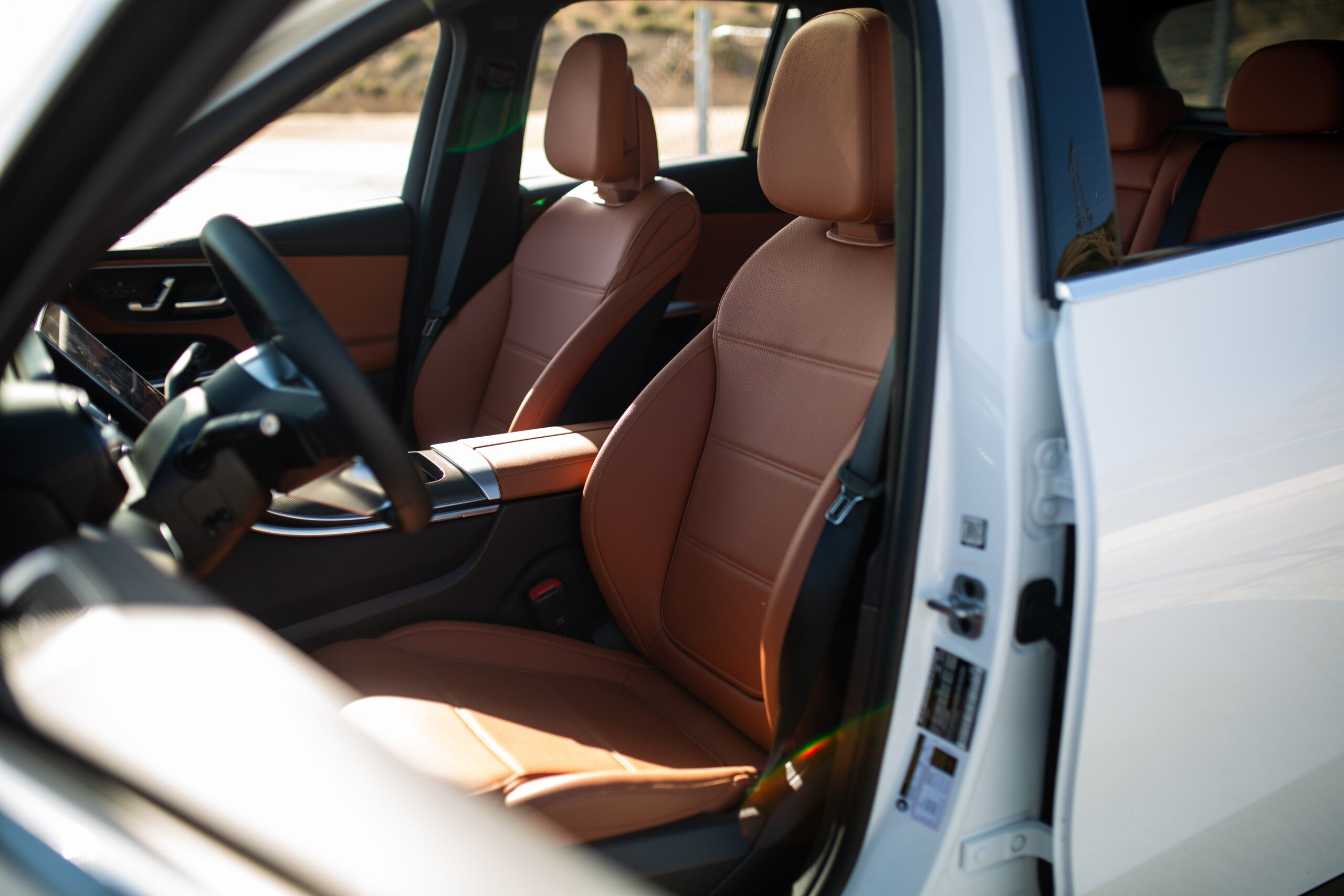 But even with the new ergonomics (which I’ll discuss in the driving segment), the inside of the new GLC looks and feels stunning. Upon closer scrutiny, some of the materials and features feel cheaper, like the turn signal stalks, the action of the cupholder door, and some general creakiness in the overhead console. Yet the huge, high-quality, high refresh rate screens dominate the cabin and are framed with excellently chosen textures and surfaces. The MB-Tex synthetic leather seats feel convincingly real and are supple with almost zero sensation of pressure points.