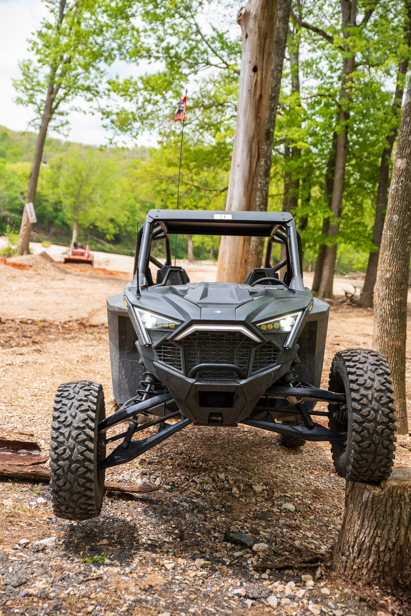 Sharp-edged exterior design elements let you know this is more than a regular RZR XP. The headlights are angrier and more angular, and the fenders are small so the 32-inch Maxxis tires have plenty of clearance. The exposed suspension components are the biggest giveaway that the RZR Pro R is something special, whether it be those super-tall coil springs out back or the thick upper and lower control arms up front.