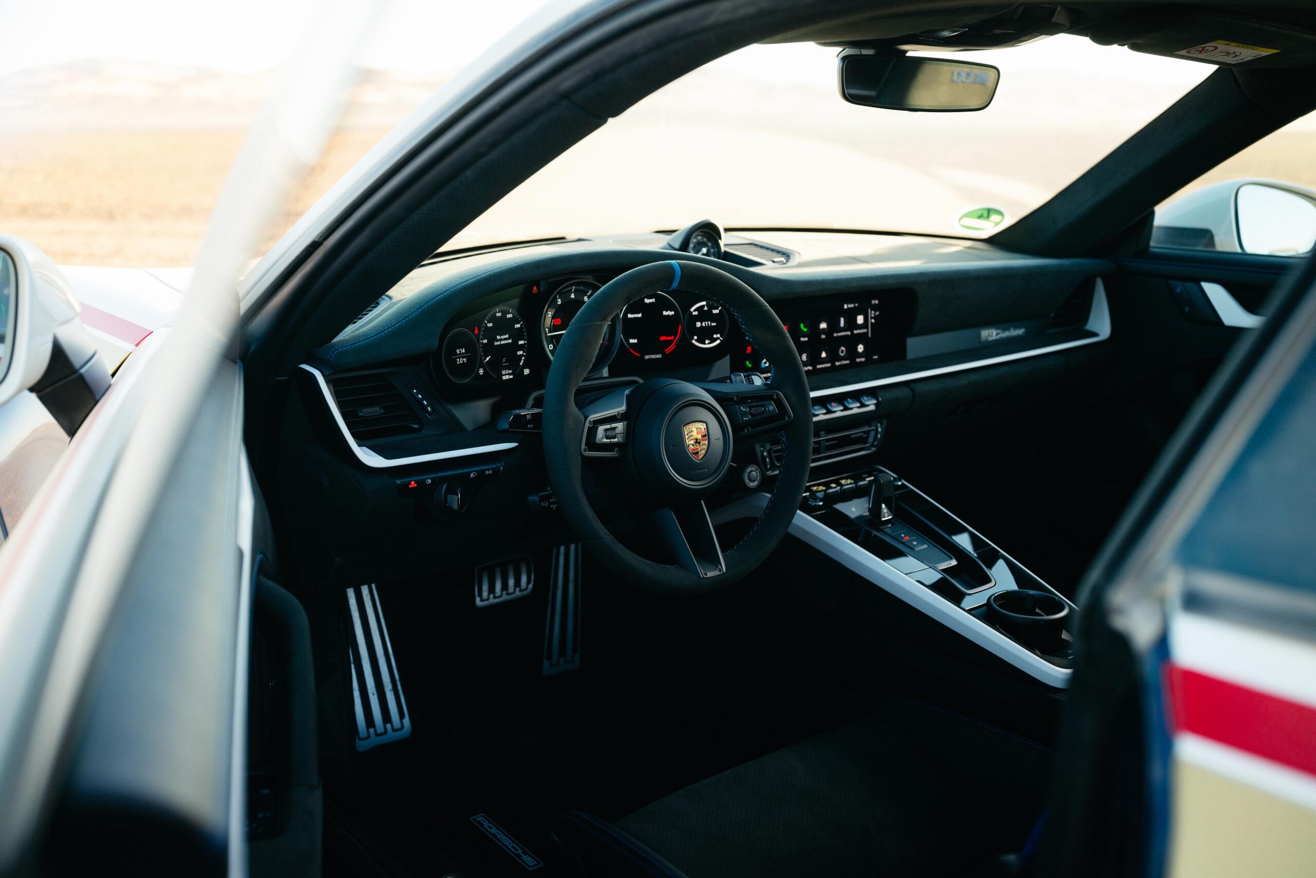 There’s a Rallye Sport Package available for buyers outside the U.S., which is how you get the bolt-in roll bar behind the front seats. However, the single-piece carbon-fiber buckets are standard no matter where you live, though Porsche will swap those out for more comfortable 18-way power-adjustable seats if you wish (and for free). Back seats, on the other hand, are a no-go no matter what, because Porsche uses the would-be mounting space to house the rear-axle hydraulic lift. Priorities, folks. Priorities.
