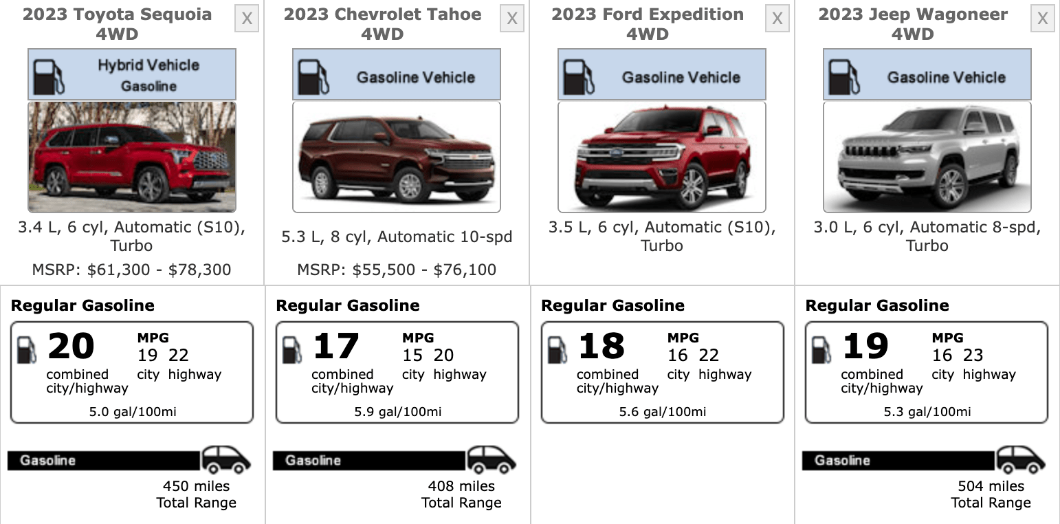 As far as competition goes, the Toyota Sequoia Capstone faces SUVs like the Chevy Tahoe High Country, GMC Yukon Denali, and the Jeep Wagoneer Series III. Looking at those three cars, the Sequoia is the only hybrid, which is the biggest difference between them. Aside from that, they’re all priced in the neighborhood of $75,000, they all come with optional four-wheel drive, and all have third rows. The Sequoia handily takes the power output crown, however, as the Chevy and GMC max out at 420 hp with the non-L Wagoneer mustering 392 hp.