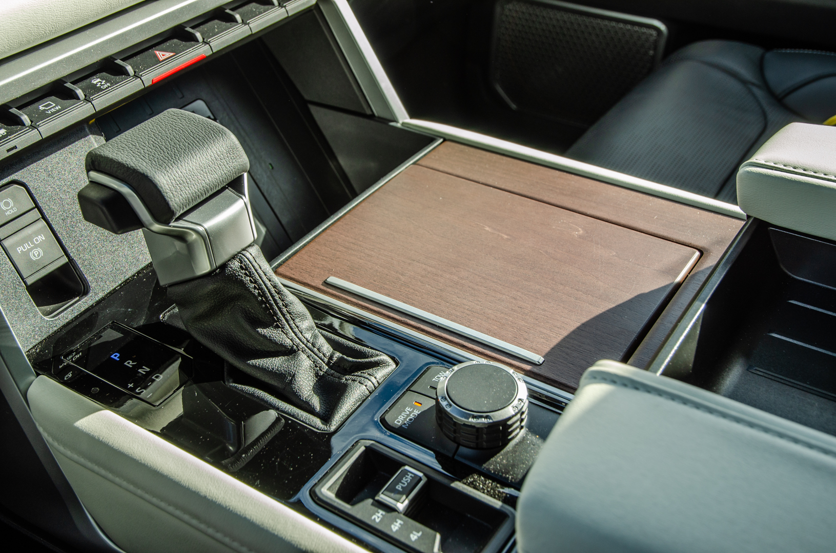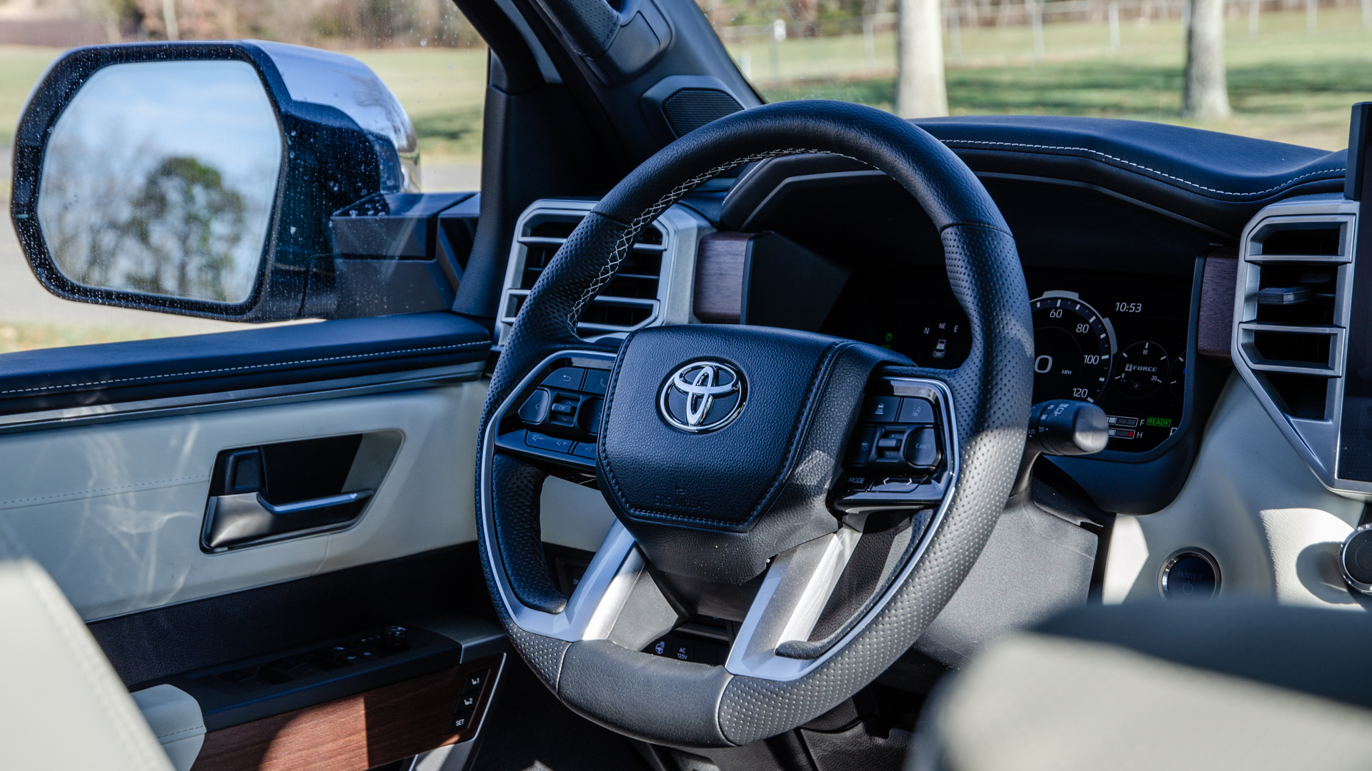 On the inside, the Sequoia Capstone is an interesting mix of rugged and luxurious. All of the touch points—the steering wheel, shift lever, and dashboard buttons—are chunky and durable. You can tell Toyota intended for all of the switches and buttons to be used on the move or with thick gloves on, because everything’s well laid out and easy to learn, and every button is enormous. I especially liked the surround-view camera button, which is just above the shift lever and, like every other button, clearly labeled. So when you’re either pulling into a tight parking spot or trying to navigate through rocky terrain, you can quickly pull up the car’s cameras to guide you. In that scenario, there’s no fussing through menus or touchscreens, just a single button push and every angle of the Sequoia is visible on the massive new touchscreen.