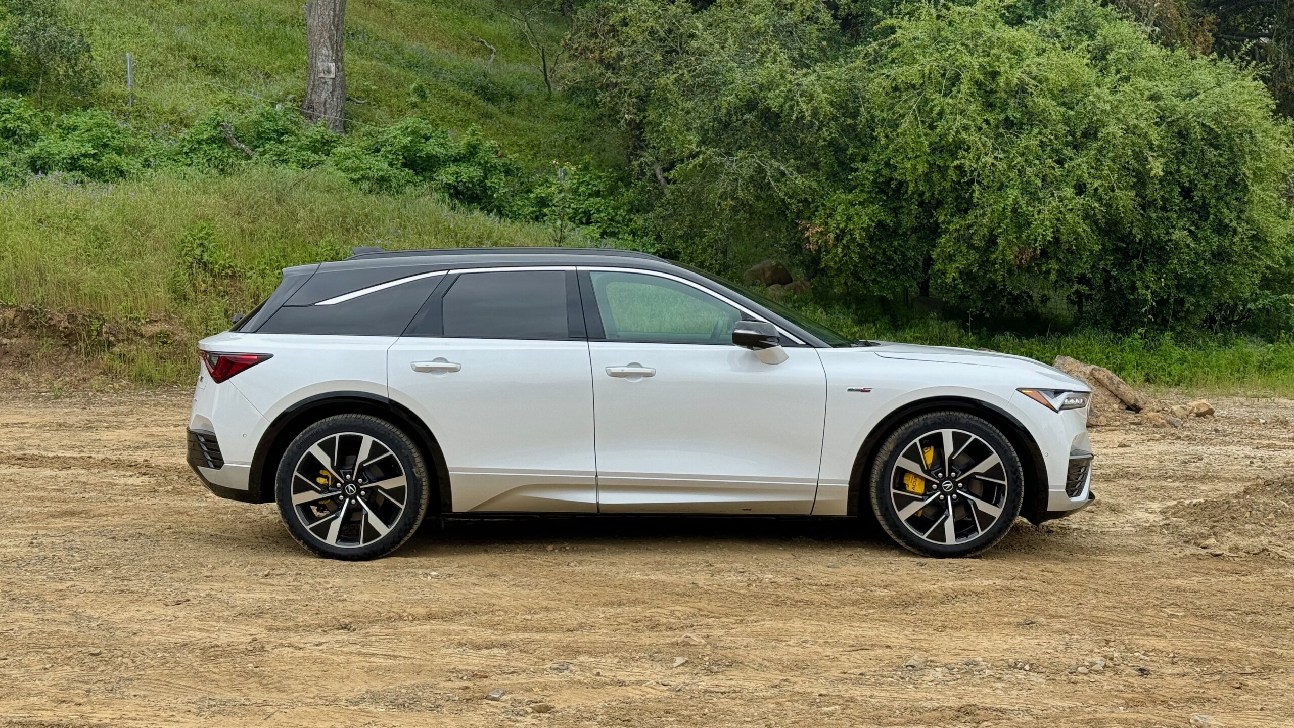 The Acura is also mostly a pleasure to drive, starting with the powertrain. Going into this, I expected overpowered excess. The ZDX is rated at 499 horsepower and 544 lb-ft of torque. This might sound like a lot, but weighing in at a claimed 6,052 pounds, the power feels appropriate and delivery is smooth and predictable. Maybe finding that one stray pony just to satisfy my OCD would have been way too much. Regen braking strength is selectable via the drive mode settings or on the fly with a steering wheel paddle. You can dial in anything from zero regen to near-full panic stop, and I spent a lot of time one-pedal driving. Regular brakes are present since hiding behind the 22-inch wheels are 15.3-inch front brake rotors that the bright yellow six-piston calipers will hardly ever squeeze. I tried them, and they work, but they seem more decorative than anything.