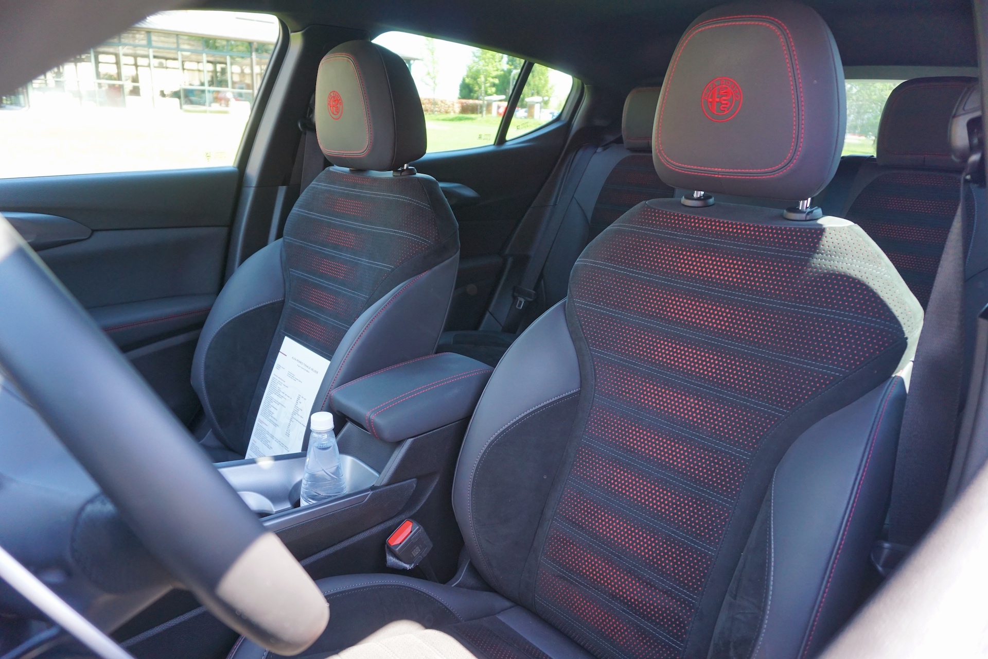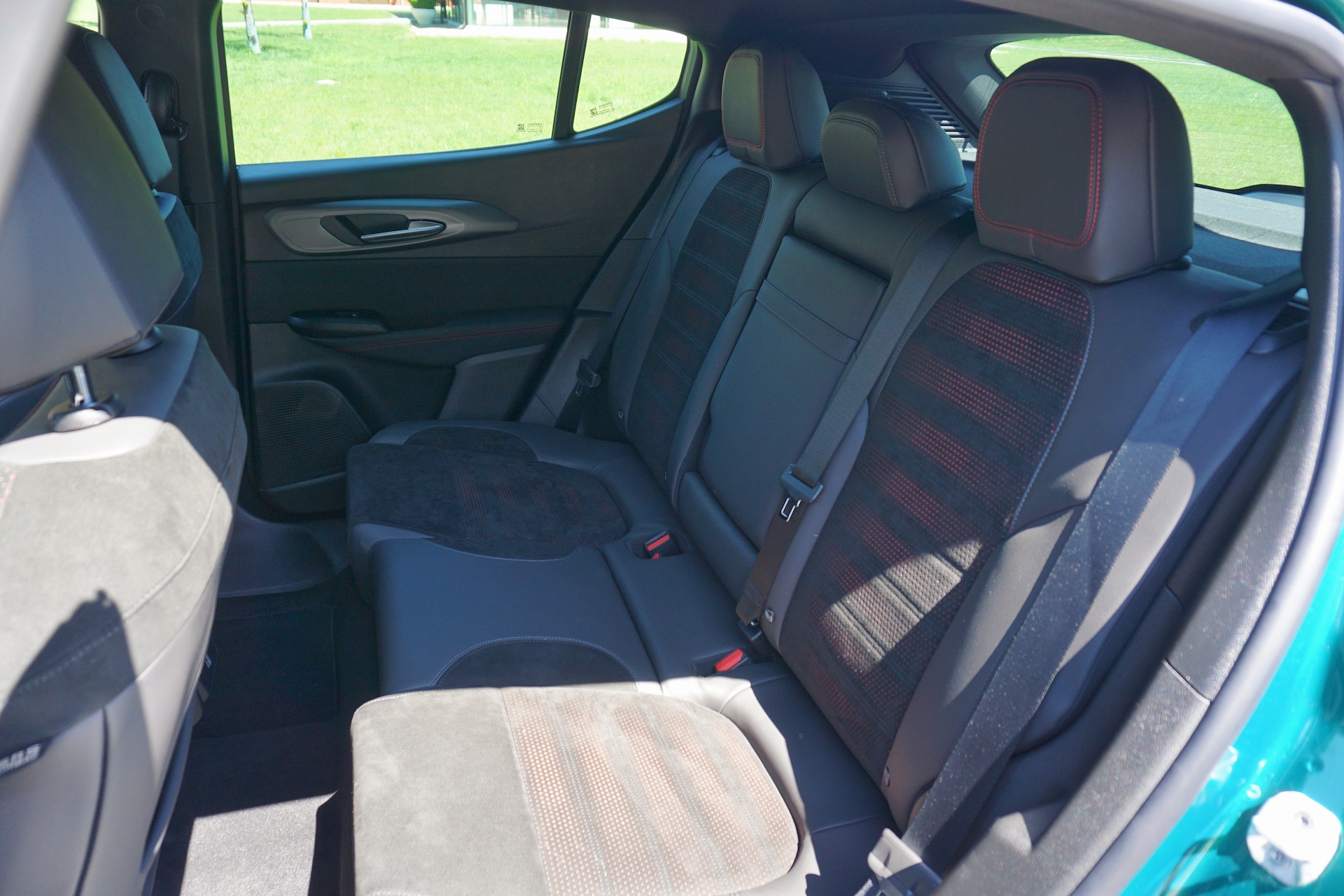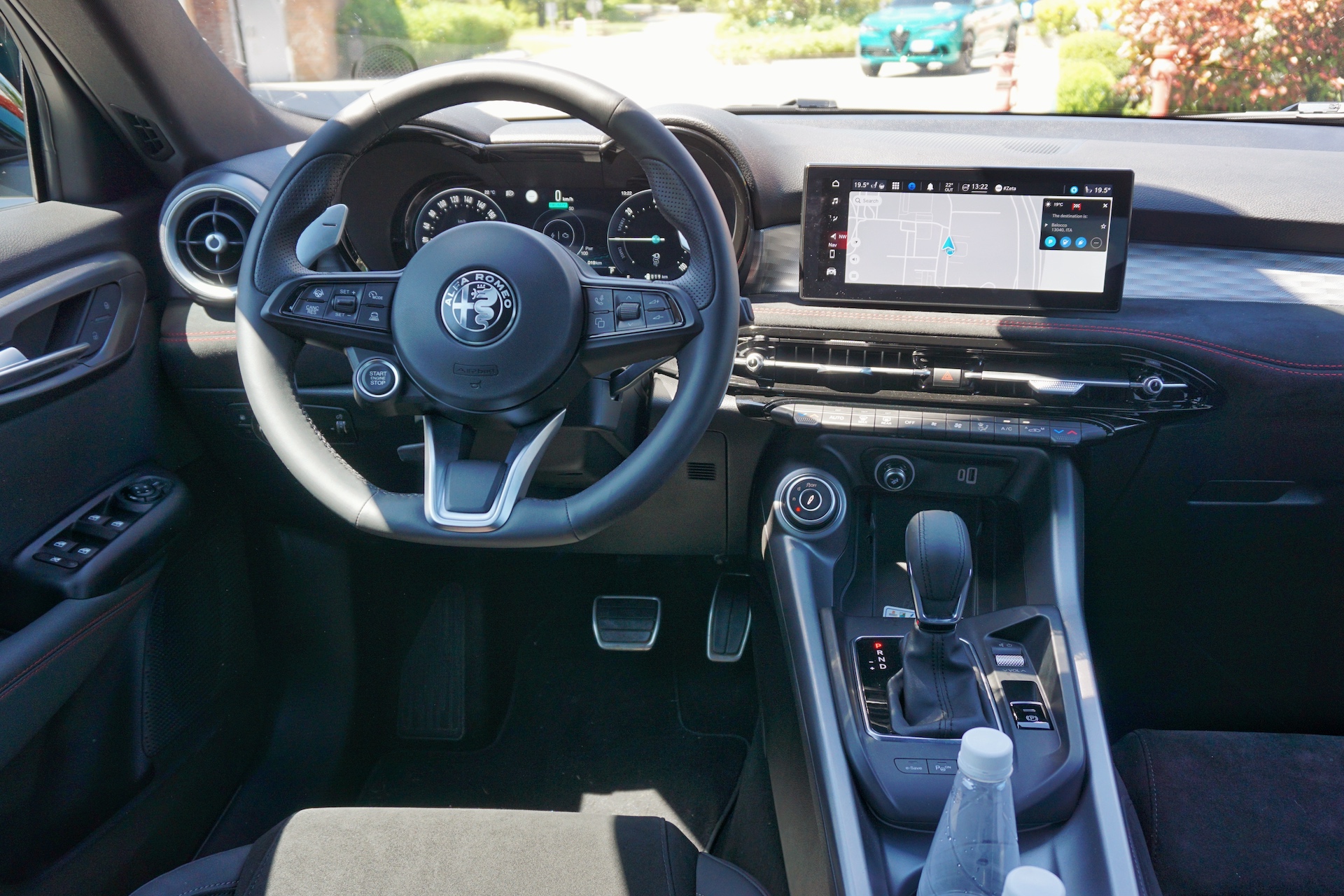The cabin has a sleek and modern look and feel to it. The new 10.25-inch, horizontally positioned infotainment touchscreen is all new, as is its Uconnect 5 operating system. The 12.3-inch digital gauge cluster is very nice and displays sharp, vivid colors through various cool graphics. Only one interior color is offered, but Alfa does enough with seat and dash accents and mood lighting to make up for it. Despite most of the car’s features being operated via the touchscreen, Alfa retained hard buttons for all HVAC functions, as well as audio volume and driving modes. The steering wheel is the same unit shared with the rest of Alfa’s models, meaning it’s pretty great, retaining that wheel-mounted engine-start button. On the other hand, some of the secondary buttons that aren’t always in plain view (mostly around the shifter and in the door cards) look and feel quite cheap. However, given the Tonale’s starting price, it’s clear that designers prioritized the more premium materials for more important areas of the car.