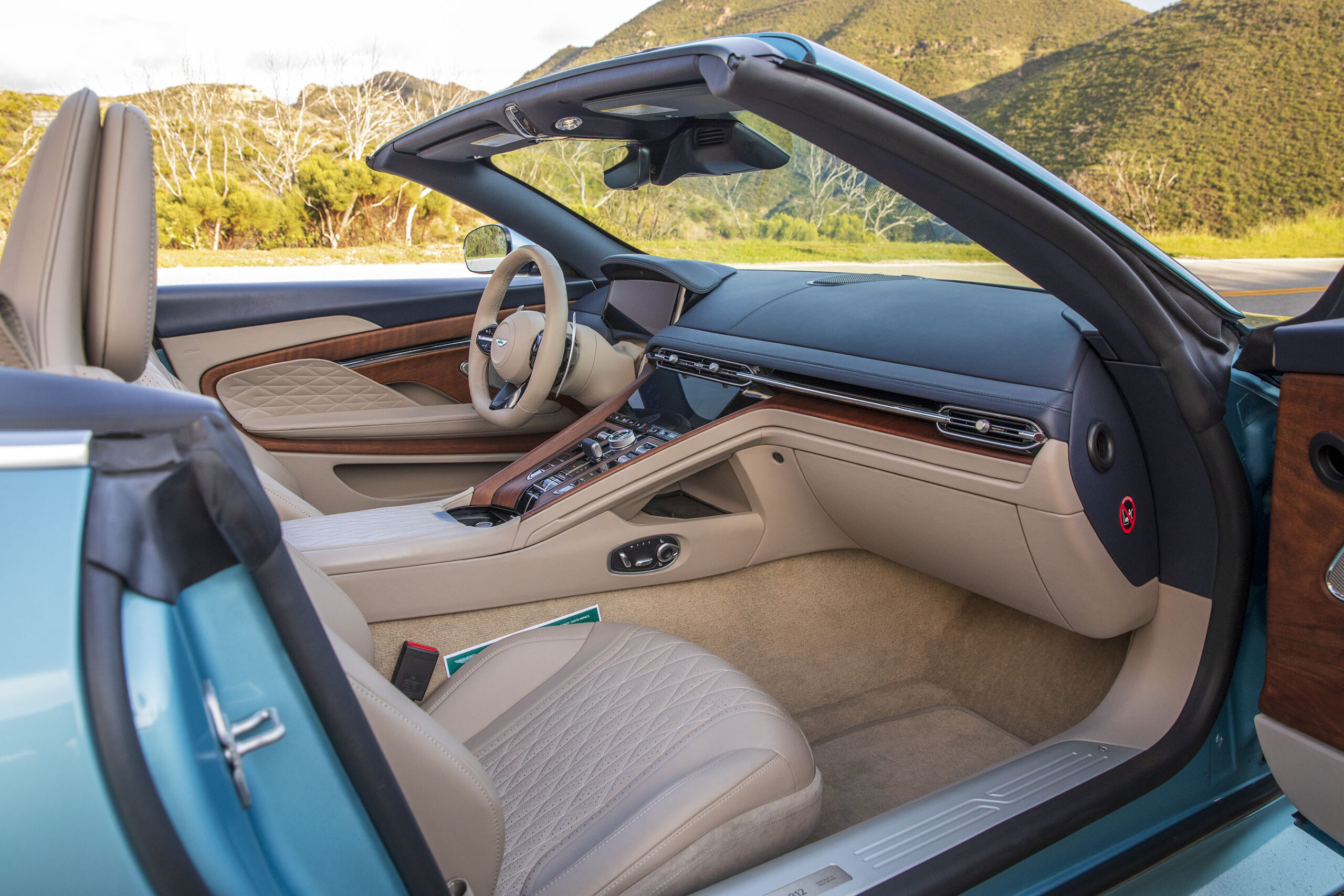 I didn’t do that very often, to be honest. Unlike some DBs of the past, this one really loves to be hustled through the canyons. Even in tight, technical sections where hefty grand tourers don’t typically shine, the DB12 Volante continually impressed thanks to vast mechanical grip, quick steering, and super sticky Michelin Pilot Sport S 5 summer tires. The optional carbon ceramic brakes provided excellent, consistent stopping power as well, though they do get a bit noisy when you’re really working them out. Combine this with flat high-speed cornering and properly aggressive transmission programming in Sport+ mode and you can start to understand why my first question to Aston reps after my drive was whether or not sport seats are available. (Yes, there is indeed a carbon bucket on the DB12 Volante’s options sheet.)