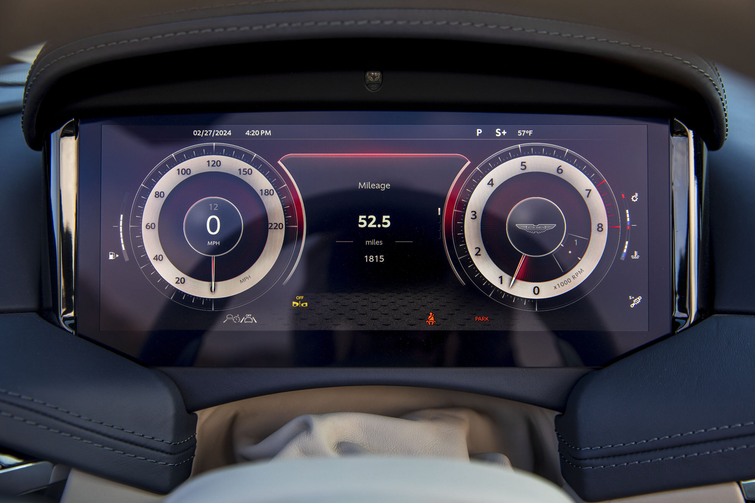 Credit goes in part to the DB12’s revamped chassis, a bonded aluminum structure that benefits from torsional stiffness improvements as well as a new, non-isolated steering column, the latter of which was implemented to improve feel both on and off-center. But the real MVP, I suspect, are the new adaptive dampers, which boast significantly more dynamic range than their predecessors. That dynamic range allows the dampers to deliver more compliance in their softest setting and more stiffness at the sporty end of the spectrum. That added flexibility allows the suspension to provide more of whatever the situation demands without resulting in ride quality that feels too wallowy nor overly harsh in its default state. Aston says that minor rear damper programming and spring rate tweaks constitute the core differences in chassis tuning between the DB12 Volante and the coupe.